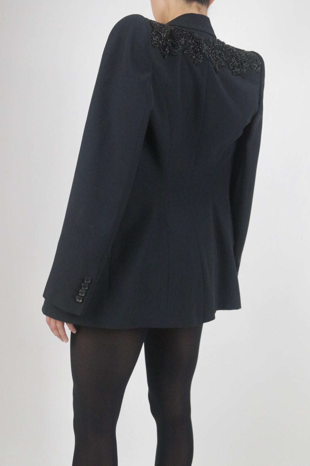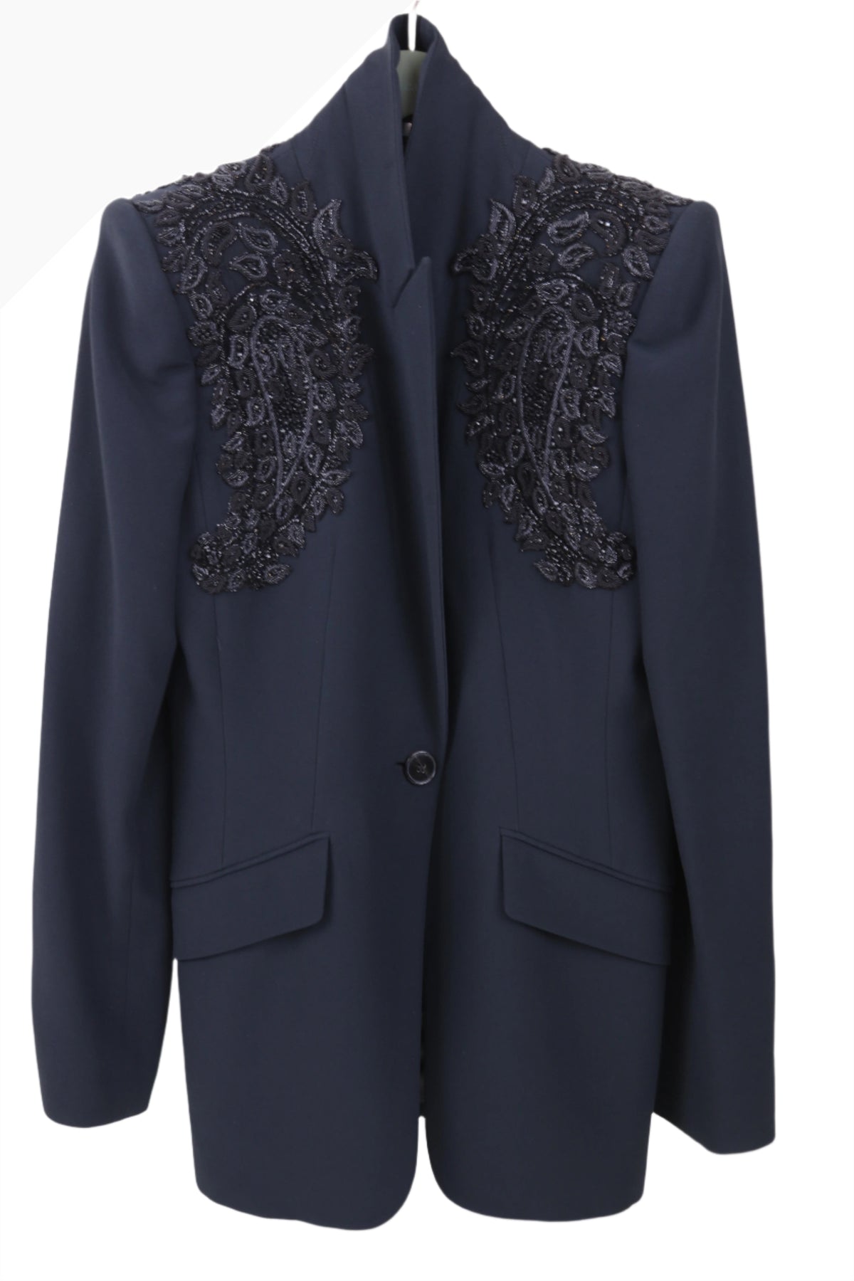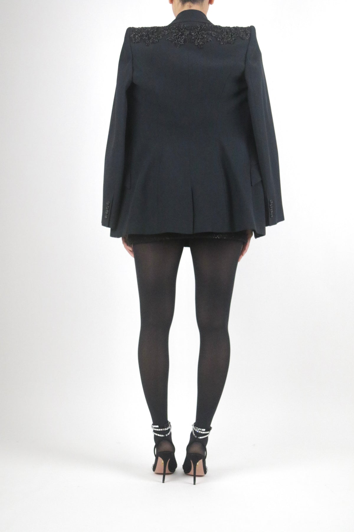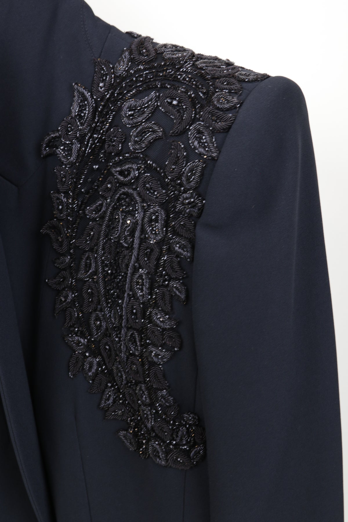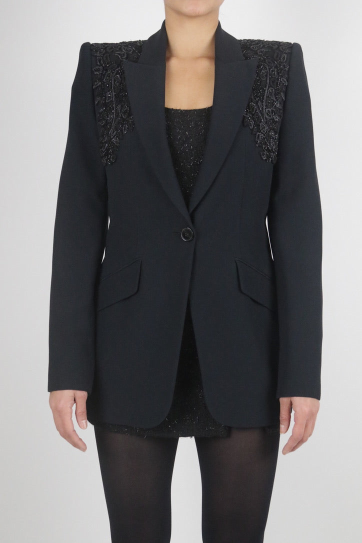 The strong shoulders and precise tailoring create McQueen’s signature power look, while the intricate black beaded embroidery along the lapels and shoulders adds a touch of ornate craftsmanship. Designed with a single-button closure, peak lapels, and front flap pockets, this piece is perfect for formal events, eveningwear, or high-fashion workwear.