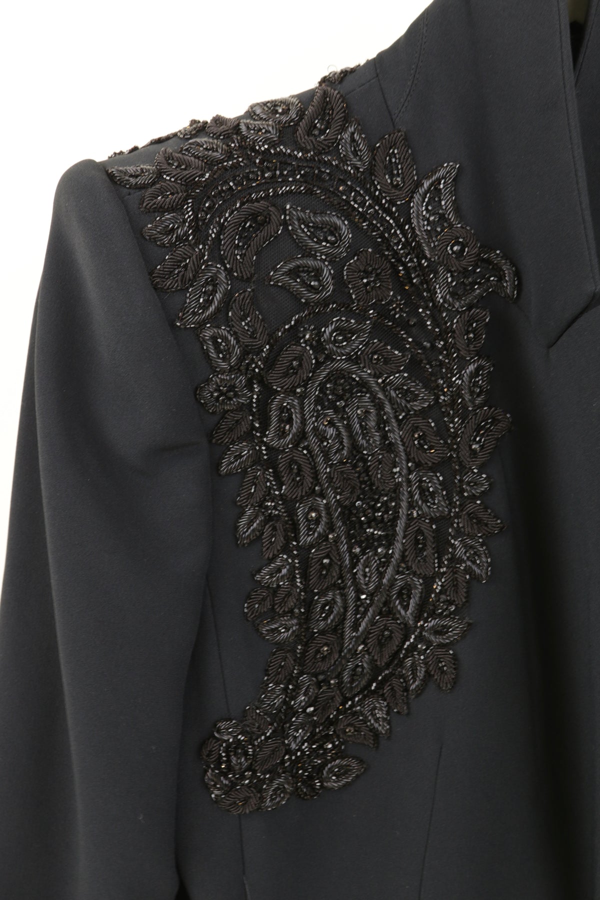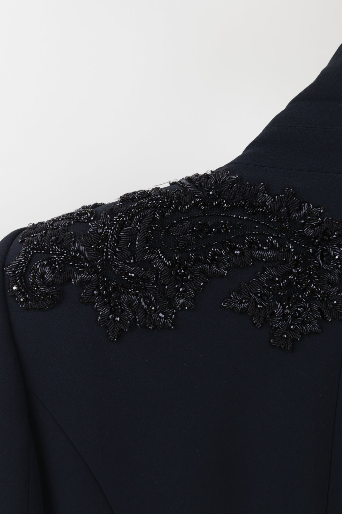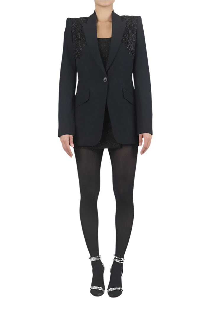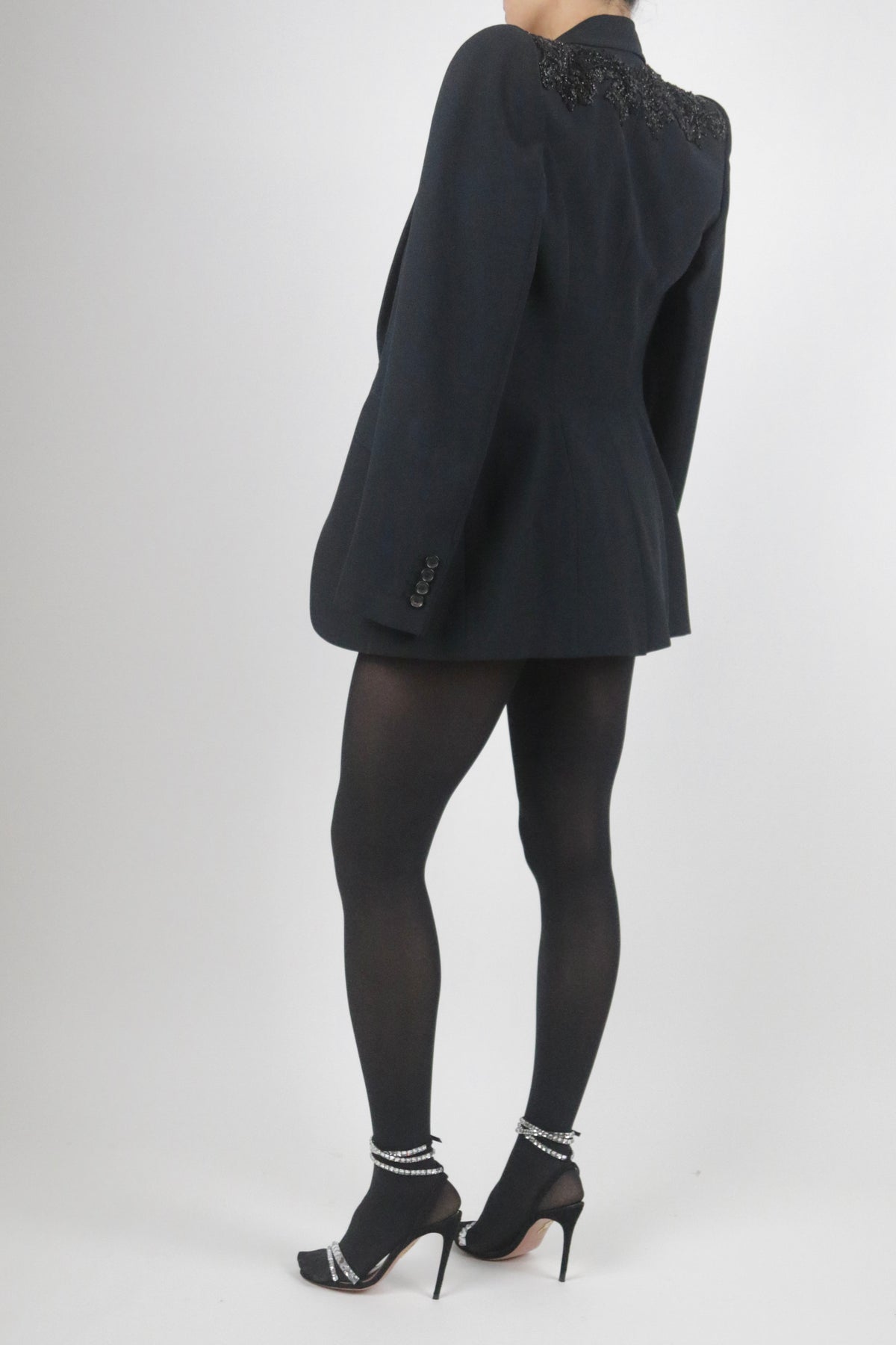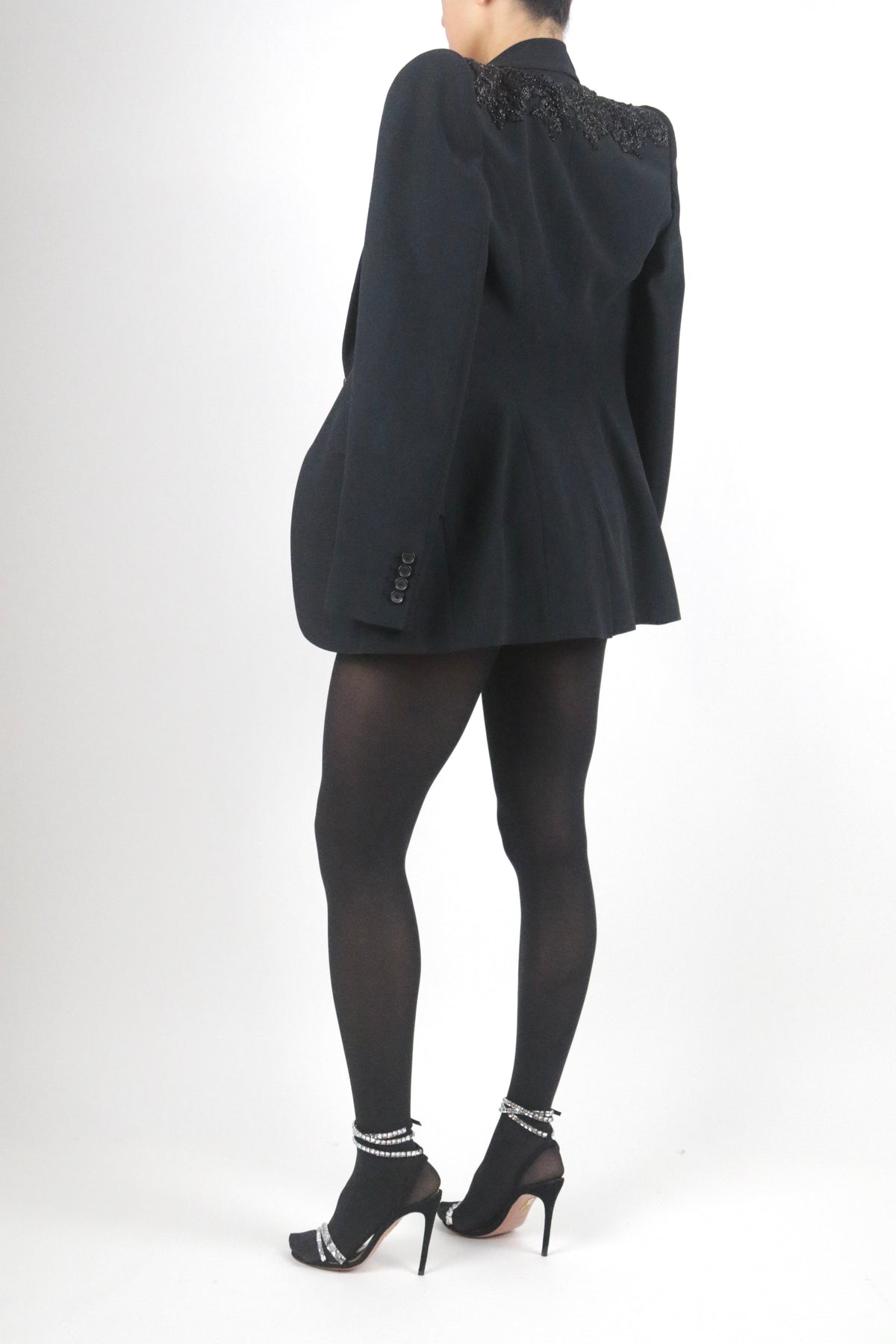 The strong shoulders and precise tailoring create McQueen’s signature power look, while the intricate black beaded embroidery along the lapels and shoulders adds a touch of ornate craftsmanship. Designed with a single-button closure, peak lapels, and front flap pockets, this piece is perfect for formal events, eveningwear, or high-fashion workwear.