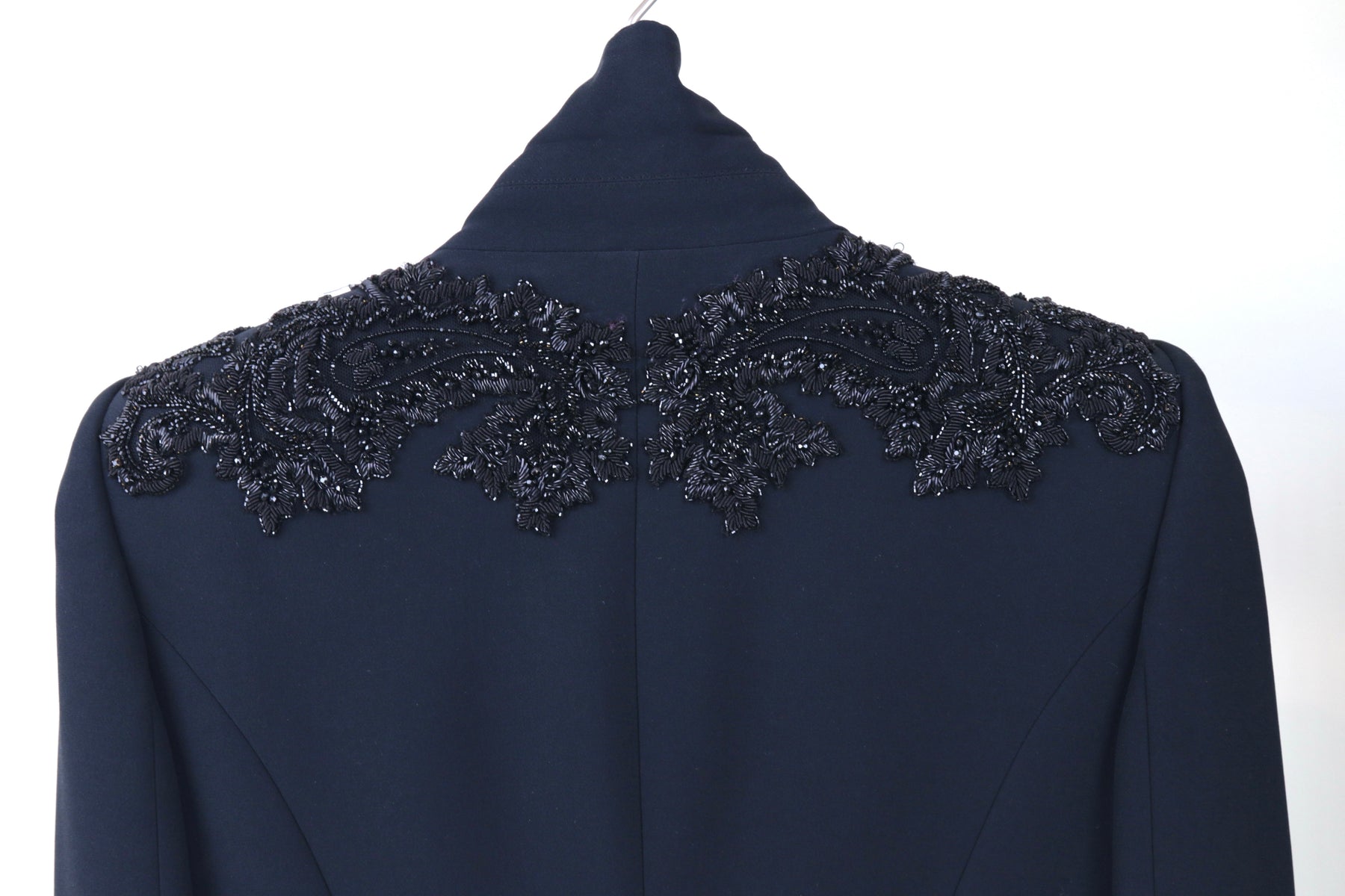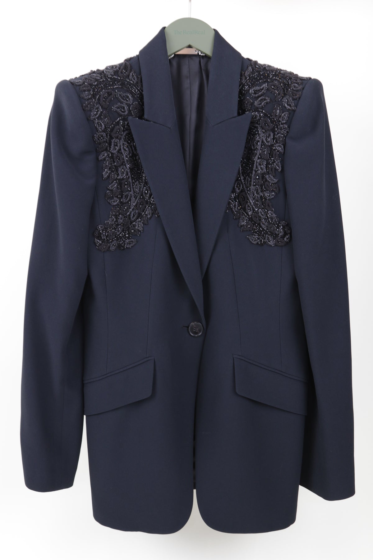 Step into effortless sophistication with this Alexander McQueen Embellished Navy Blazer, a stunning fusion of sharp tailoring and intricate detailing. Crafted from a luxurious viscose and acetate blend, this blazer offers a sleek, structured silhouette with a subtle sheen, elevating its timeless elegance.