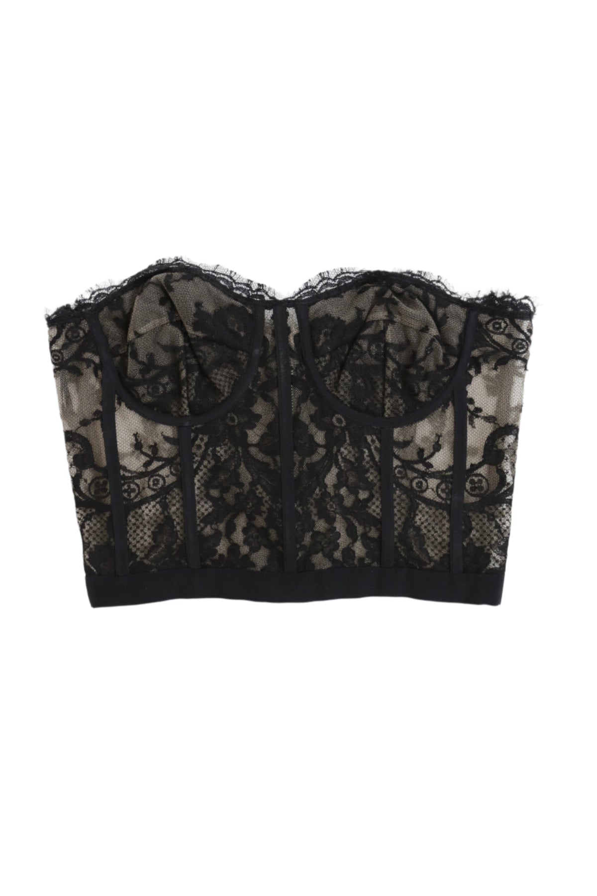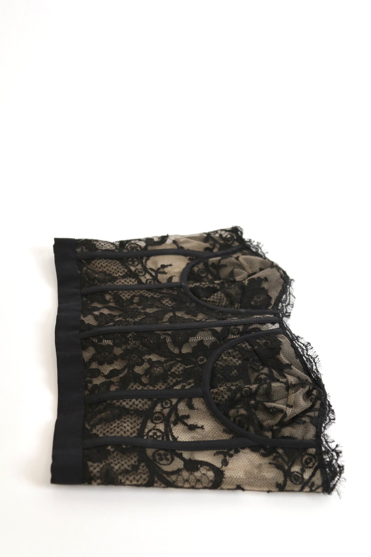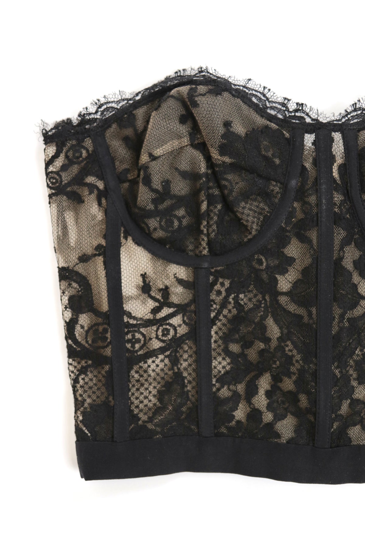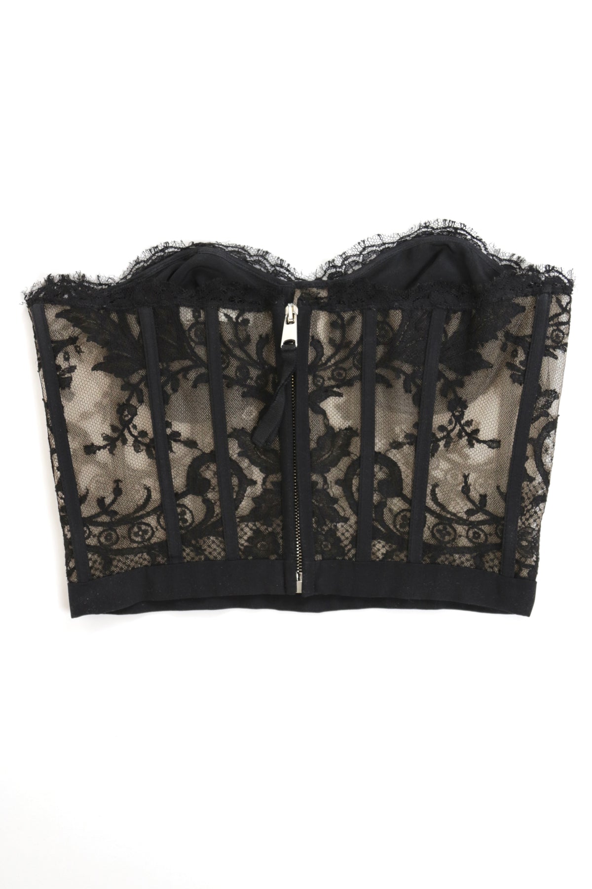 Alexander McQueen black lace bustier is a striking fusion of gothic romance and architectural precision, embodying the house’s signature balance of sensuality and strength. Crafted from delicate sheer lace, it features an intricate floral pattern overlaying a structured, boned bodice that sculpts and supports the silhouette. The strapless design exudes effortless allure, making it a statement piece that seamlessly transitions from eveningwear to high-fashion layering. Whether styled under a tailored blazer for a refined contrast or worn alone with sleek trousers, this piece is a testament to uncompromising craftsmanship and bold femininity.