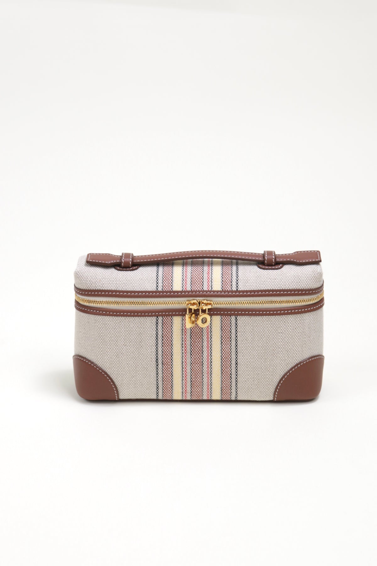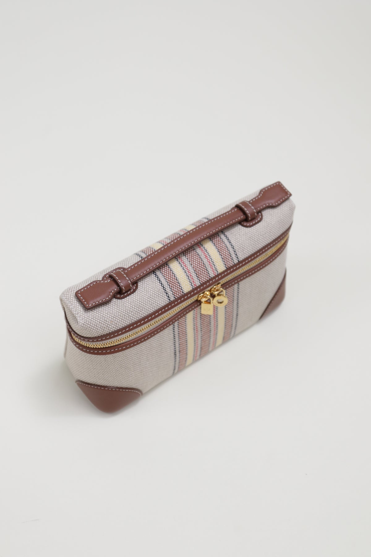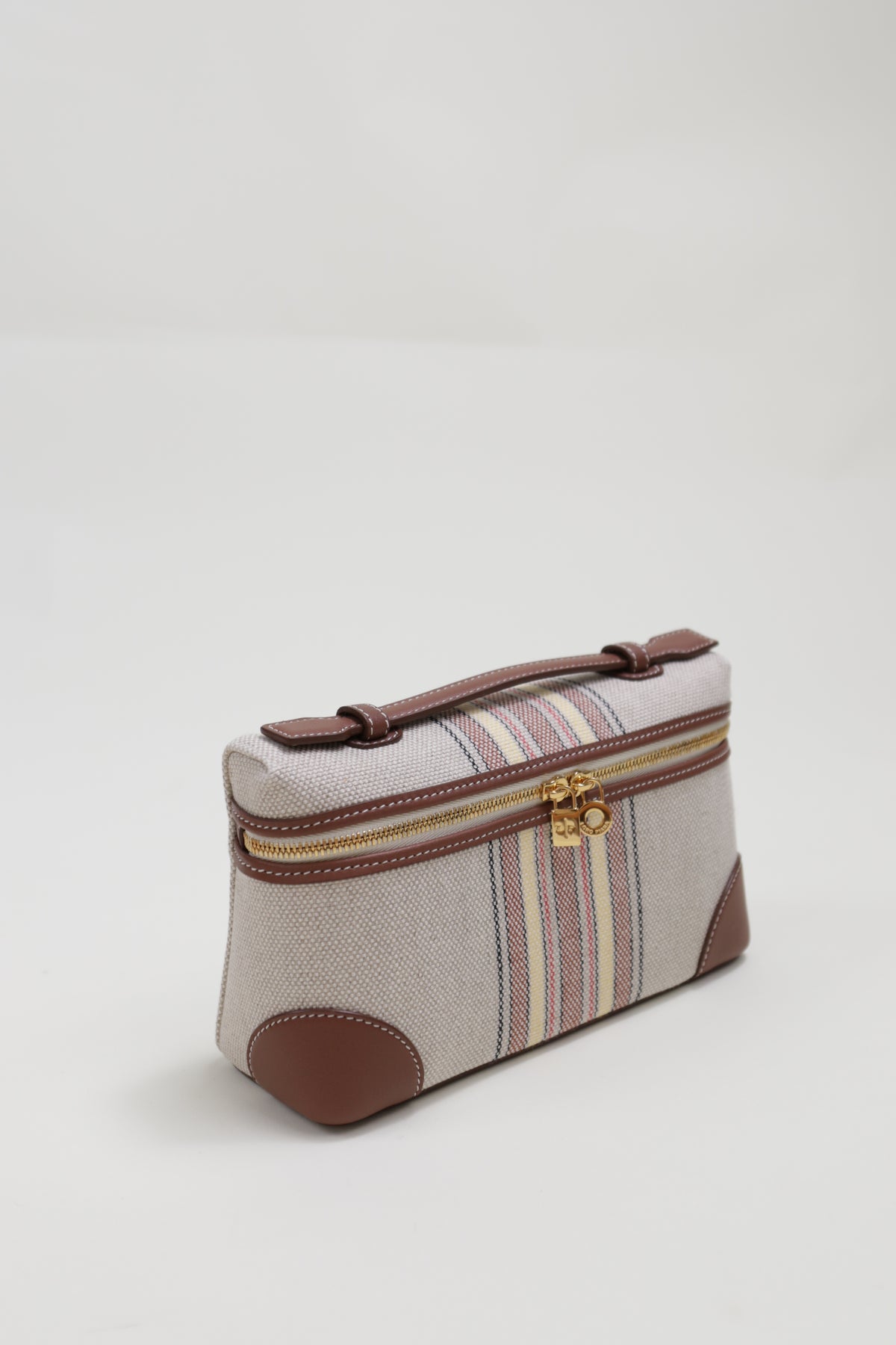 In striped canvas and exclusive calfskin, this bag embodies the sophistication of Loro Piana luggage with its leather-covered corners. Its adjustable and detachable strap offers versatility, whether used as a standalone mini-bag or tucked inside a larger one. Designed with practicality and style in mind, it's a versatile accessory for any setting and a thoughtful gift choice.