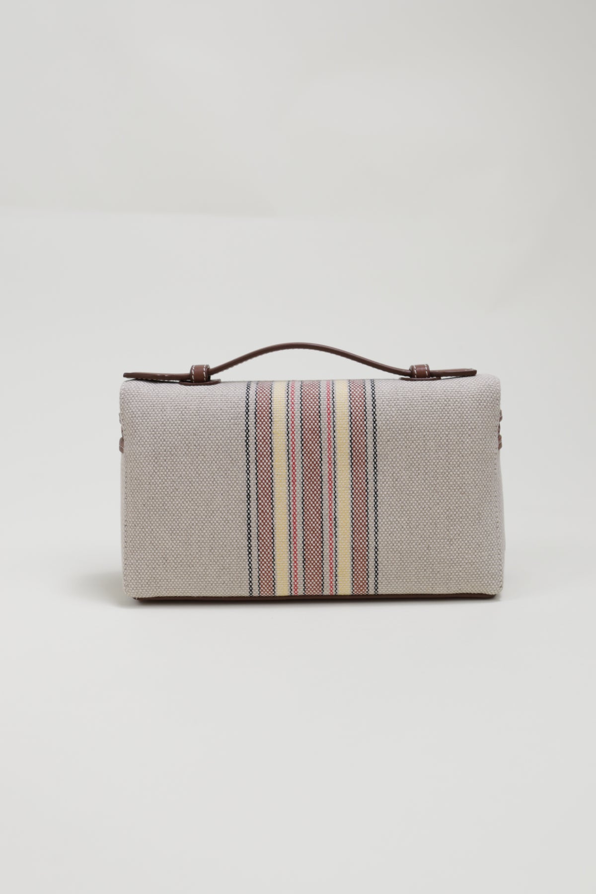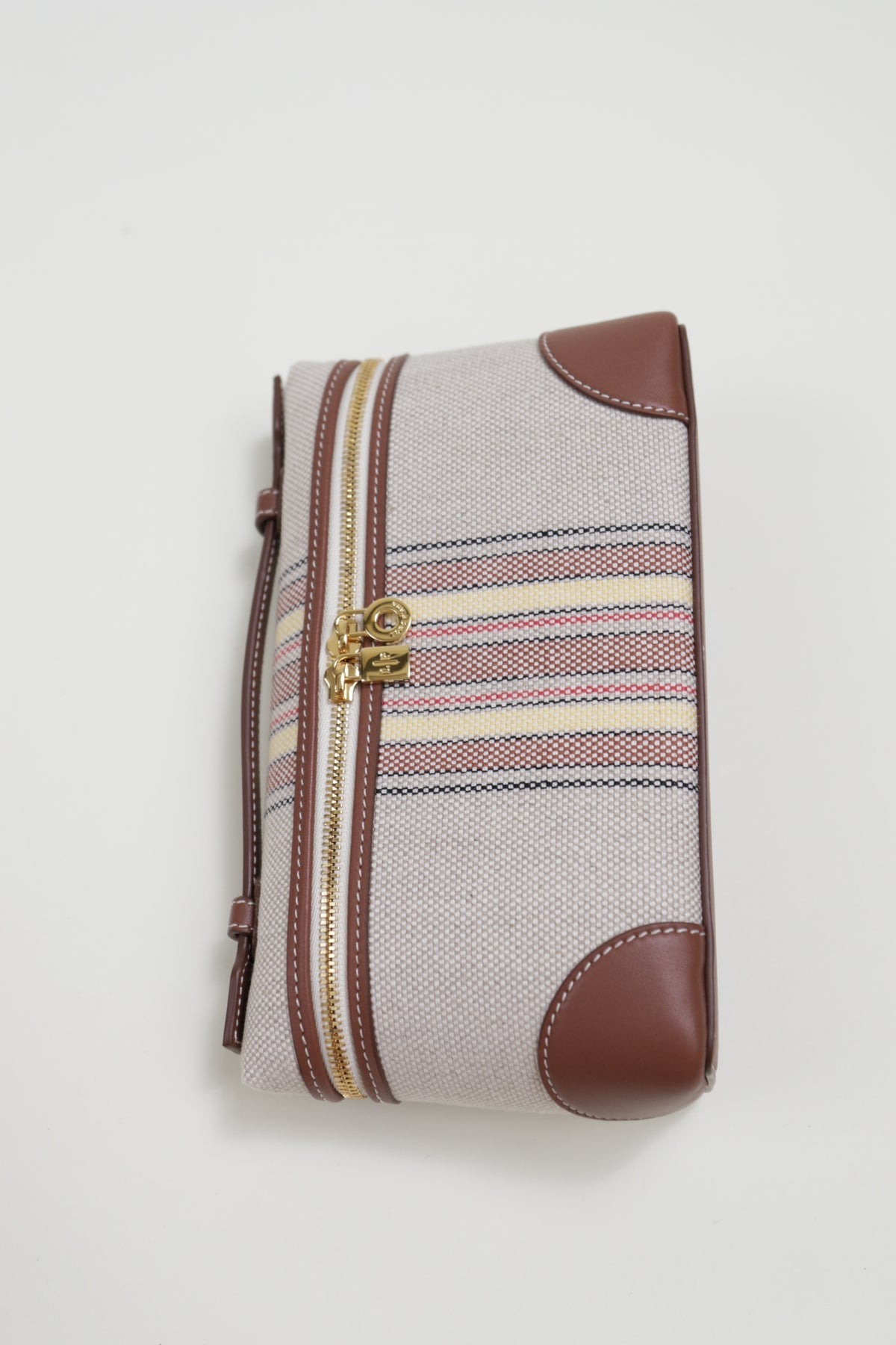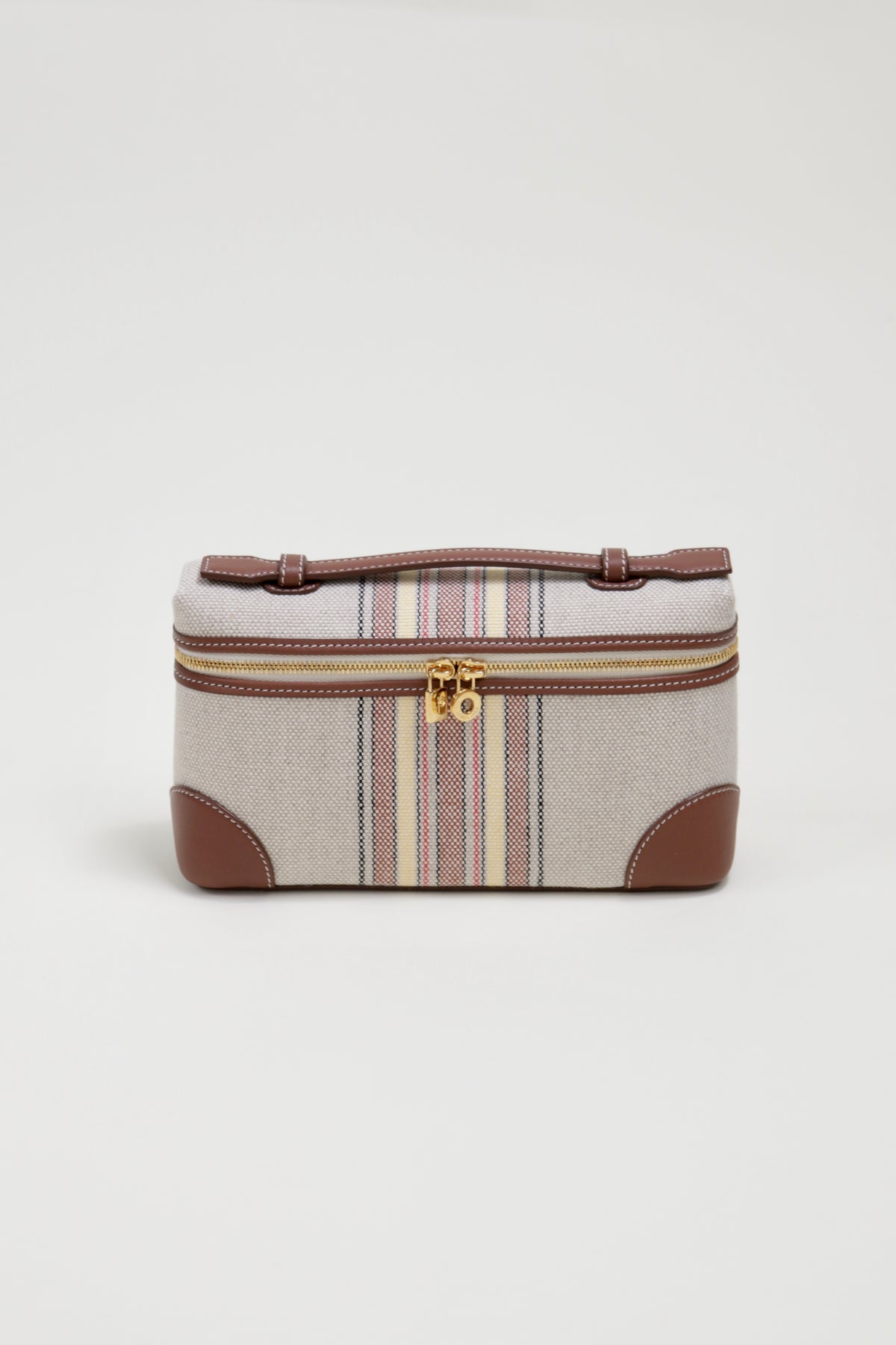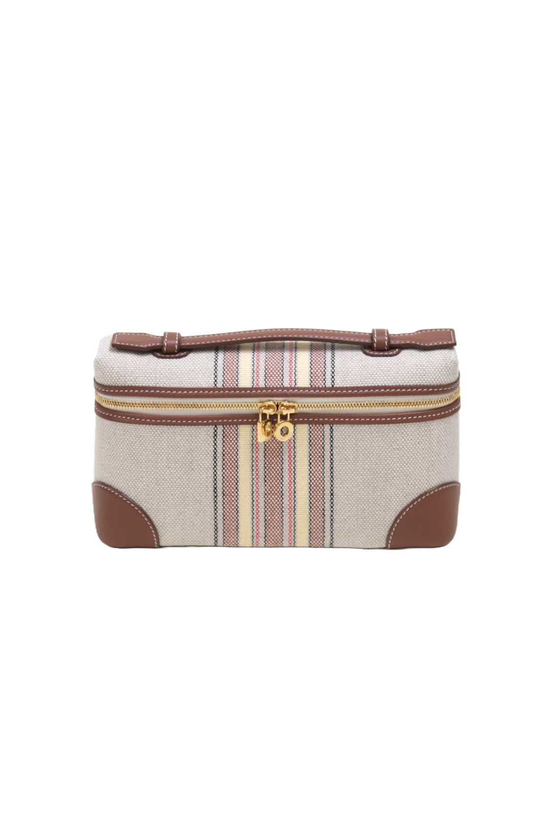 In striped canvas and exclusive calfskin, this bag embodies the sophistication of Loro Piana luggage with its leather-covered corners. Its adjustable and detachable strap offers versatility, whether used as a standalone mini-bag or tucked inside a larger one. Designed with practicality and style in mind, it's a versatile accessory for any setting and a thoughtful gift choice.