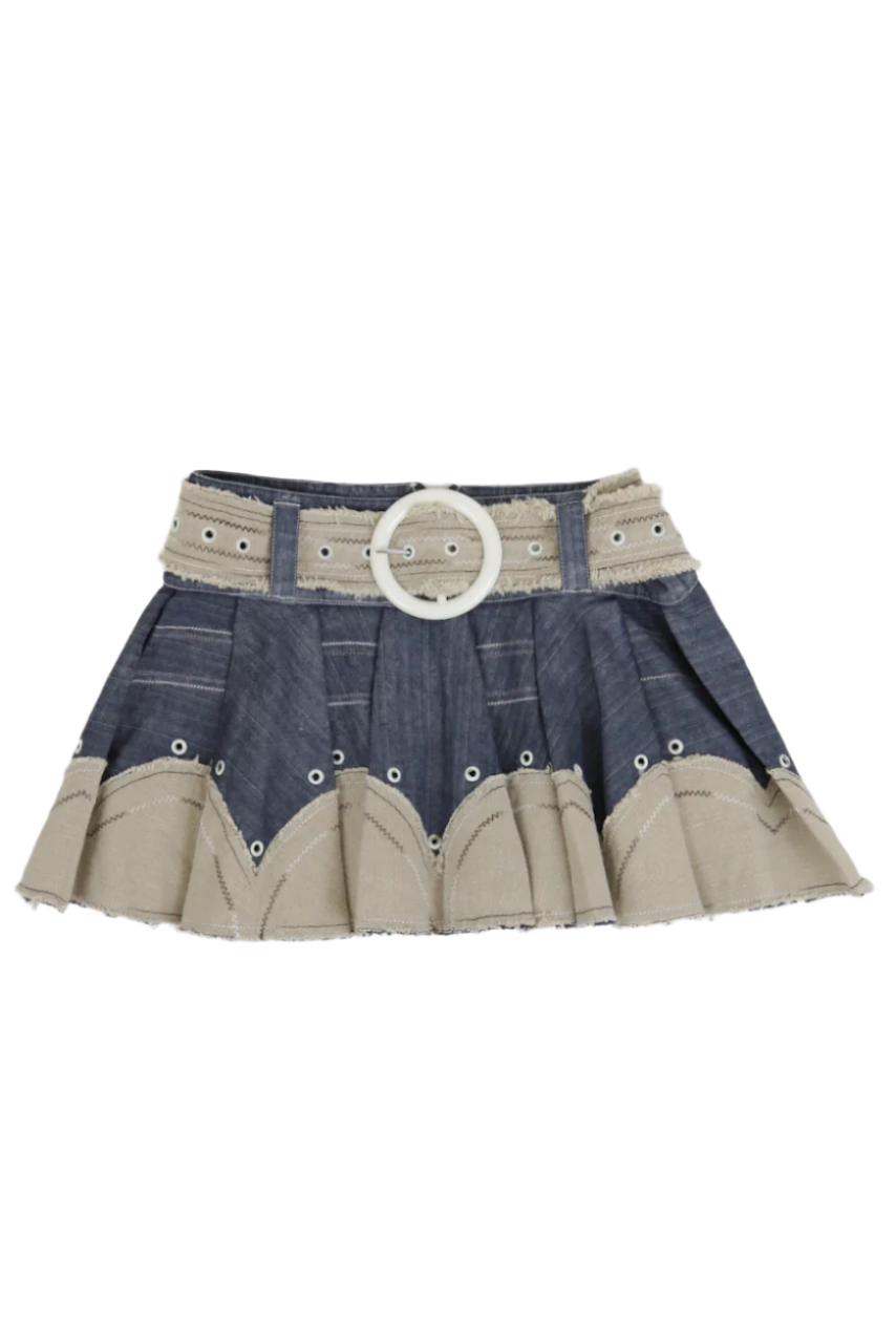 Make a statement with this vintage Roberto Cavalli pleated mini skirt, an iconic Y2K-era piece blending edgy and bohemian aesthetics. Designed with a mix of dark-wash denim and beige contrast panels, this skirt features intricate zigzag stitching, distressed frayed edges, and silver-tone grommet details for a bold, deconstructed look. The high-waisted fit is accentuated by a matching belt with a striking oversized white circular buckle, adding a touch of retro flair. A must-have for collectors and fashion enthusiasts, this skirt captures the essence of early 2000s Roberto Cavalli glam. Made in Italy.