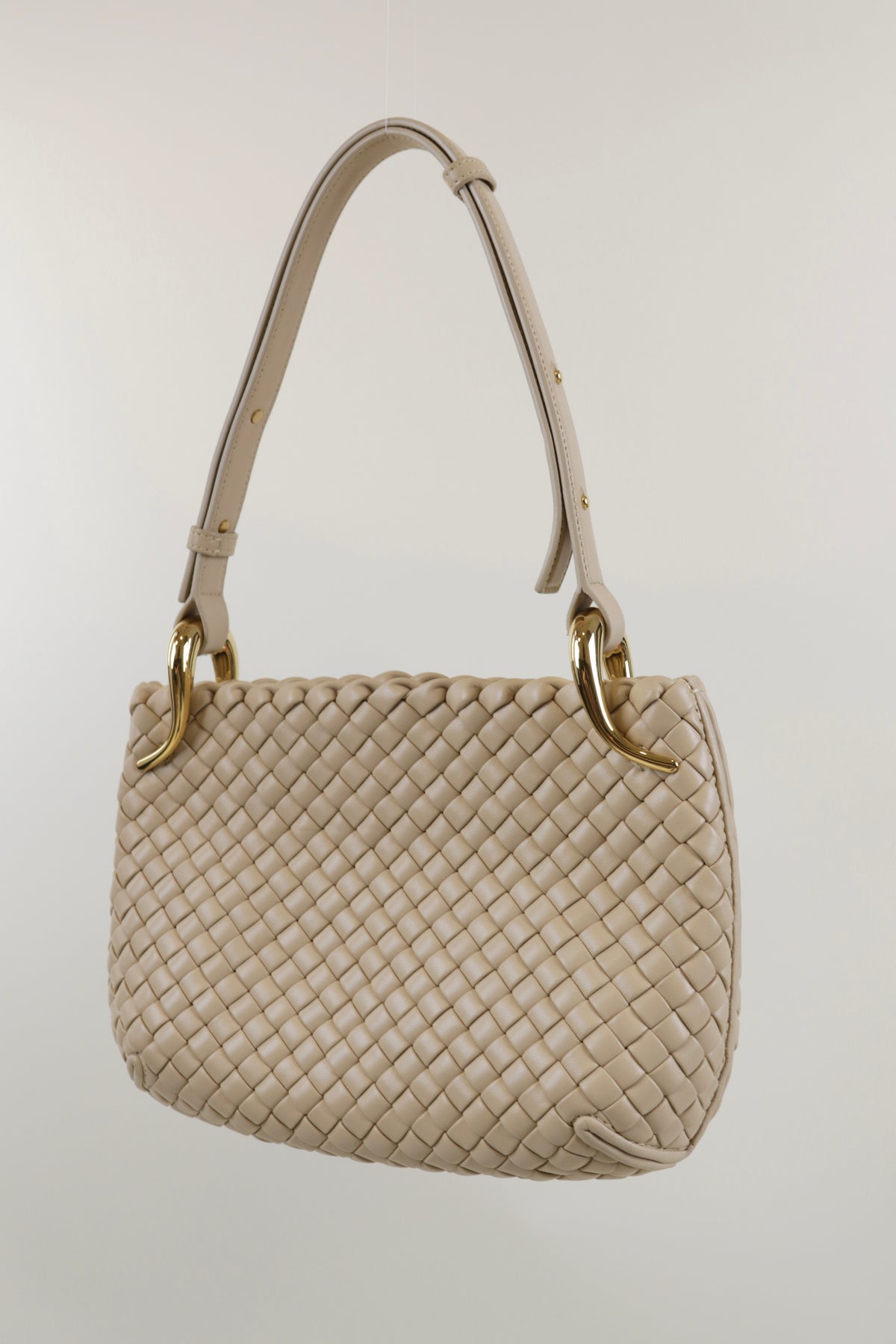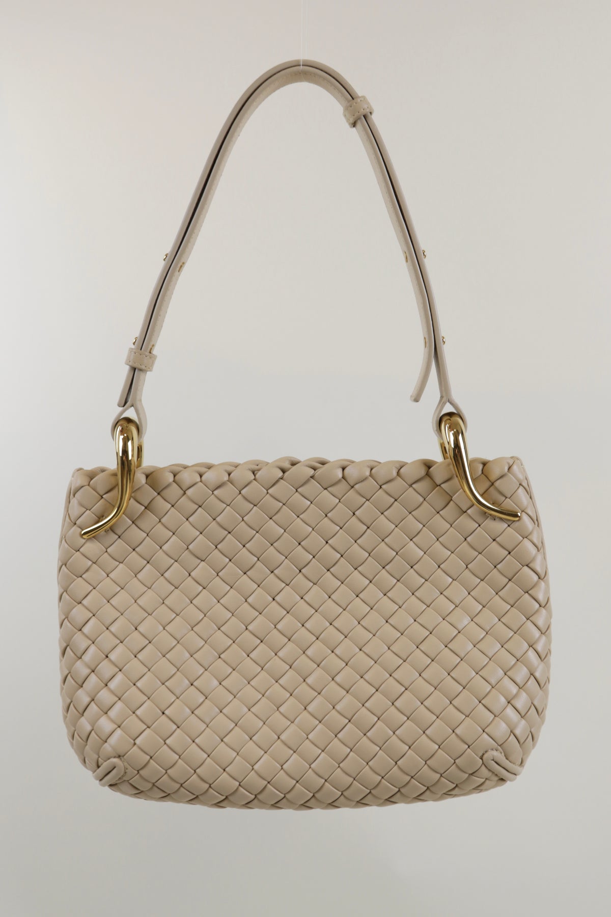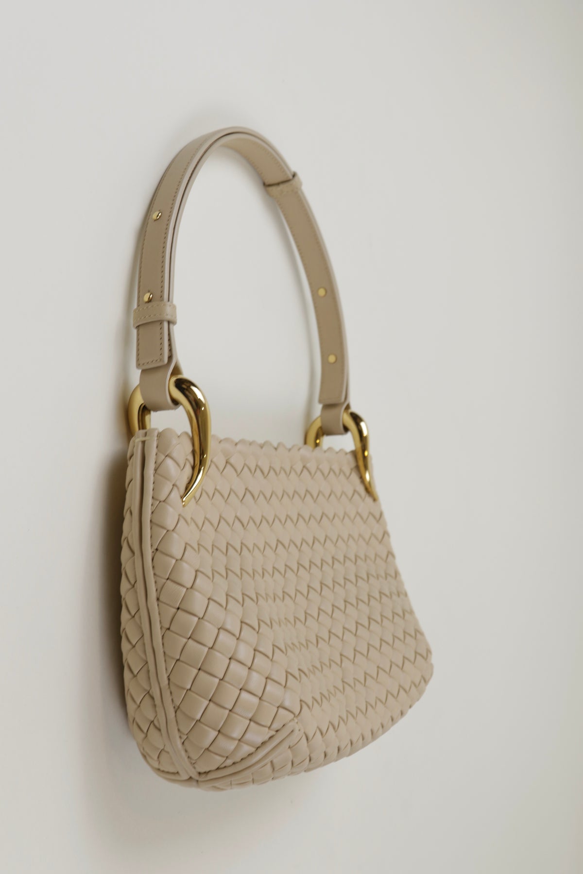 From the 2023 collection, Bottega Veneta reimagines the intrecciato weave in the style of a shoulder bag. It closes by way of a magnetic clasp at the top, and the handle is attached to the body via curved, gold hooks with a muse brass finish. The bag is a perfect neutral and versatile enough to wear all-year round. 100% lambskin.