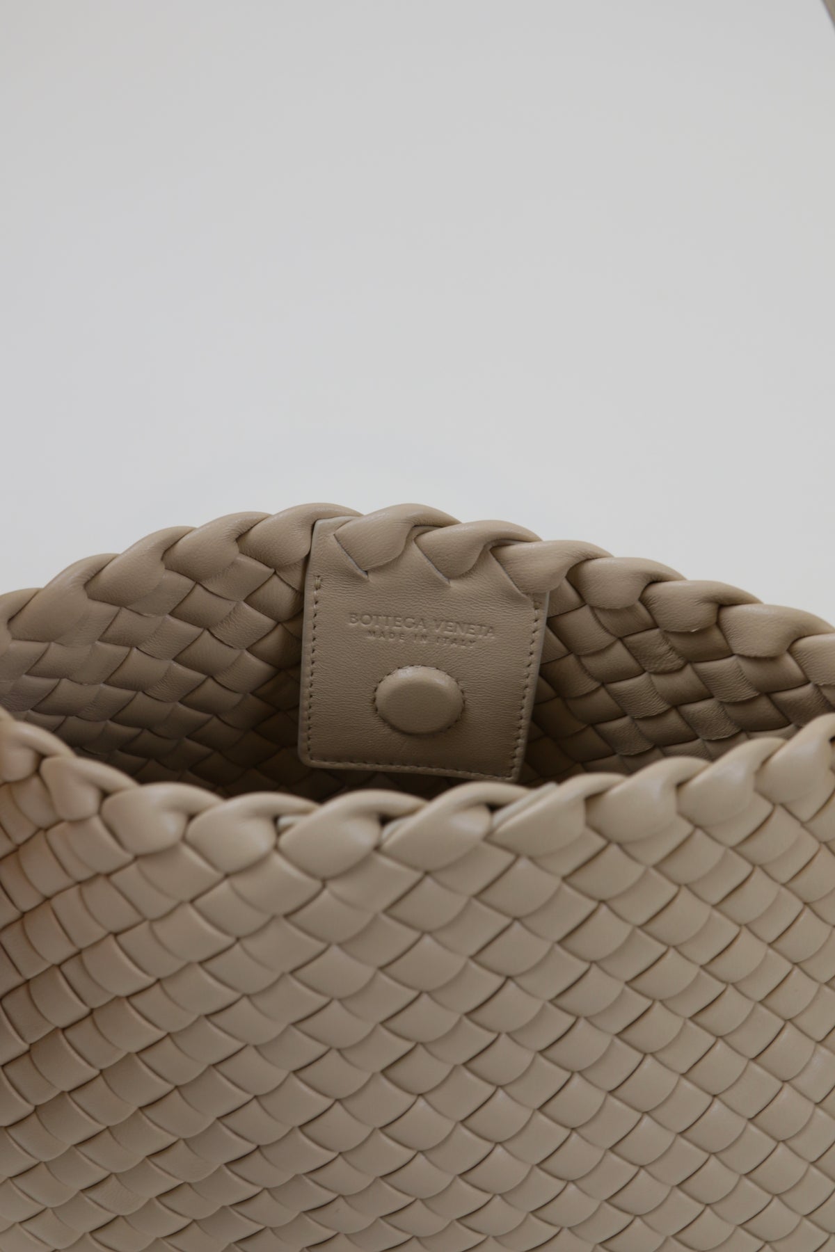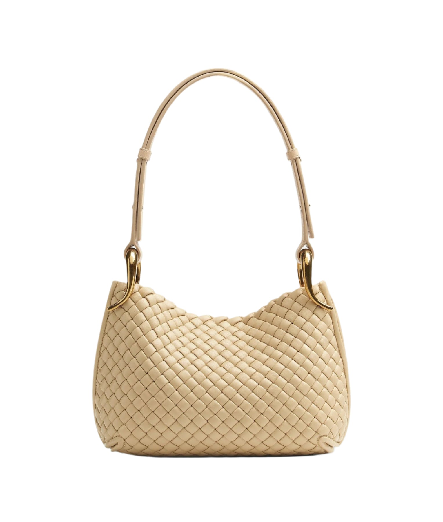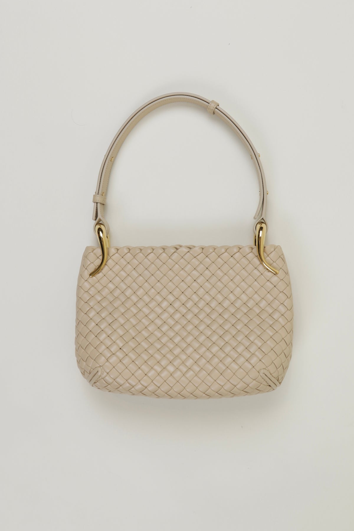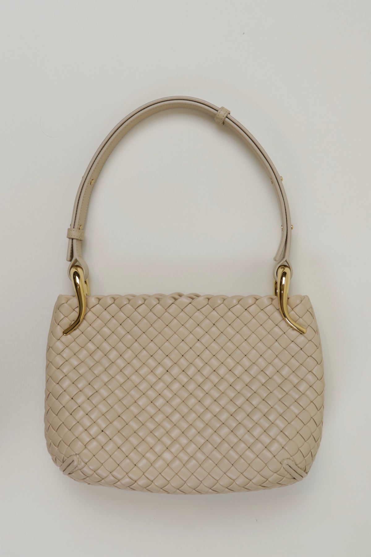From the 2023 collection, Bottega Veneta reimagines the intrecciato weave in the style of a shoulder bag. It closes by way of a magnetic clasp at the top, and the handle is attached to the body via curved, gold hooks with a muse brass finish. The bag is a perfect neutral and versatile enough to wear all-year round. 100% lambskin.