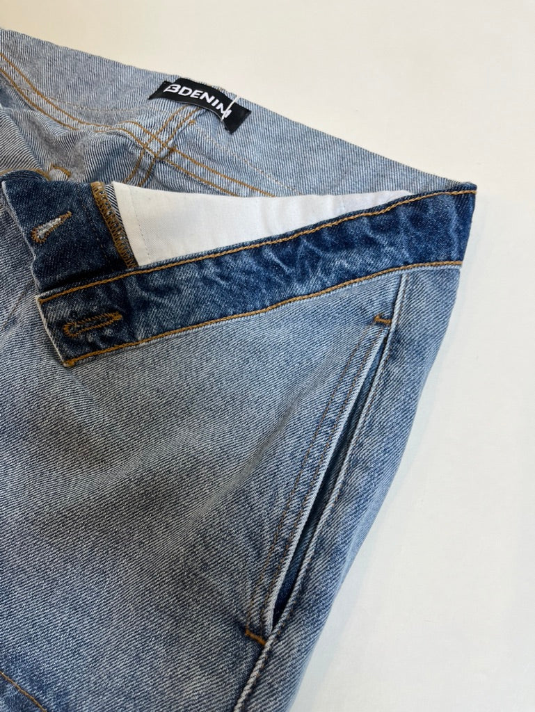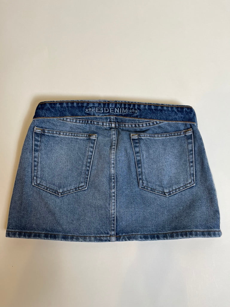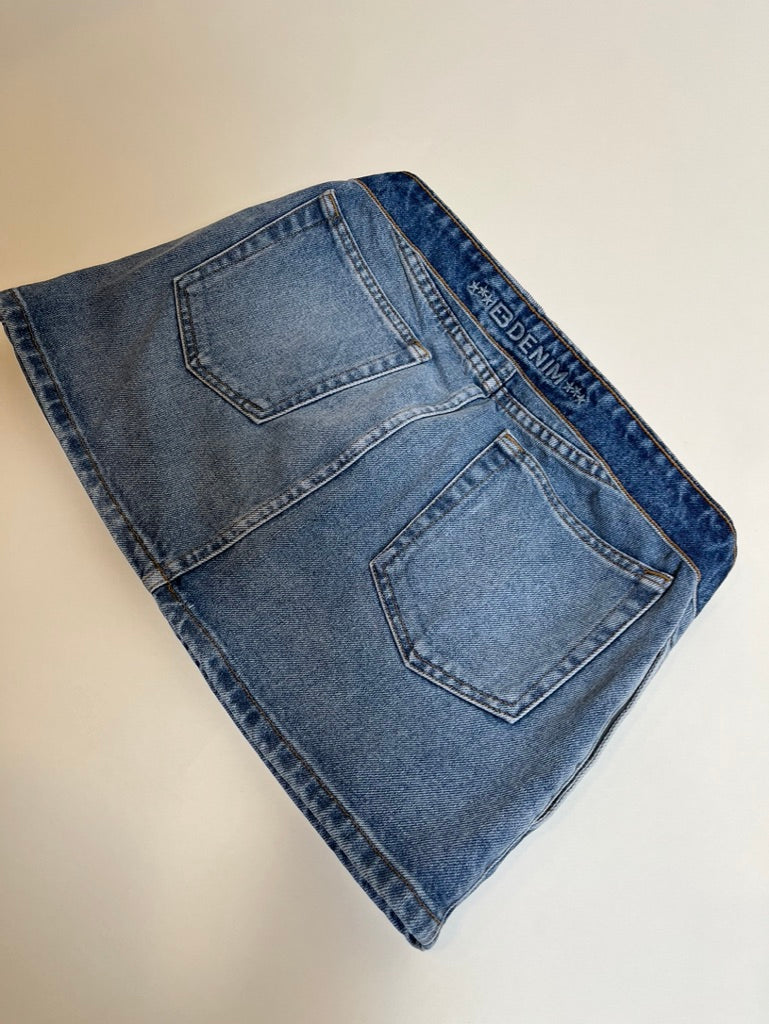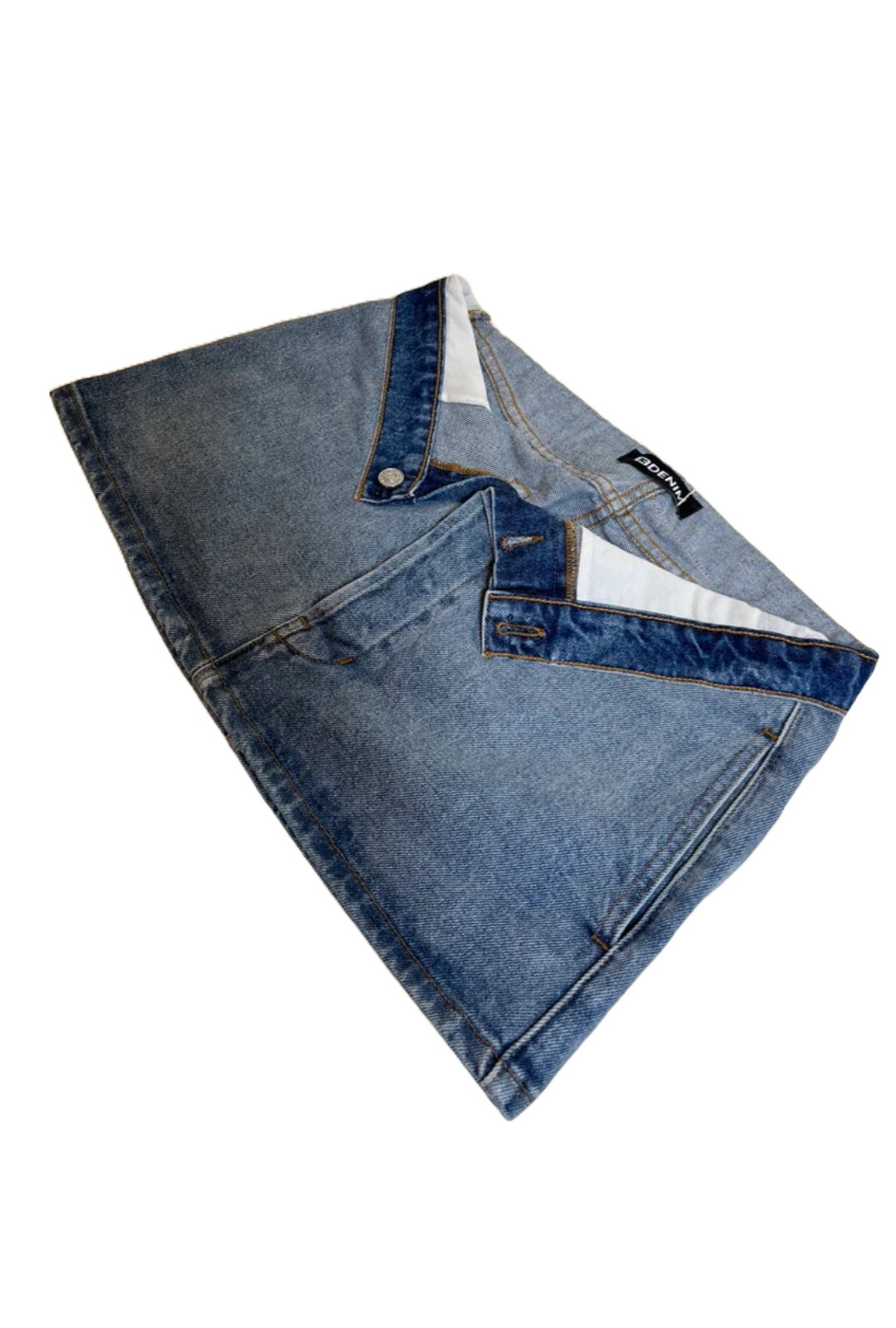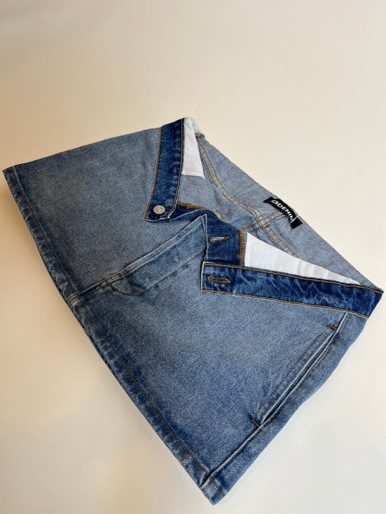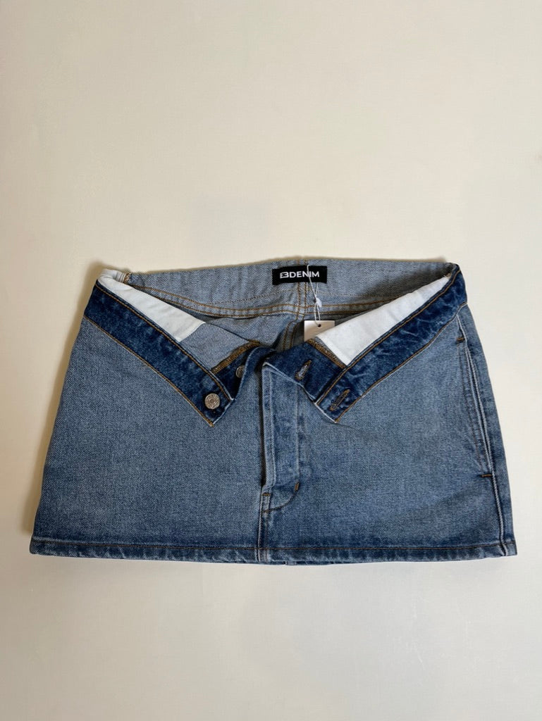 The Madison mini skirt features a foldover waistband with exposed pockets, a button fly, side slip pockets, and back patch pockets.