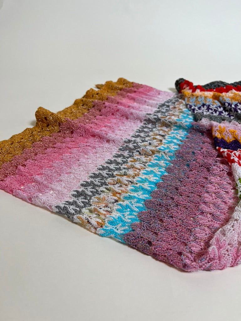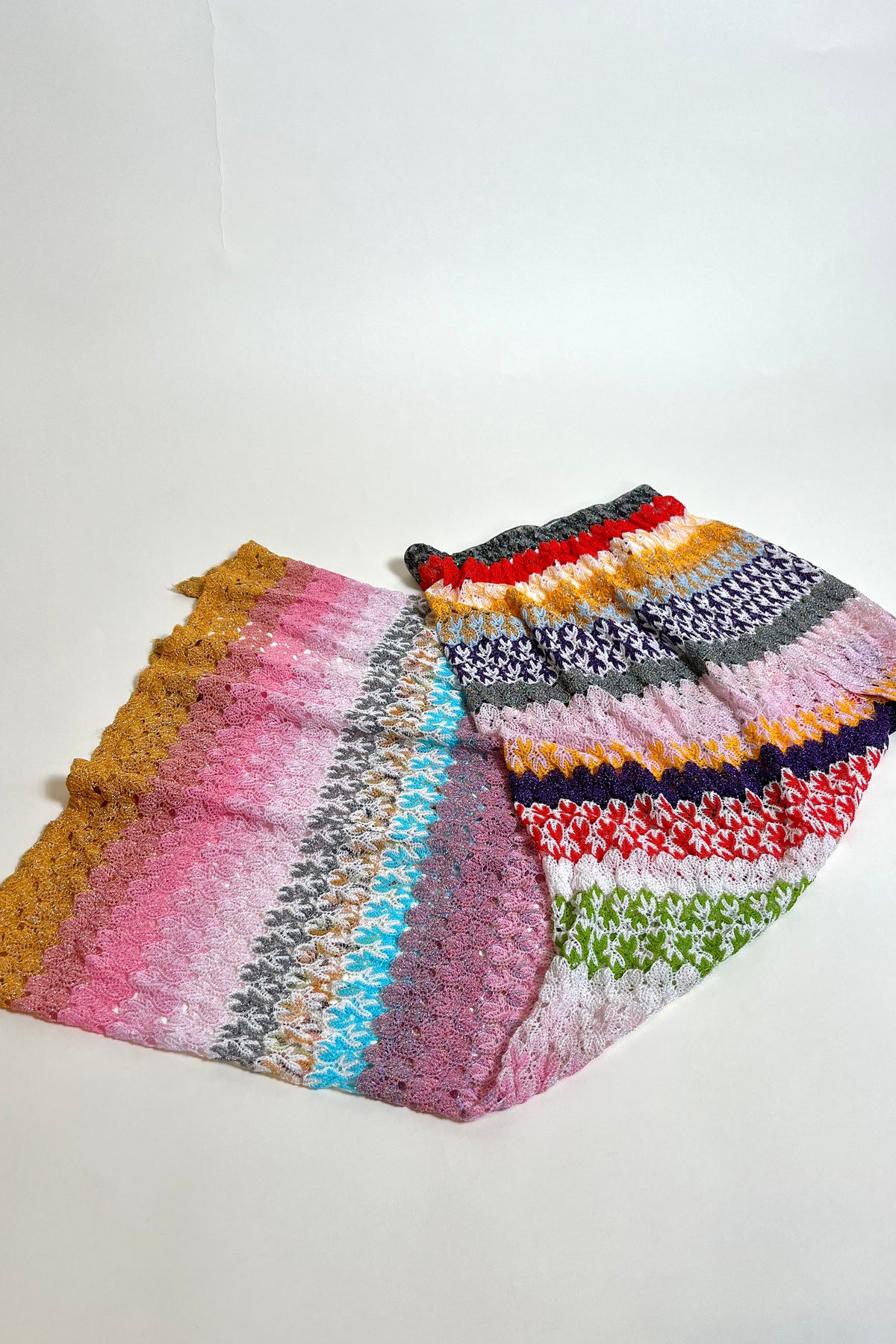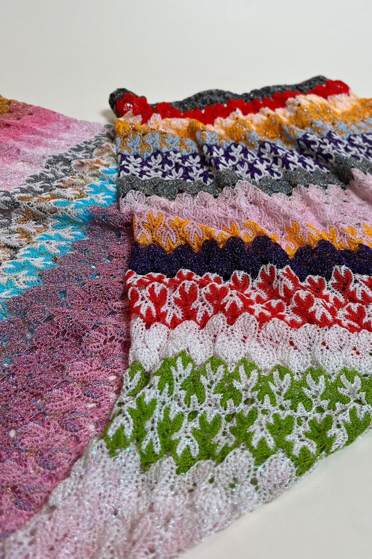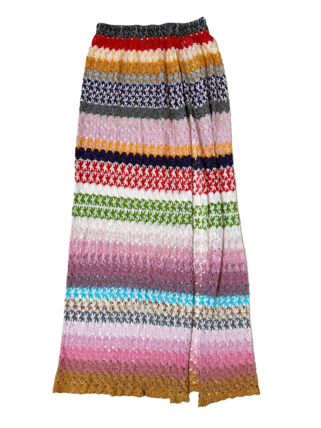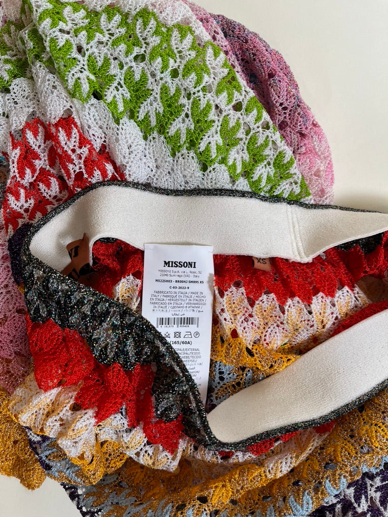 Tricot workmanship of small multicolored flamed motifs, which follow each other in irregular horizontal bands, and all the practicality of Missoni's style in this season's beachwear.