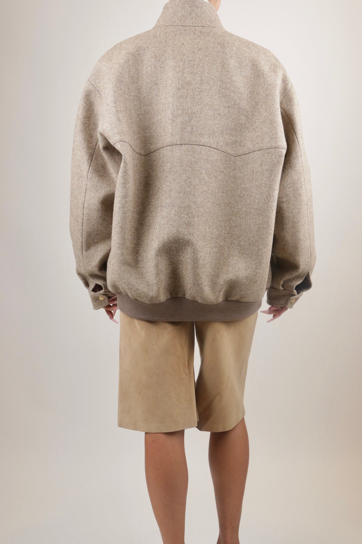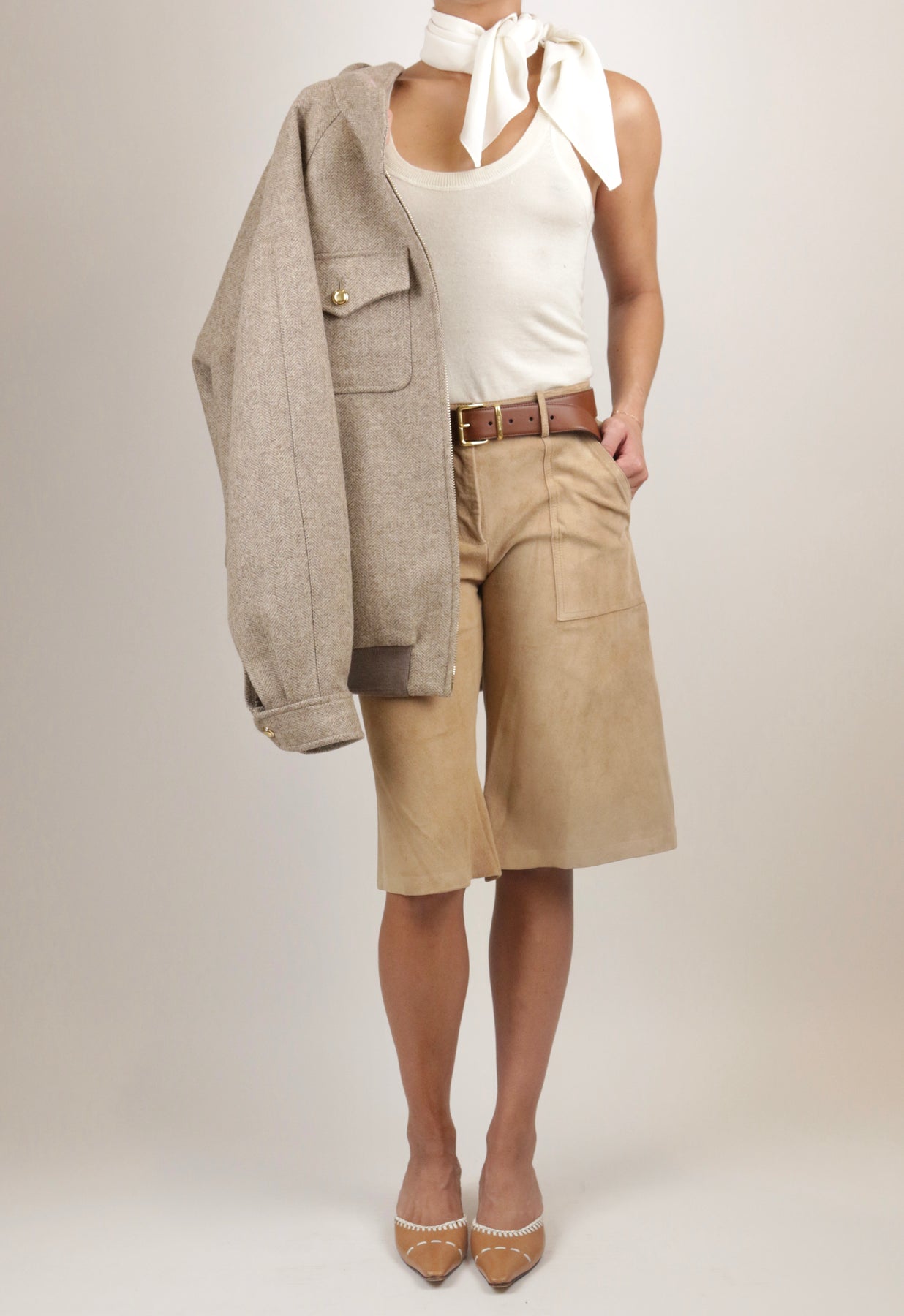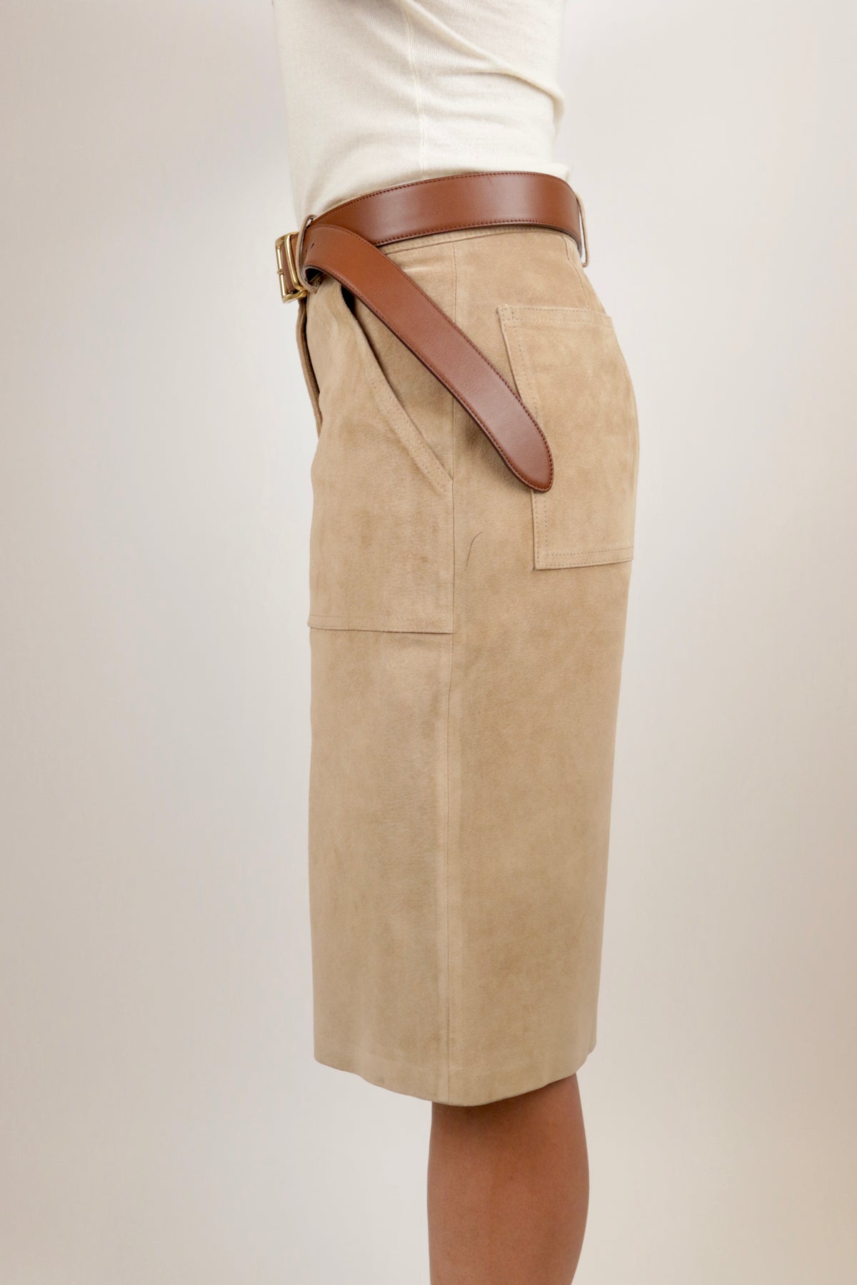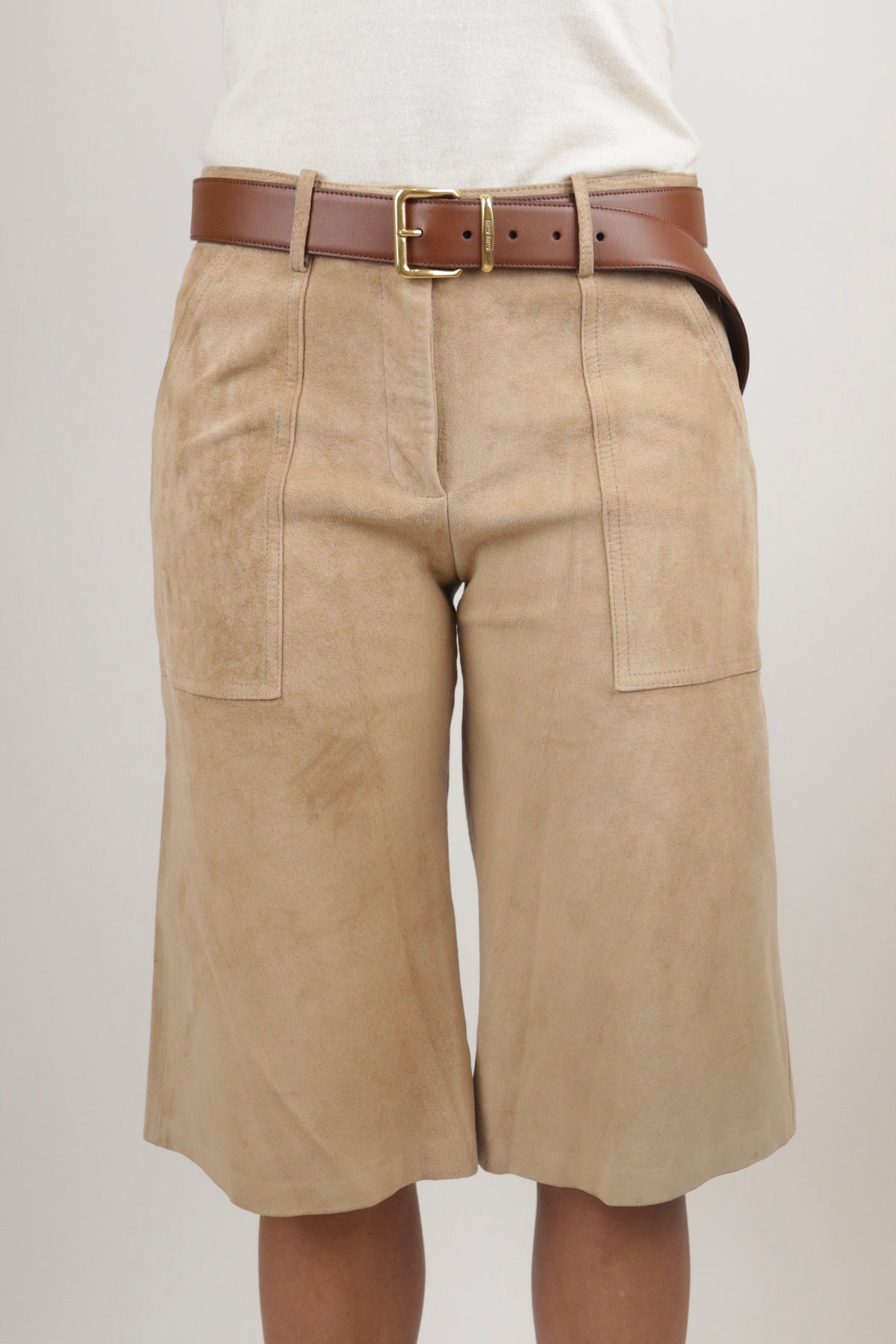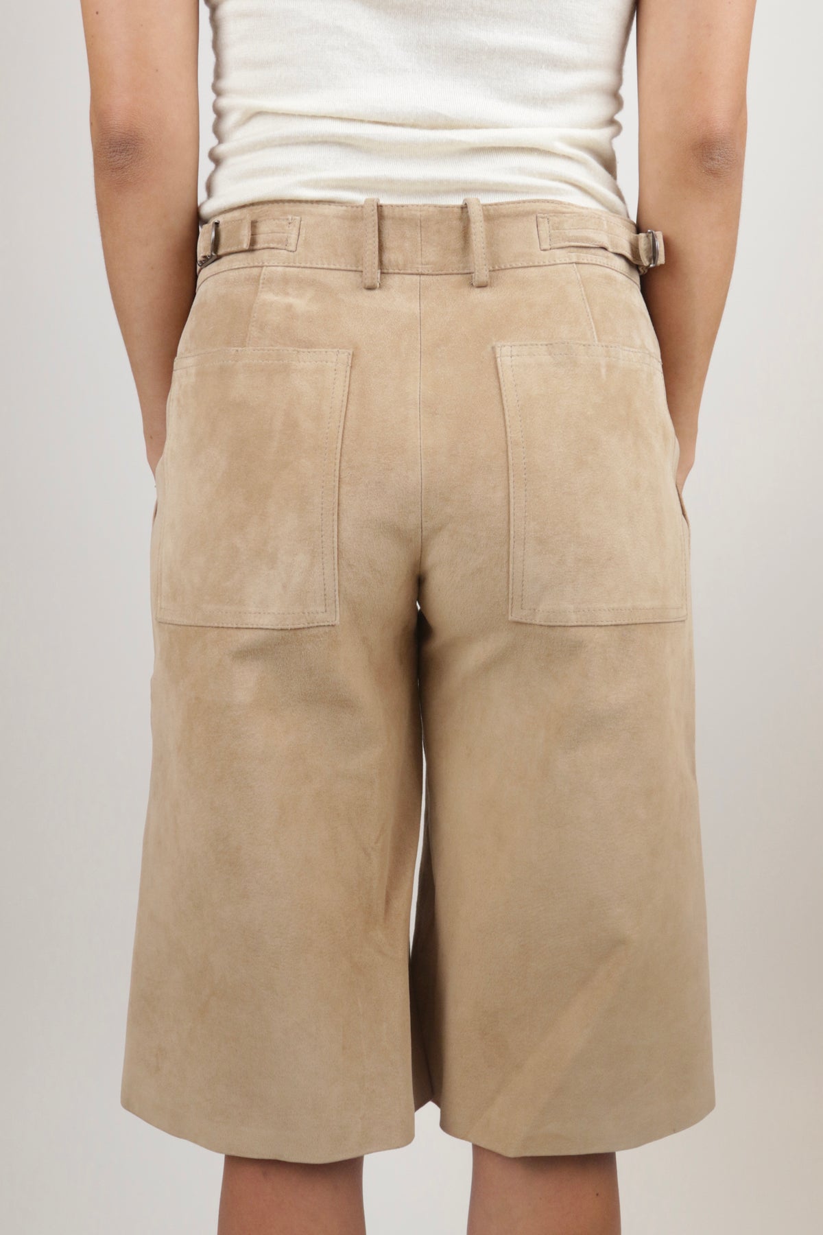 These vintage shorts have elongated front pockets that add to the dimensionality of the cropped length. They are crafted from a buttery-soft suede, making them warm enough to wear during the winter with your favorite knee boots or a pair of stockings.
