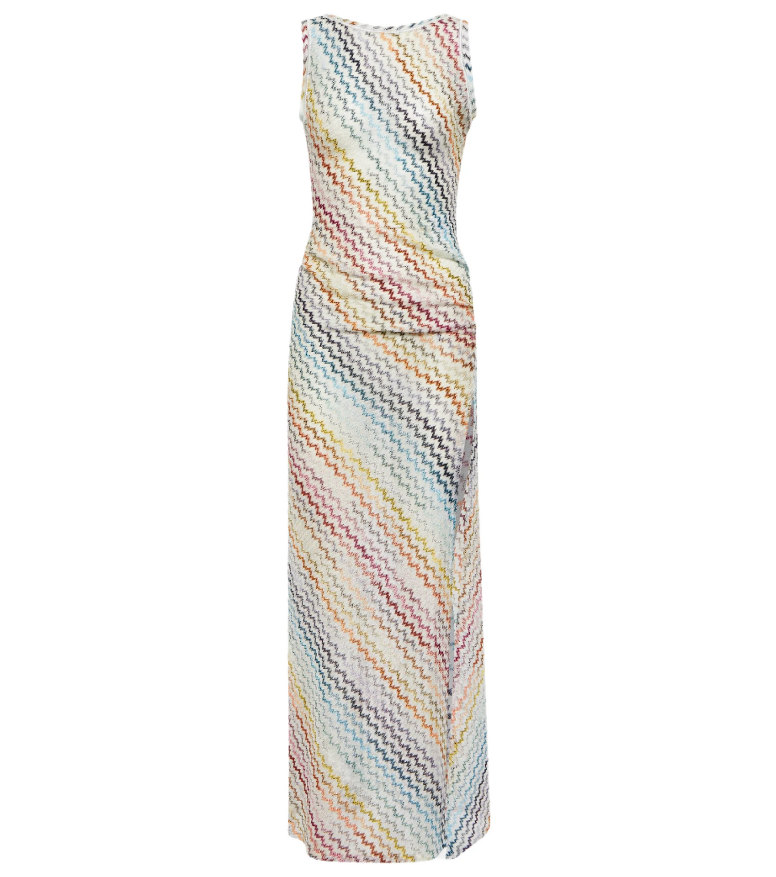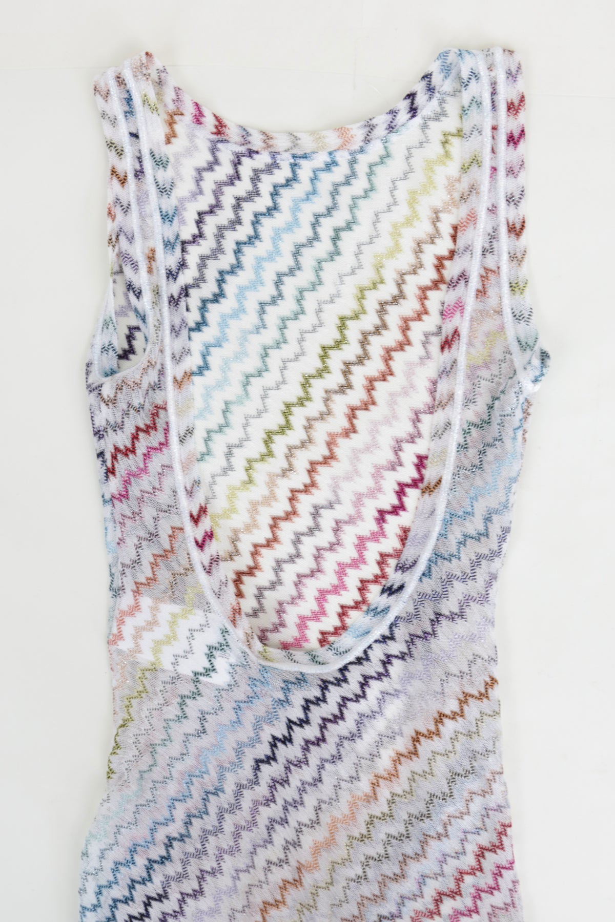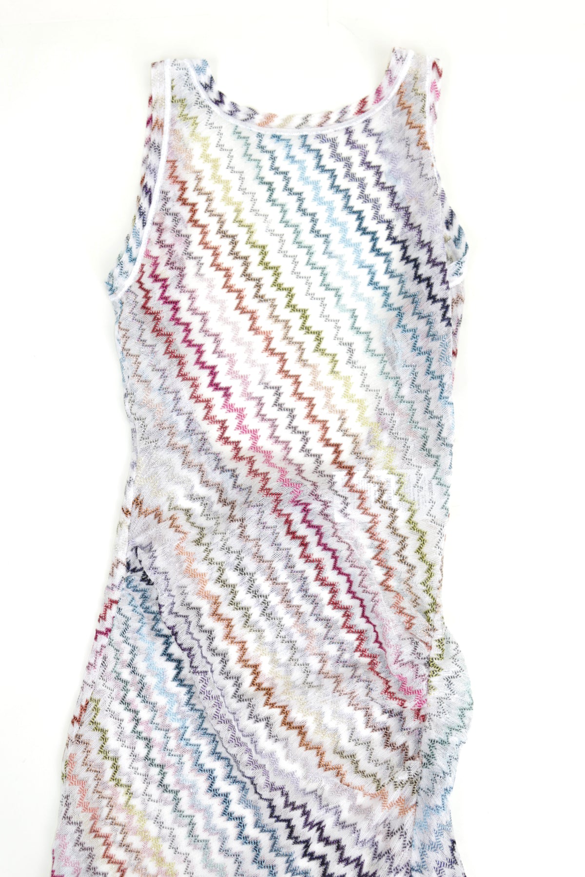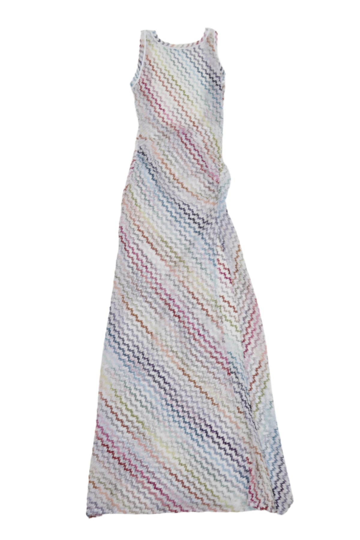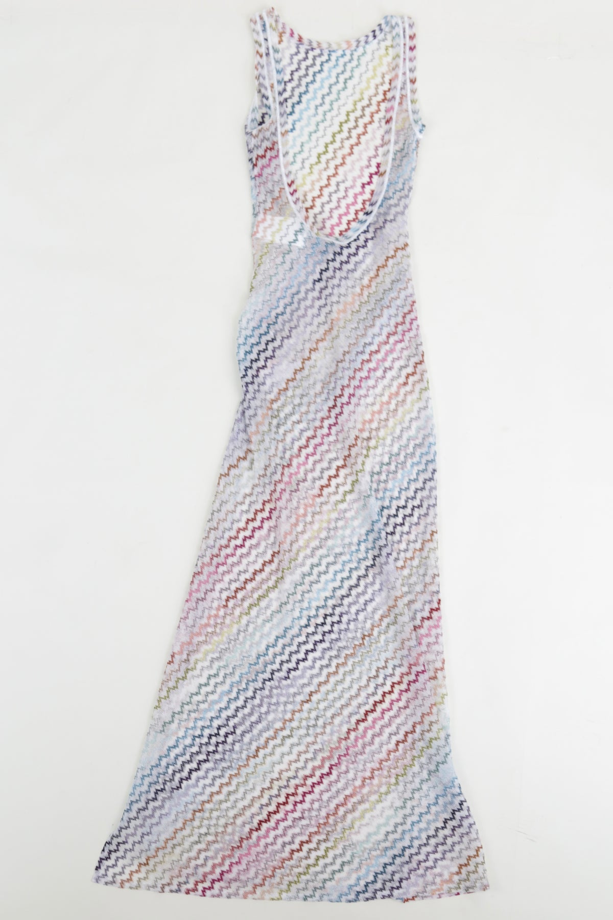 Elevate your resort wardrobe with this Missoni Sheer Cover-Up Dress, a lightweight and effortlessly chic piece designed for luxury beachwear and warm-weather getaways. Crafted in Missoni’s signature multicolor chevron knit, this sleeveless maxi dress features a diagonal striped pattern in soft pastel and bold hues, creating a playful yet sophisticated aesthetic.