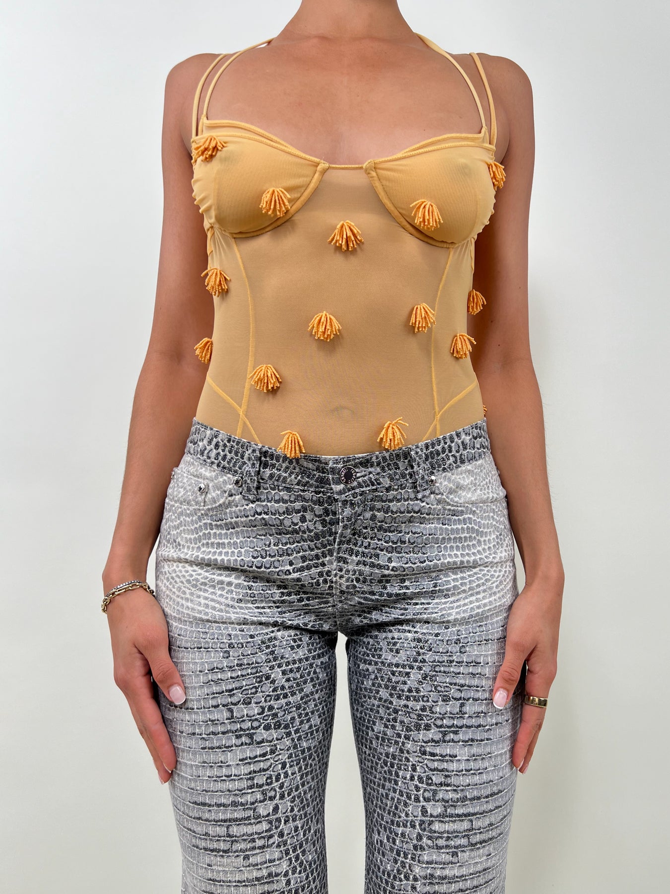 Made from a beaded stretchy mesh jersey, this thong bodysuit features a layered soft-cup bra with bikini-like ties at the low-cut back.
