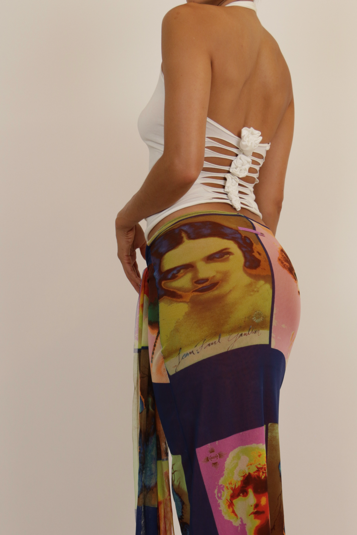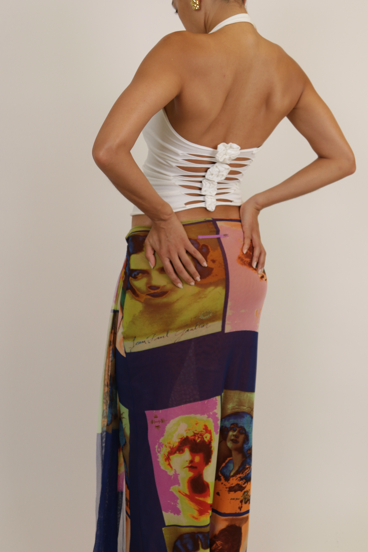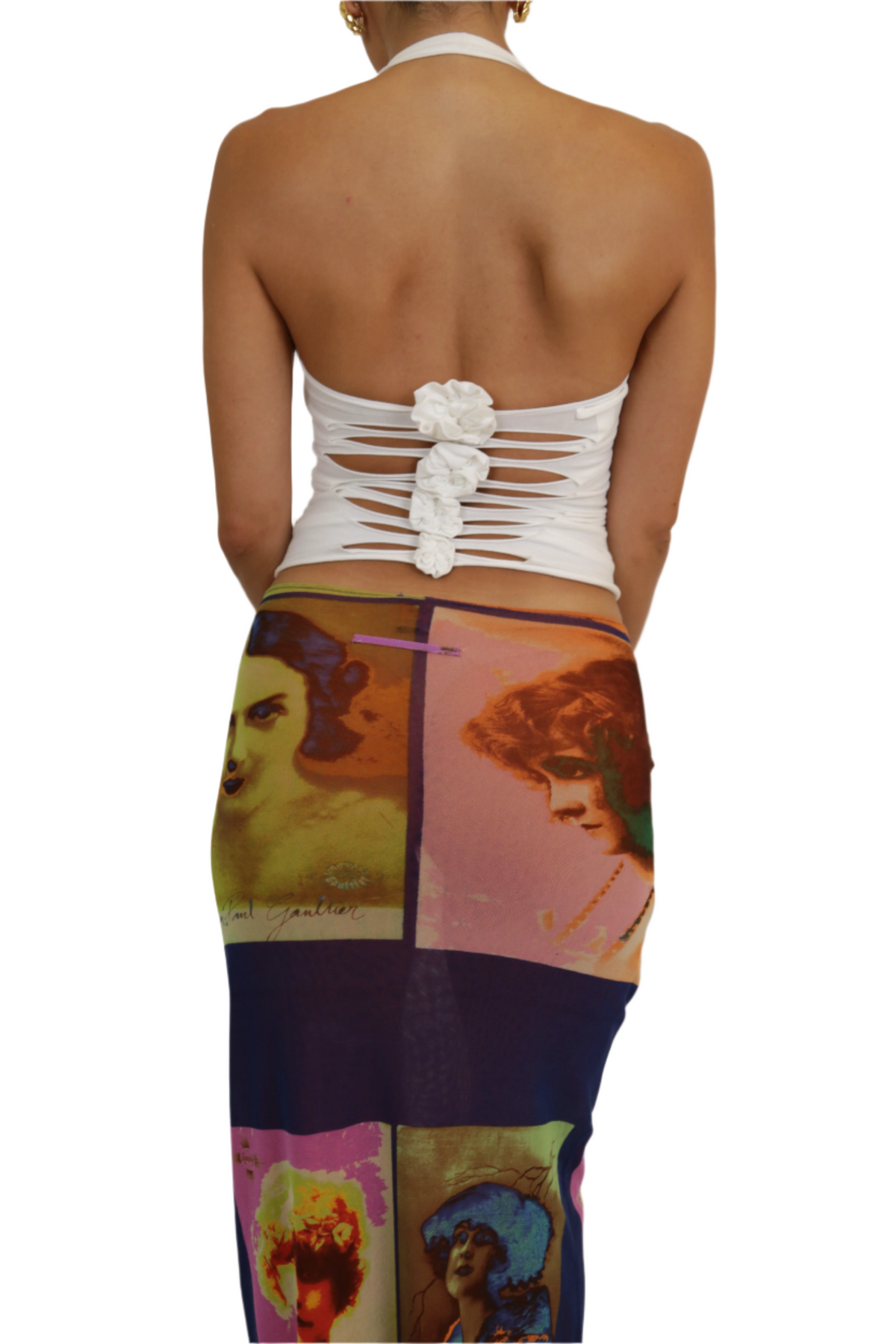 White halterneck top with laser cut-out back details and flower attachments.