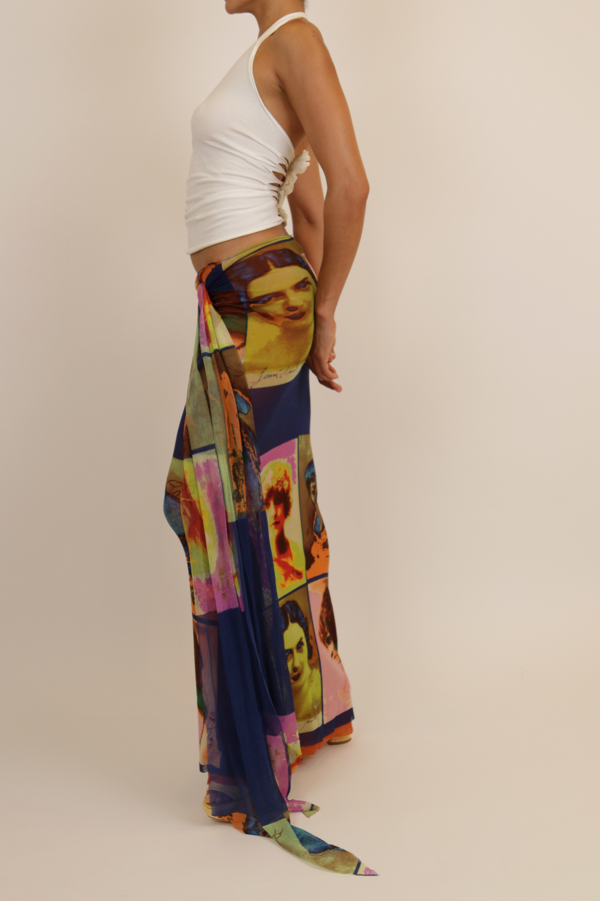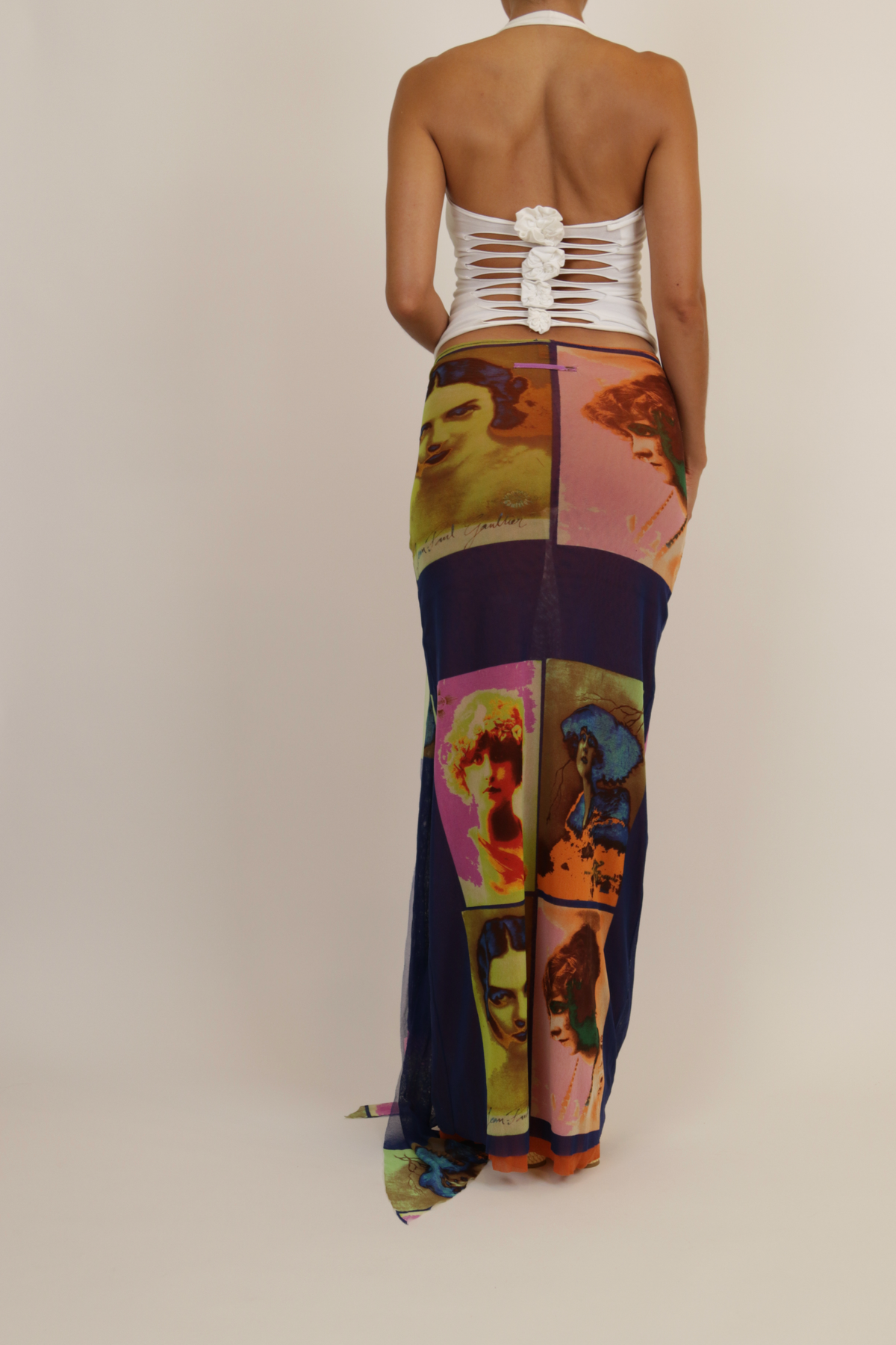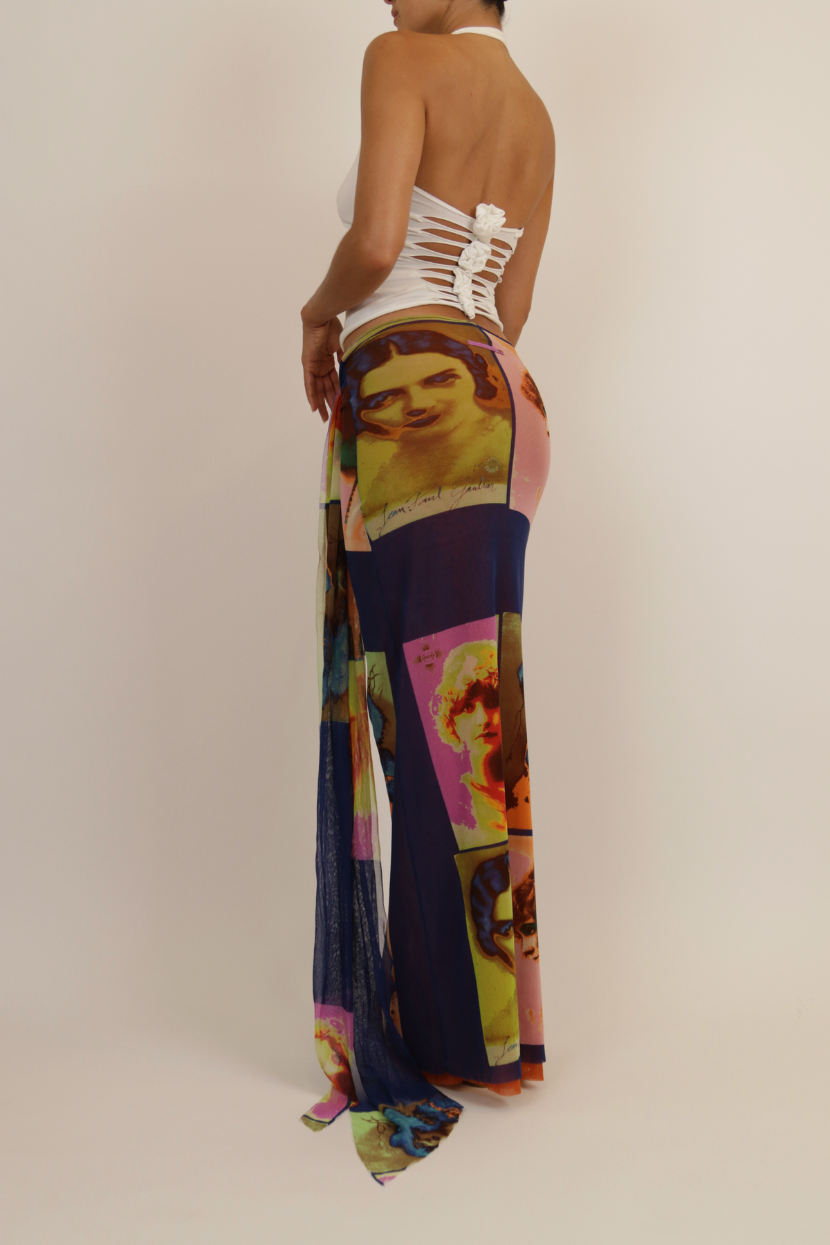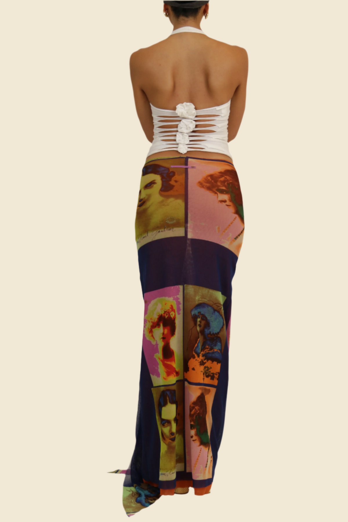 White halterneck top with laser cut-out back details and flower attachments.