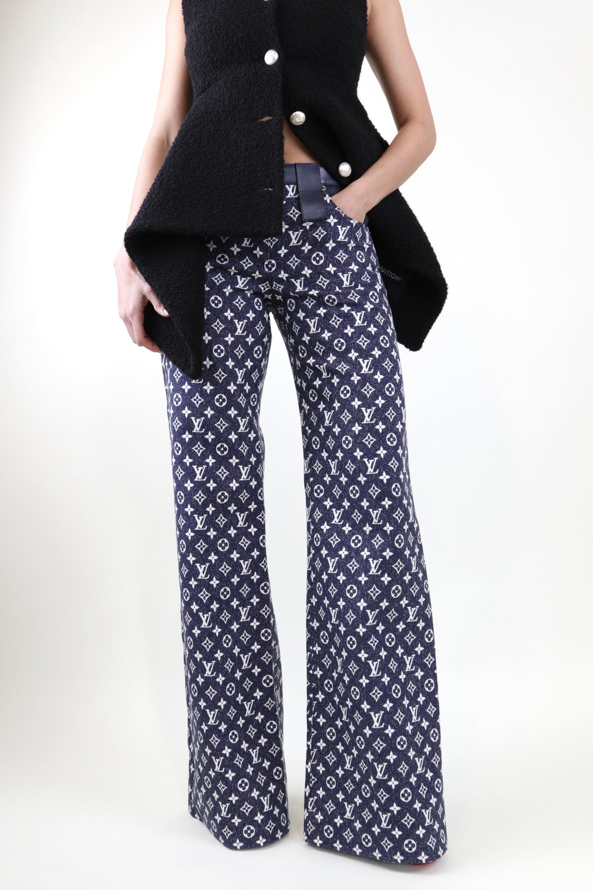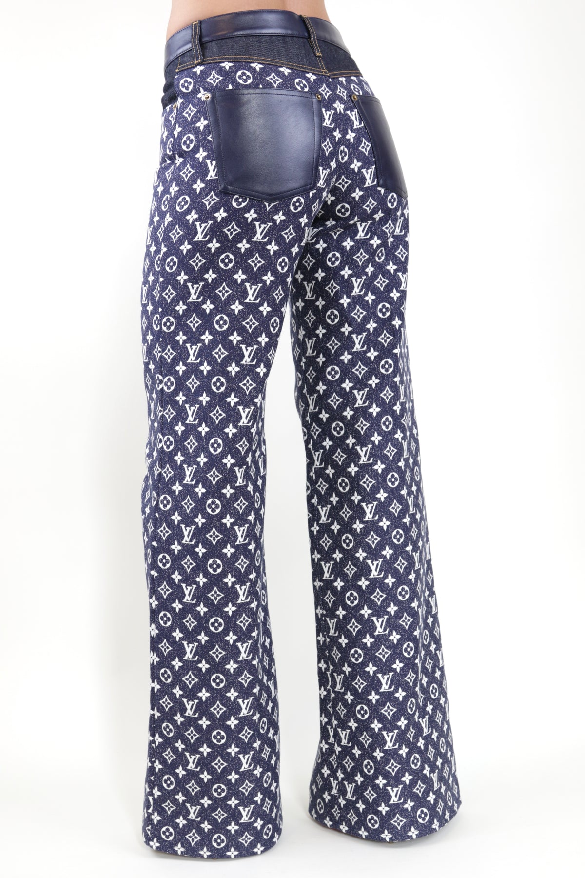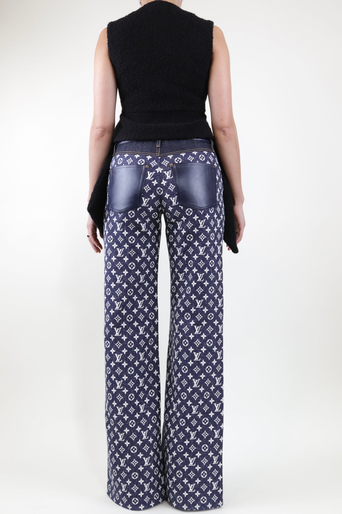 These jeans make a spirited signature statement in this season’s graphic Monogram jacquard denim, while raw denim accents and tonal leather inserts around the waistband and pockets introduce a chic play of texture. The high-waisted boot-cut silhouette has a chic vintage feel, which is underscored by yellow topstitching that highlights the construction for a classic structured finish.