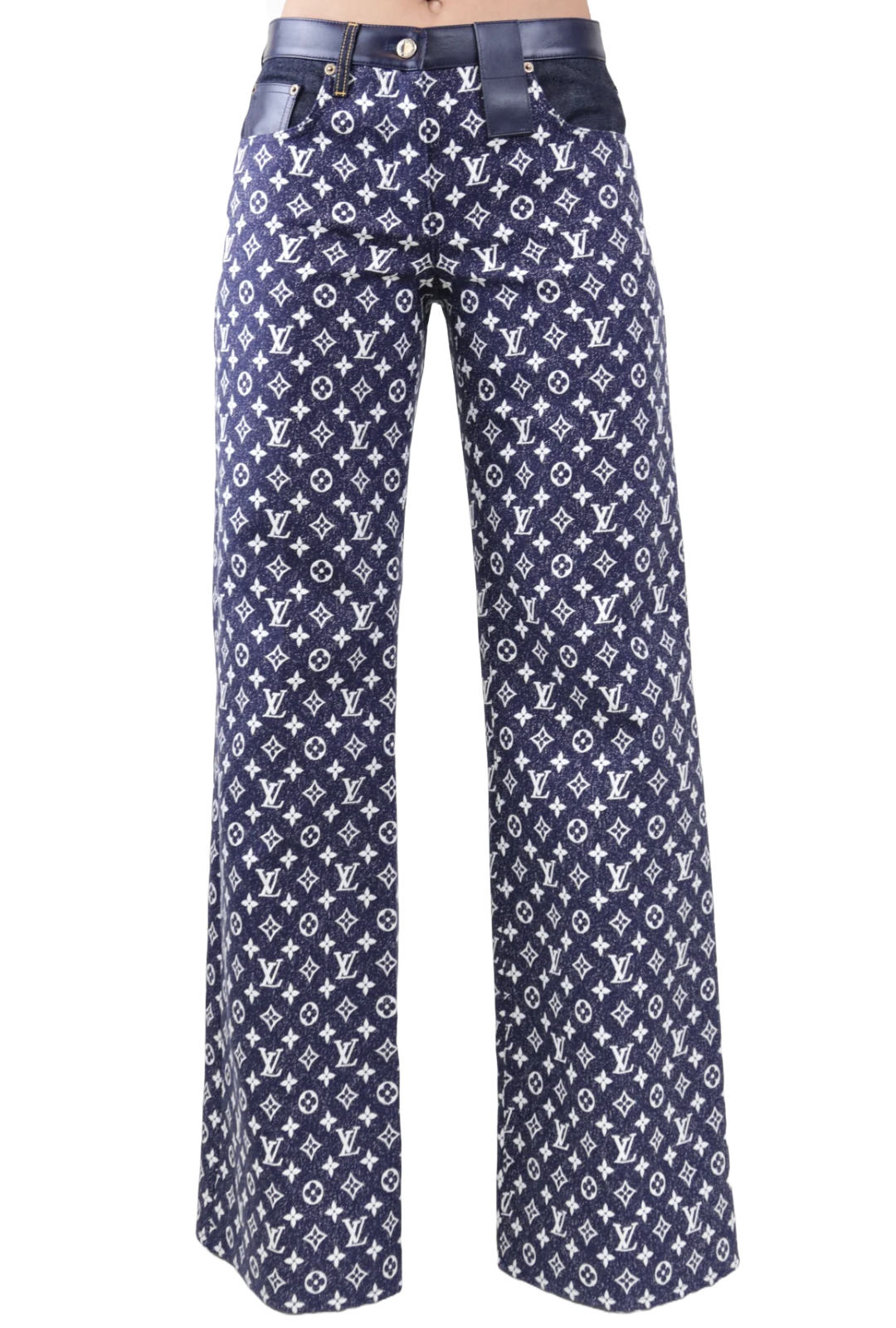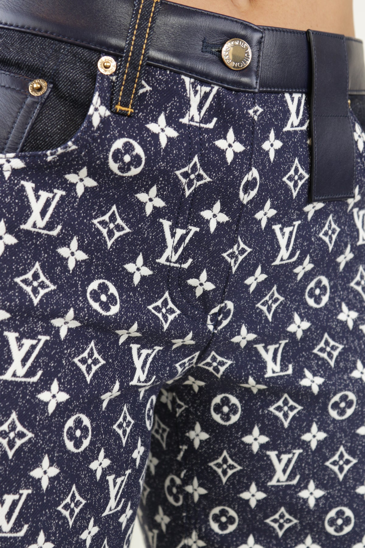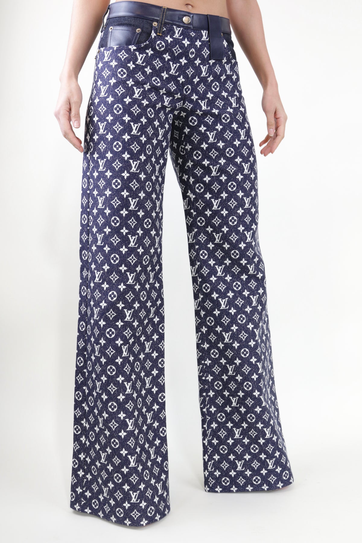 These jeans make a spirited signature statement in this season’s graphic Monogram jacquard denim, while raw denim accents and tonal leather inserts around the waistband and pockets introduce a chic play of texture. The high-waisted boot-cut silhouette has a chic vintage feel, which is underscored by yellow topstitching that highlights the construction for a classic structured finish.