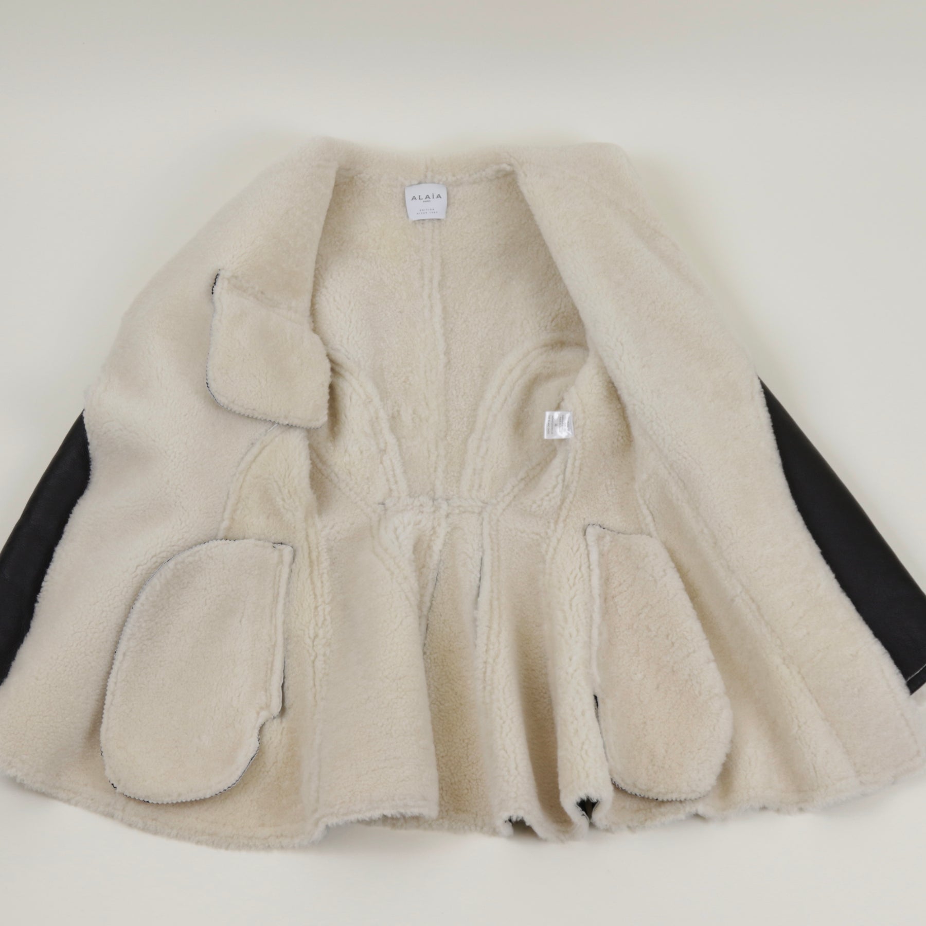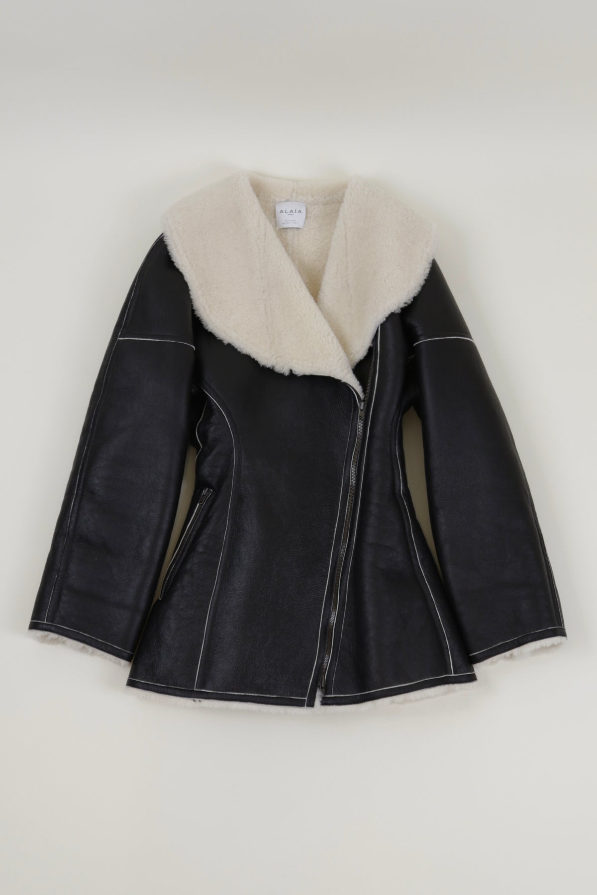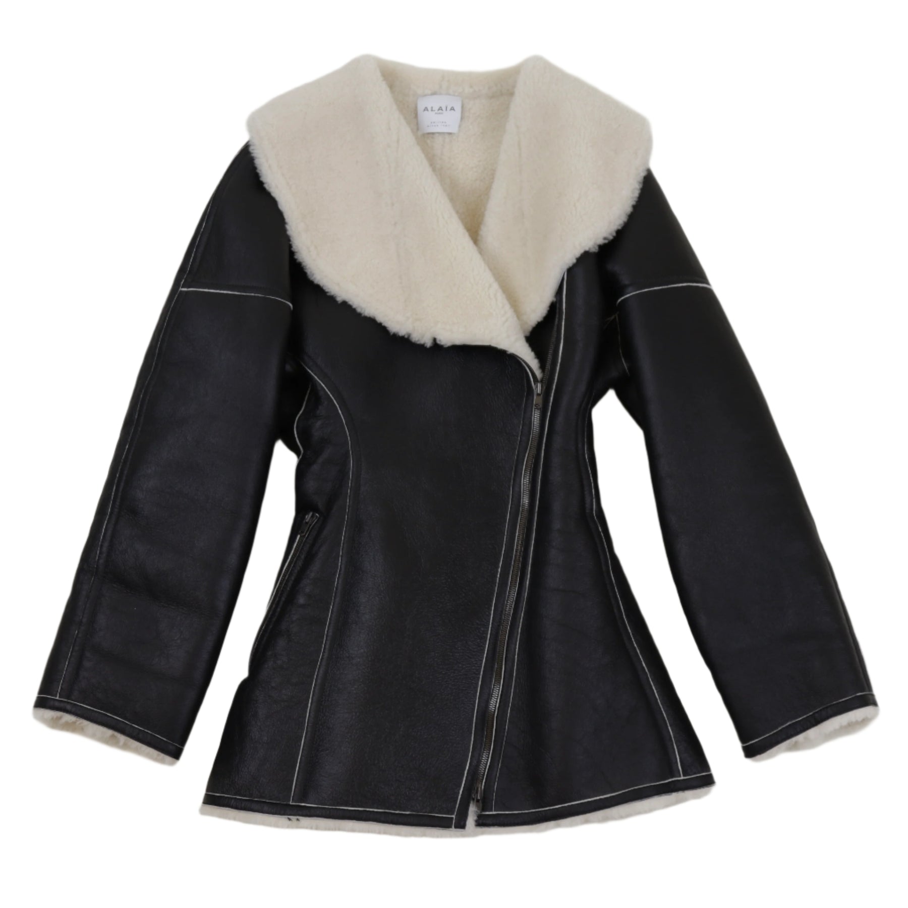 A covetable style for longtime Alaïa devotees, this black coat comes from the label's archival Editions line. Soft black lambskin – a favored material of the label and one of the most supple leathers – is balanced by white shearling accents and meticulous topstitching. The fitted waist and wide lapels are also brand signatures.