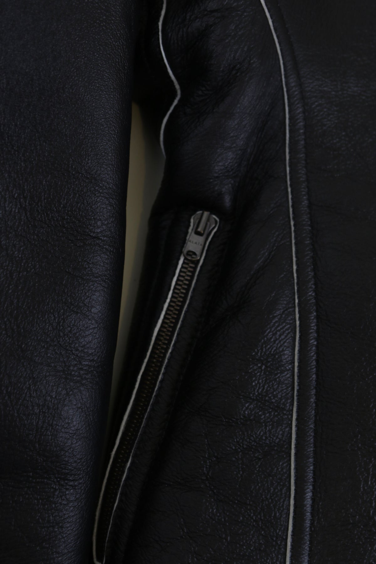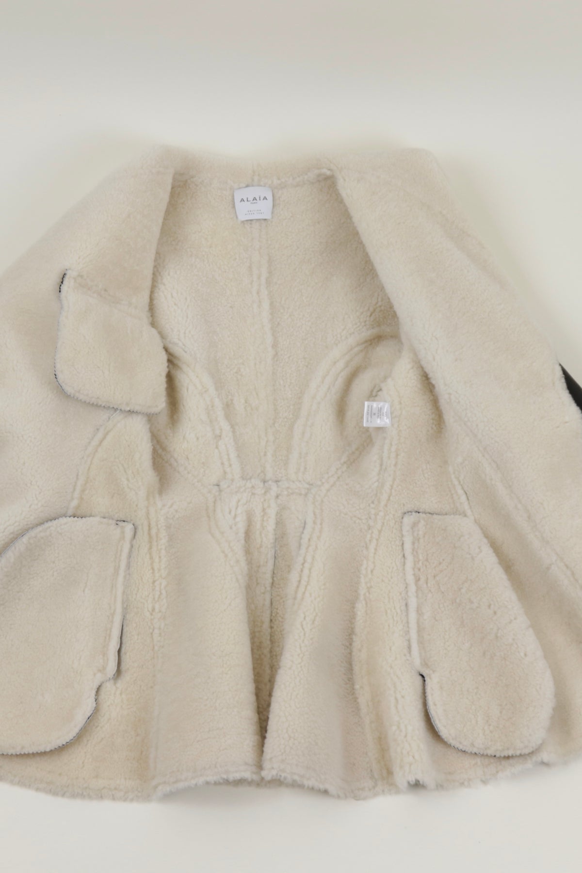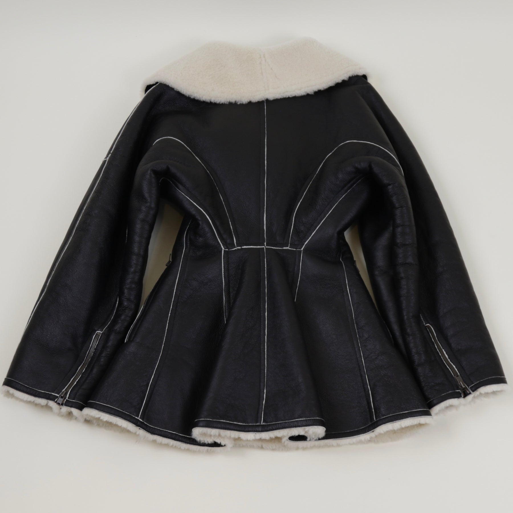A covetable style for longtime Alaïa devotees, this black coat comes from the label's archival Editions line. Soft black lambskin – a favored material of the label and one of the most supple leathers – is balanced by white shearling accents and meticulous topstitching. The fitted waist and wide lapels are also brand signatures.