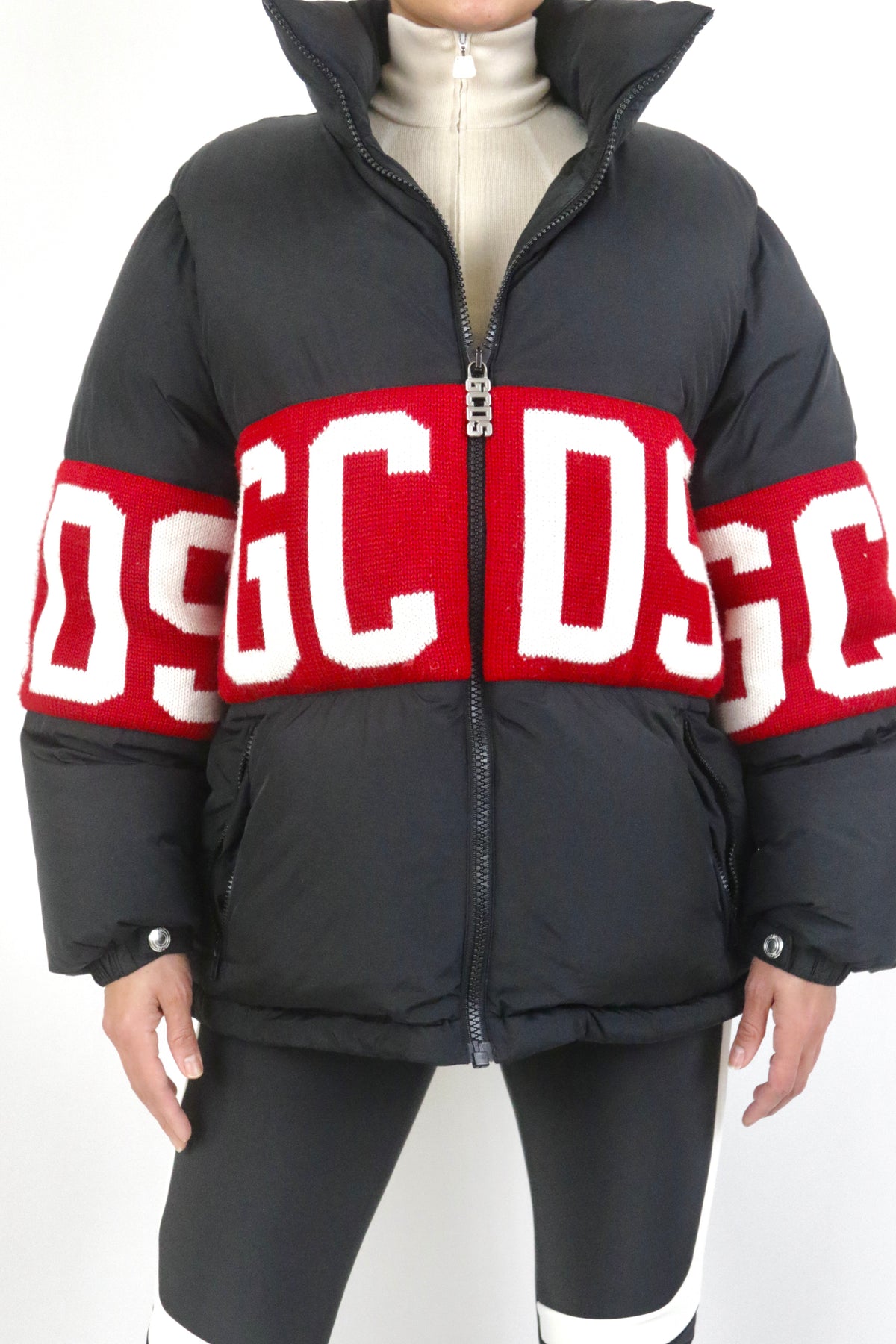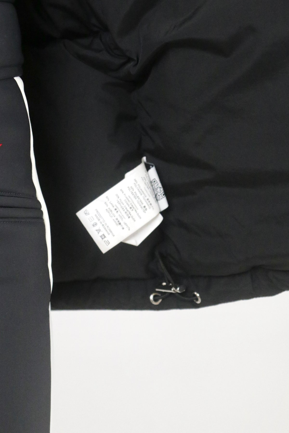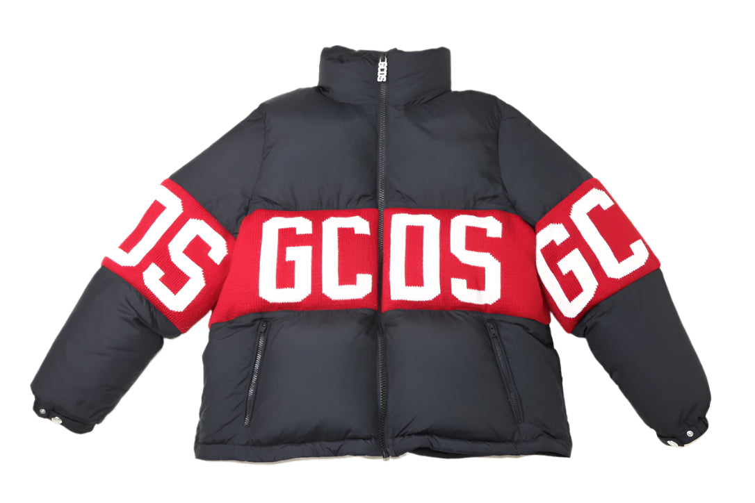 Black and red puffer logo jacket print to the front and rear. Feather down fill. Color-block, padded design with front zip fastening and logo zipper. Two side zip-fastening pockets. High neck. Long sleeves. Composition: 58% Polyamide, 42% Polyester; Lining 58% Polyamid, 42% Polyester; Fill 80% Down, 20% Duck Feathers; Embellishment 50% Acrylic, 50% Wool.