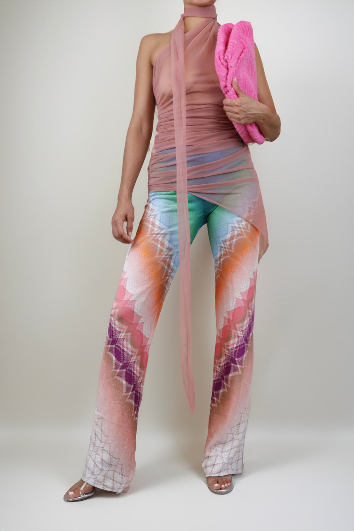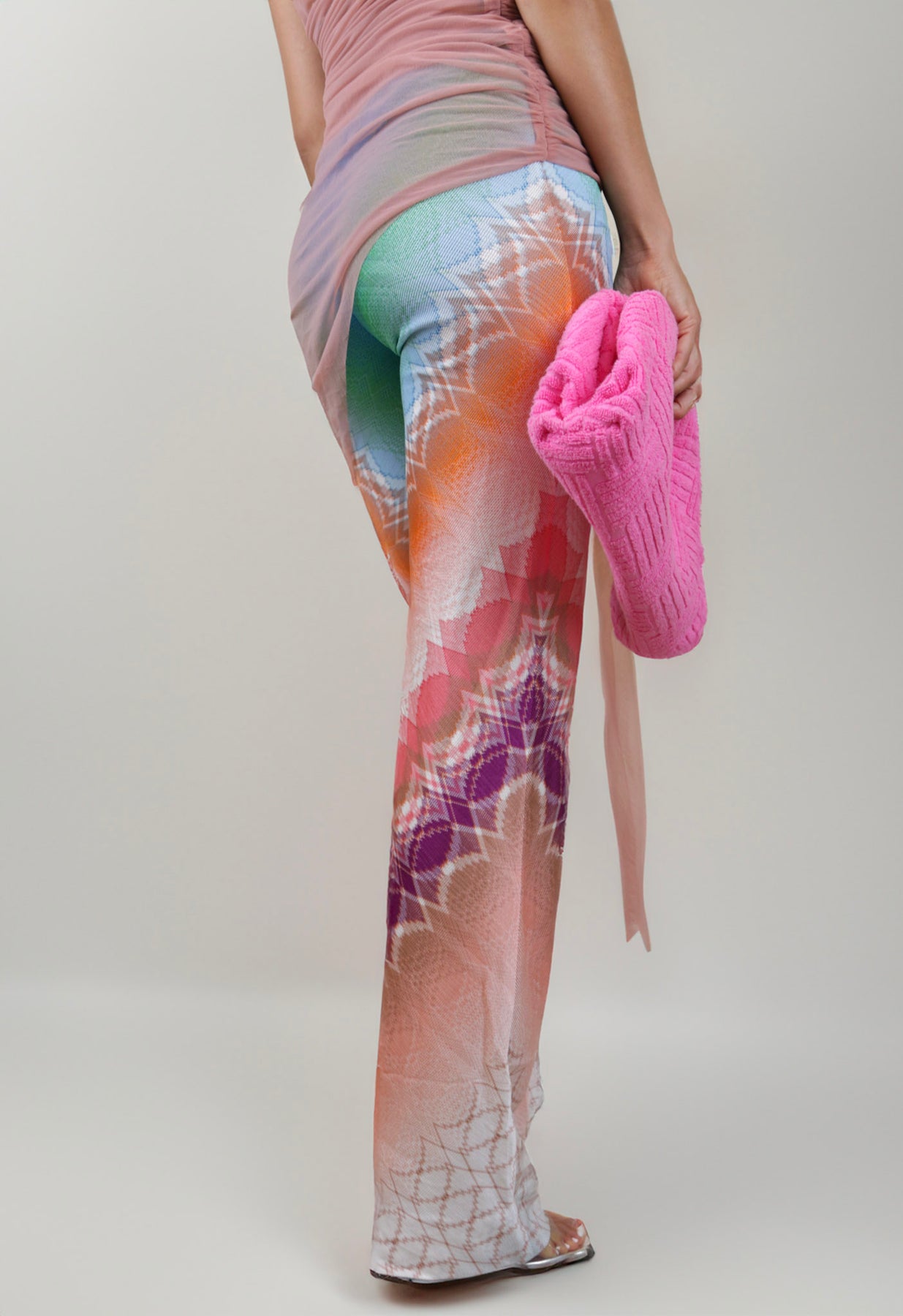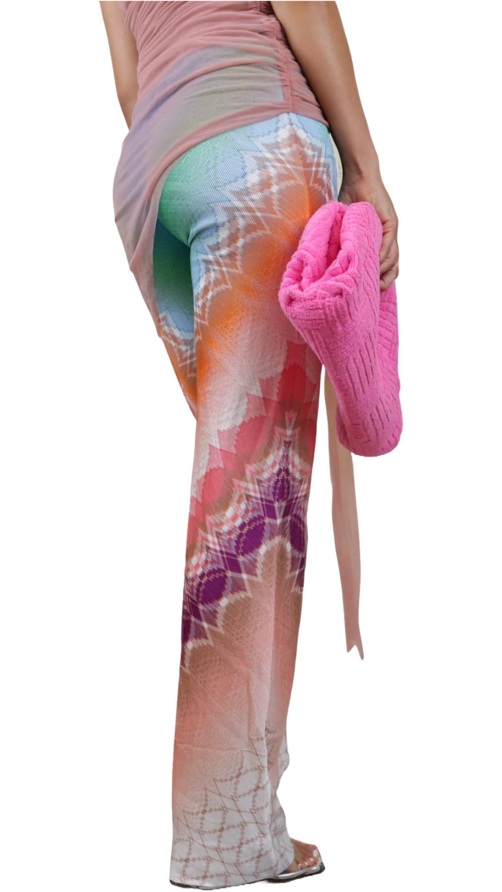 These Missoni multicolored, kaleidoscope-patterned pants are designed to catch the eye, featuring an intricate geometric print that radiates in hues of green, orange, pink, and purple. The high-waisted silhouette flatters your figure, while the soft, stretchy fabric ensures comfort and ease of movement. Perfect for making a bold statement, whether you're dressing up for a night out or adding a splash of color to your everyday look.