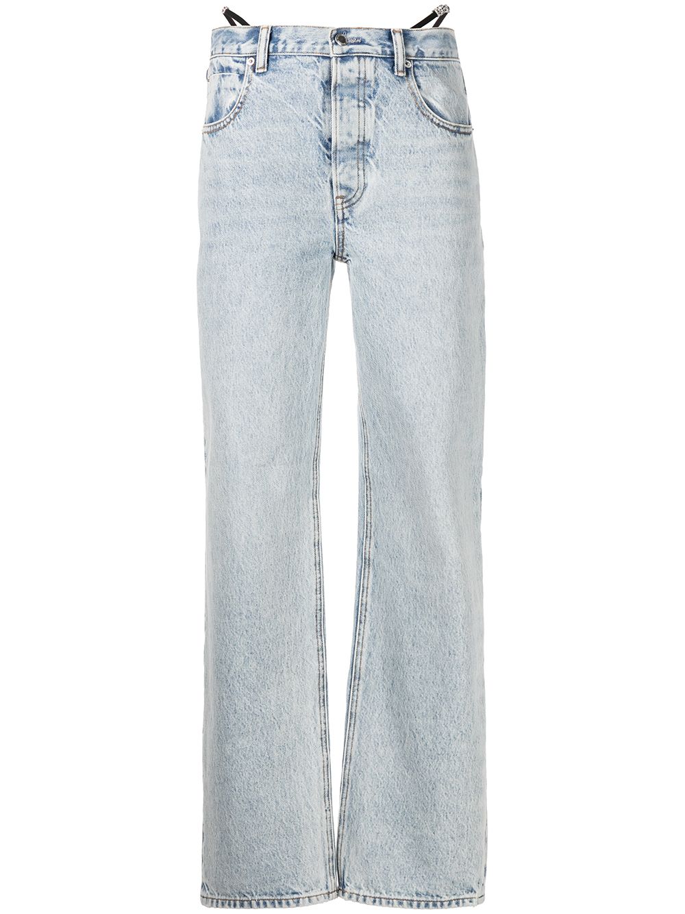 Low rise straight jeans from Alexander Wang crated in Pebble Beach blue cotton denim featuring an visible diamante embellished thong trim, a distressed effect and a regular fit and length.