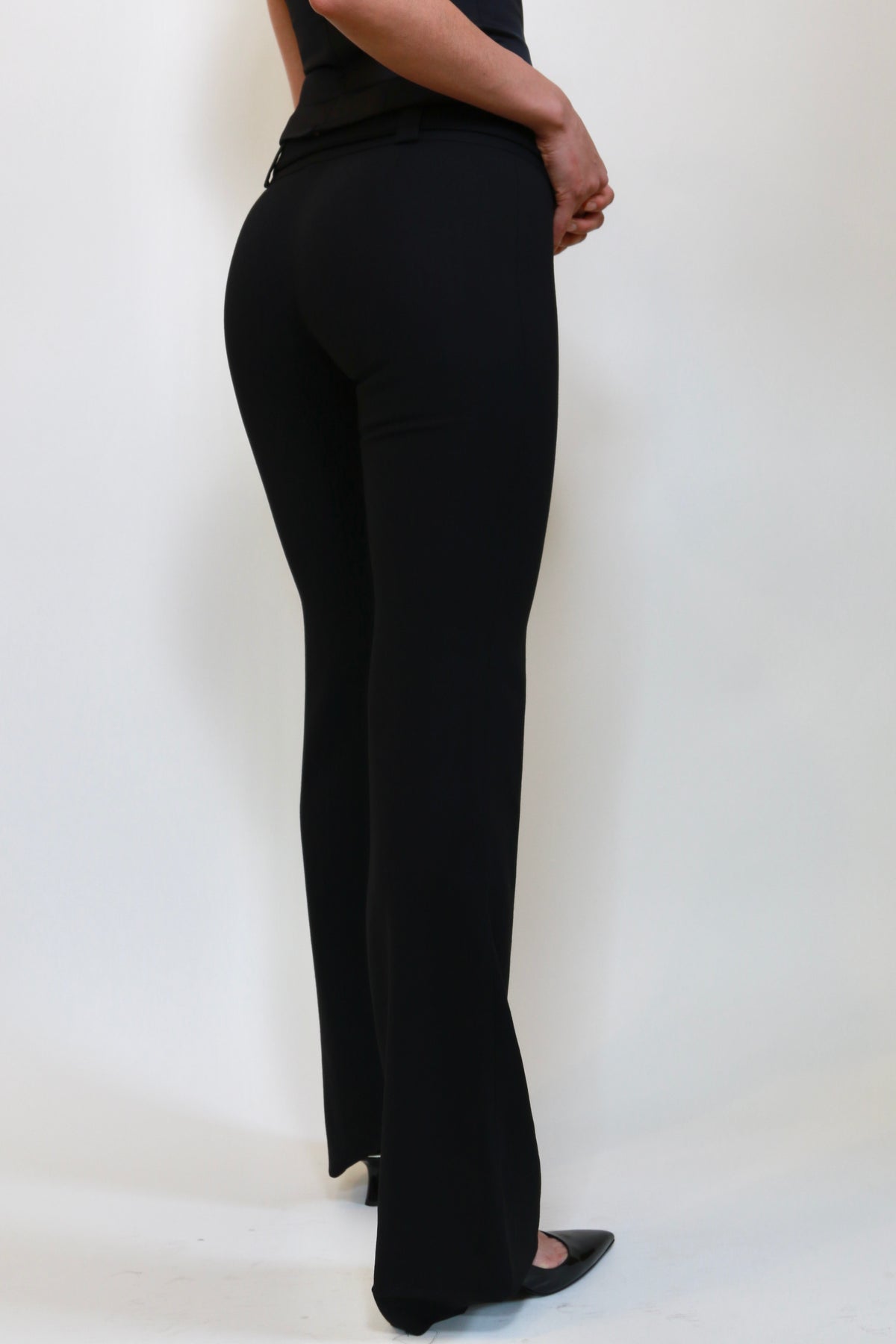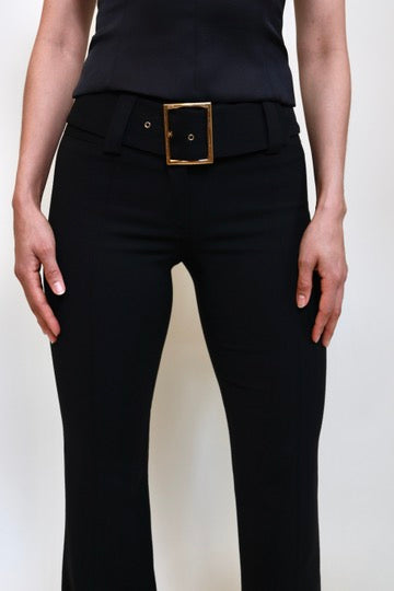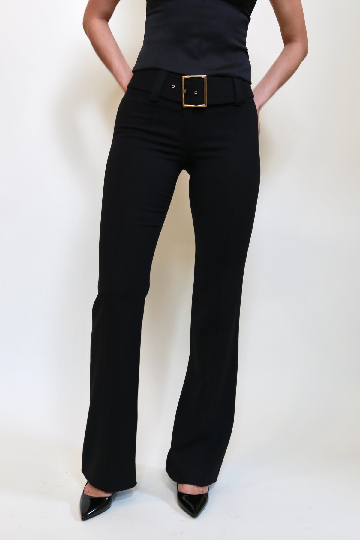 These vintage Dolce & Gabbana trousers are cut from a thick black crepe fabric that makes them wearable for work or a night out. The large belt with a rectangular golden buckle is very reminiscent of the Y2K era and is removable.