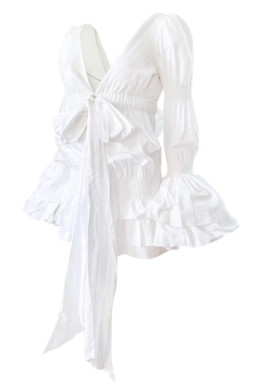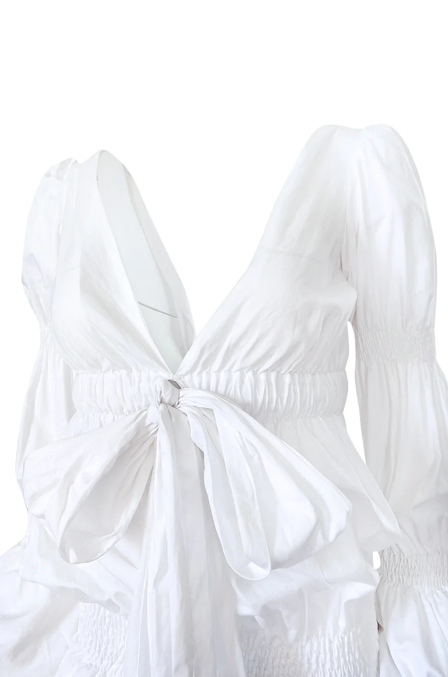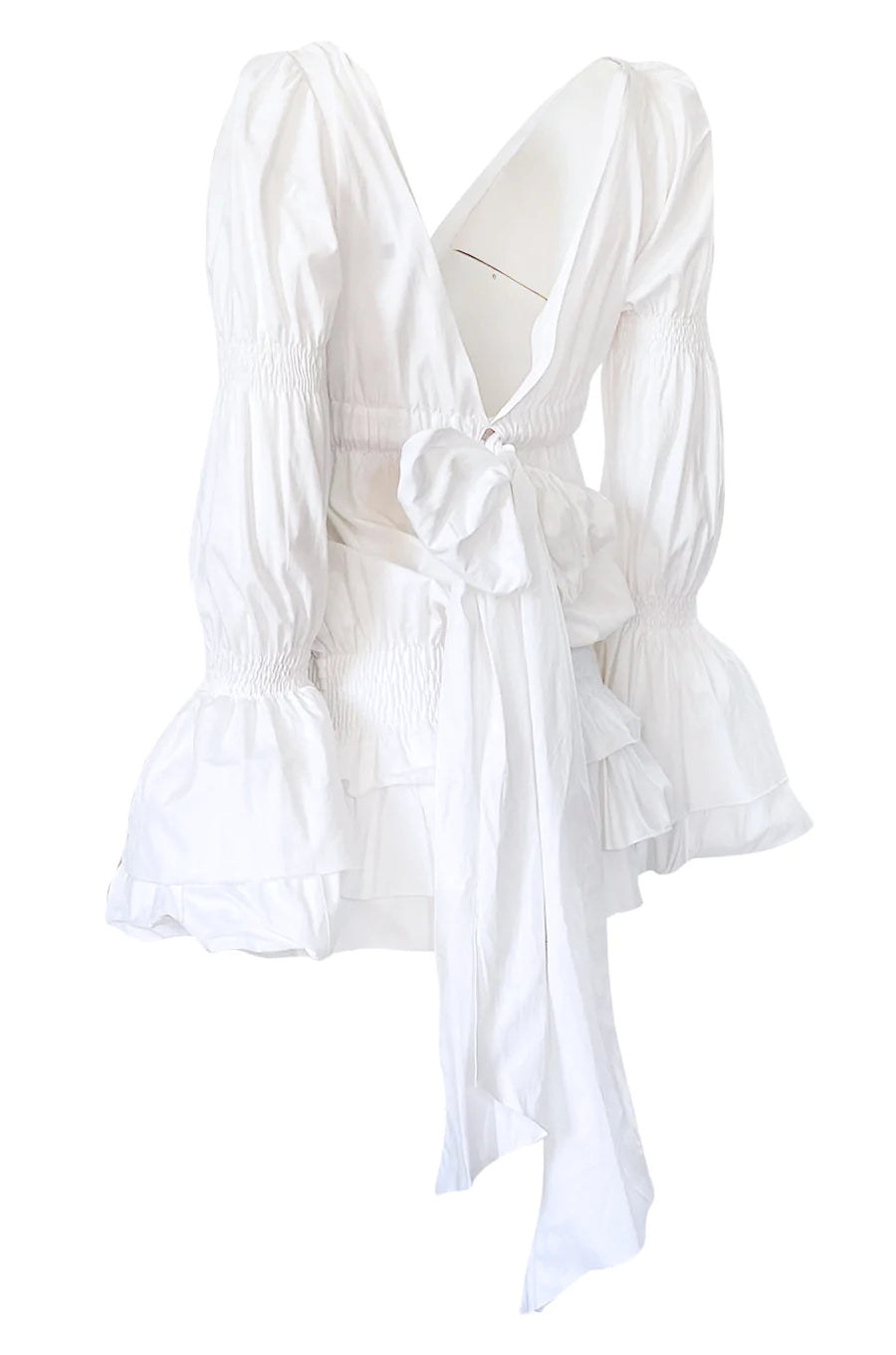 Worn by Carmen Kass on the Spring 2006 runway, this Roberto Cavalli dress is the dream dress for that summer in Italy. It is made from a crisp white cotton and has scrunching details along the body and the arms of the dress to offer the grandeur of a Victorian dress without the length. The hip scrunch allows the dress to be worn at different lengths while the plunging neckline balances the fullness of the sleeves. Pair perfectly with your favorite espadrilles or sneakers for a day to night look.