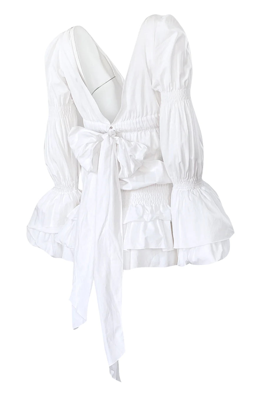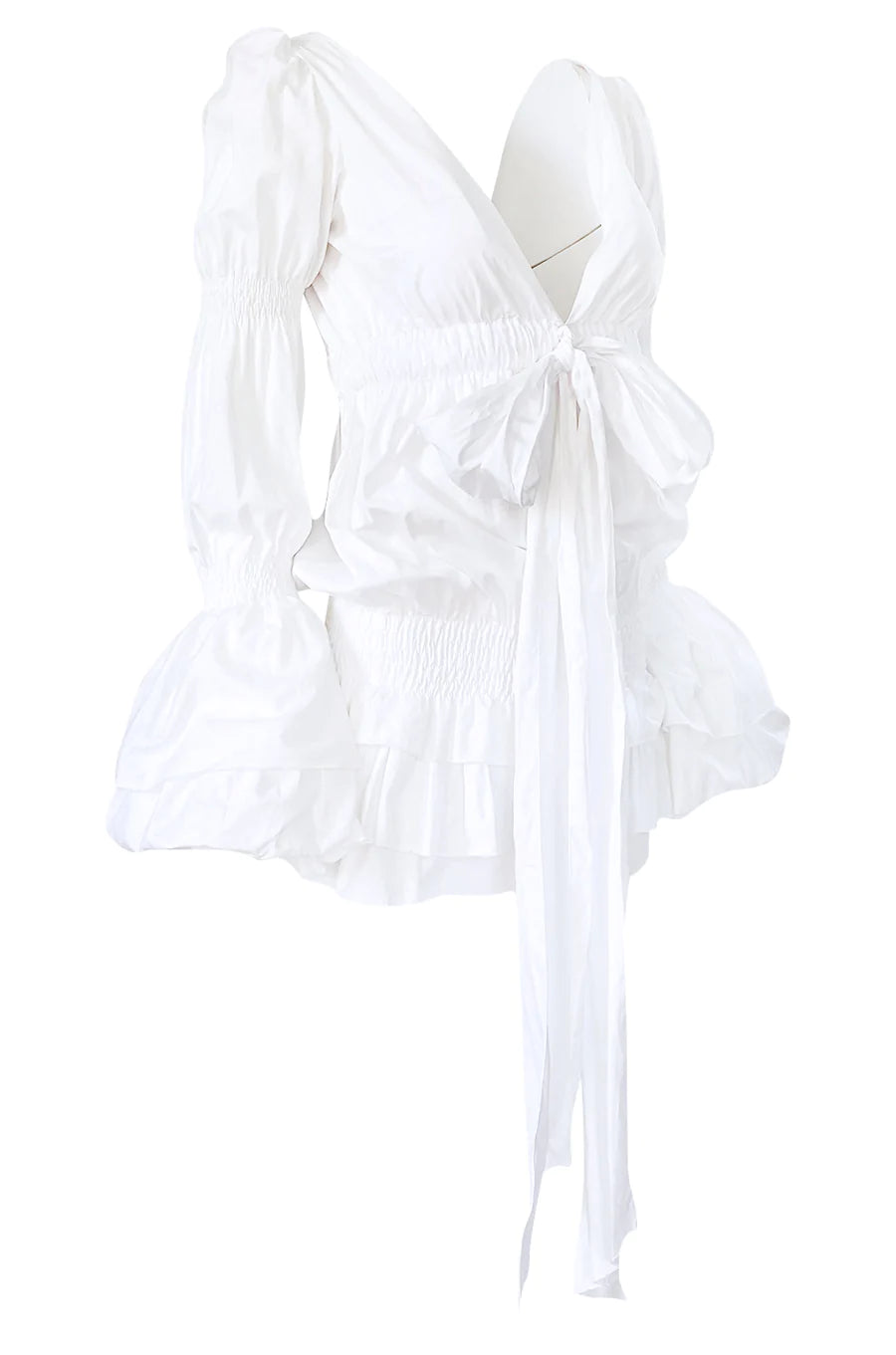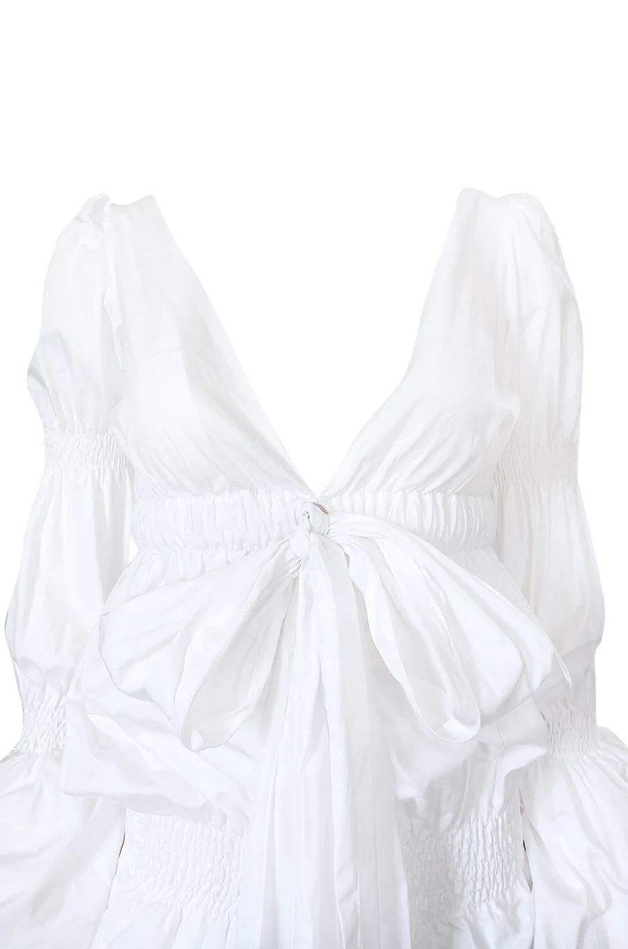 Worn by Carmen Kass on the Spring 2006 runway, this Roberto Cavalli dress is the dream dress for that summer in Italy. It is made from a crisp white cotton and has scrunching details along the body and the arms of the dress to offer the grandeur of a Victorian dress without the length. The hip scrunch allows the dress to be worn at different lengths while the plunging neckline balances the fullness of the sleeves. Pair perfectly with your favorite espadrilles or sneakers for a day to night look.