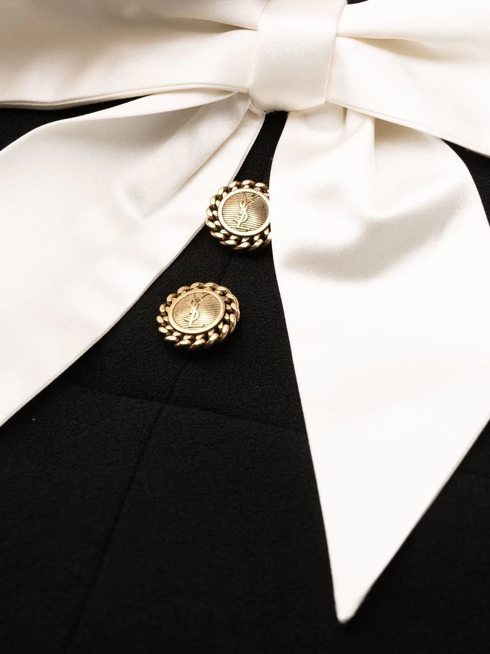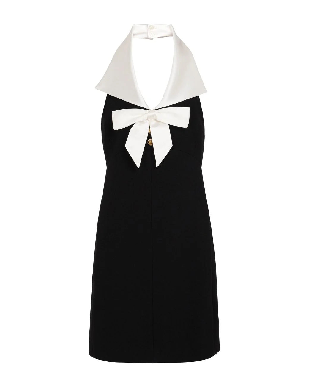 Black silk/wool bow-detail mini halter dress from Saint Laurent featuring spread collar, front button placket, bow detailing and halter neck.
