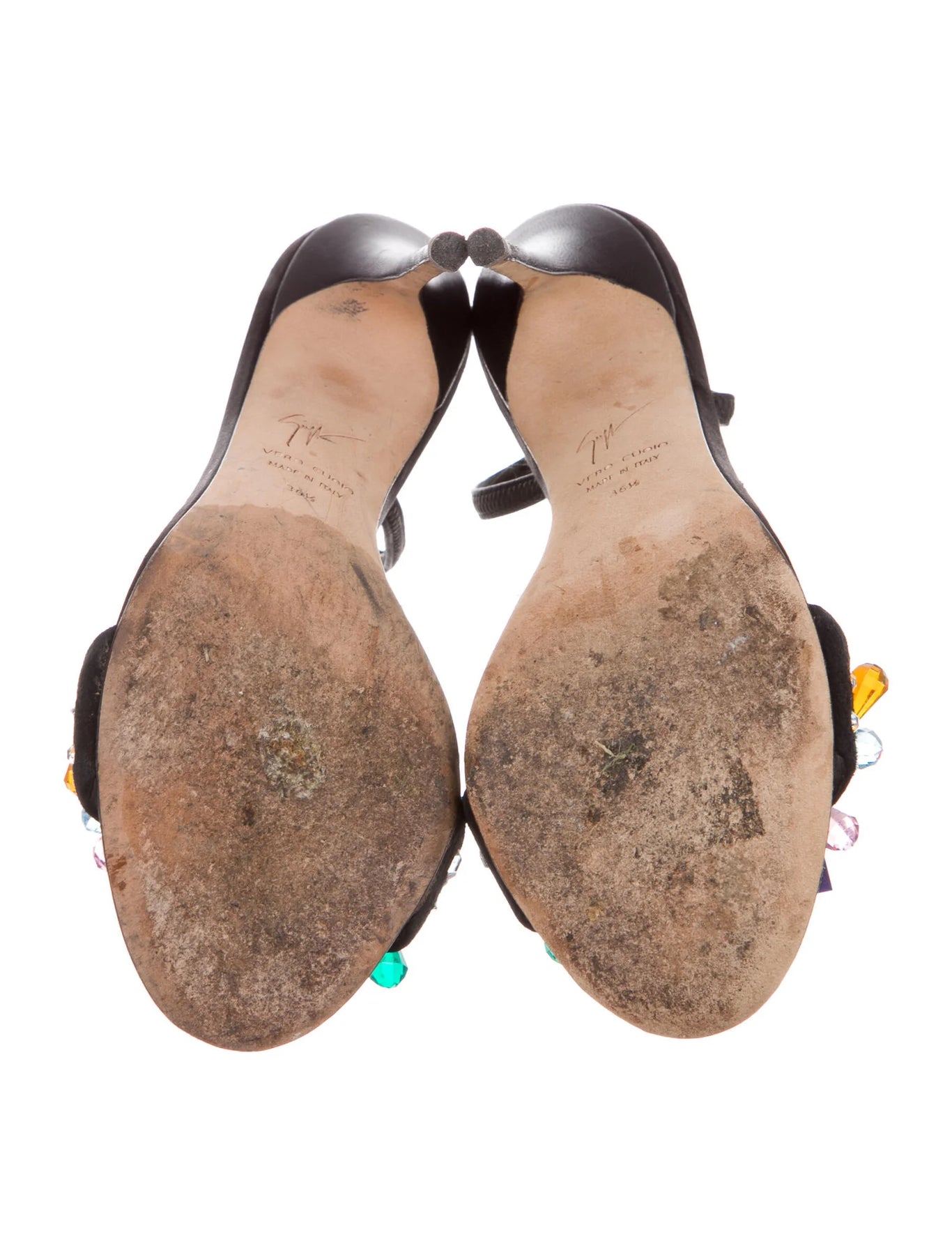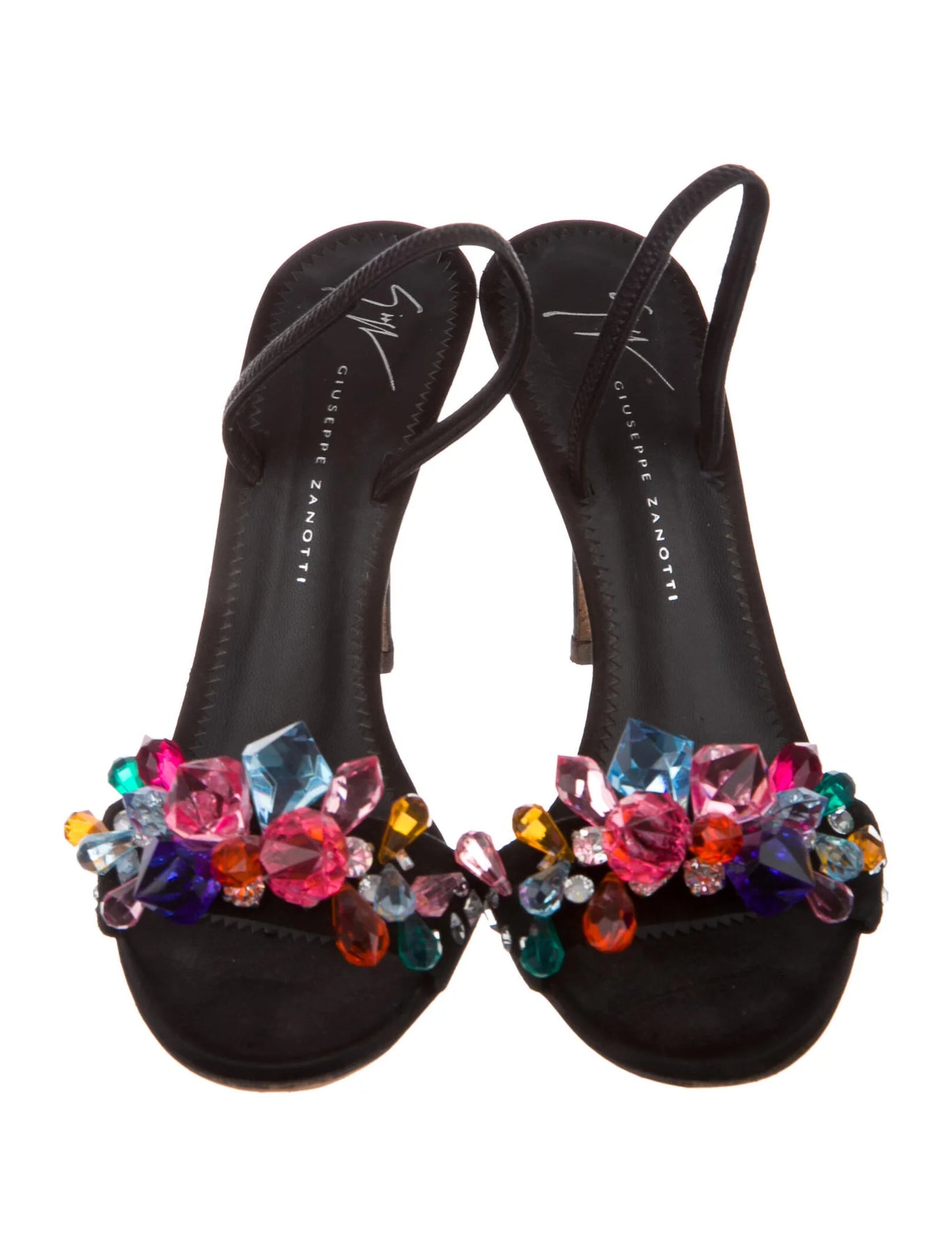 Description: Black satin sandals with multicolor crystal embellishments.