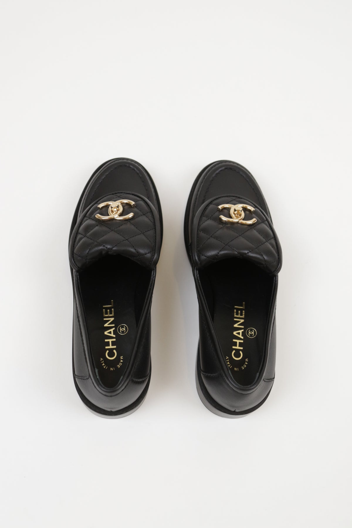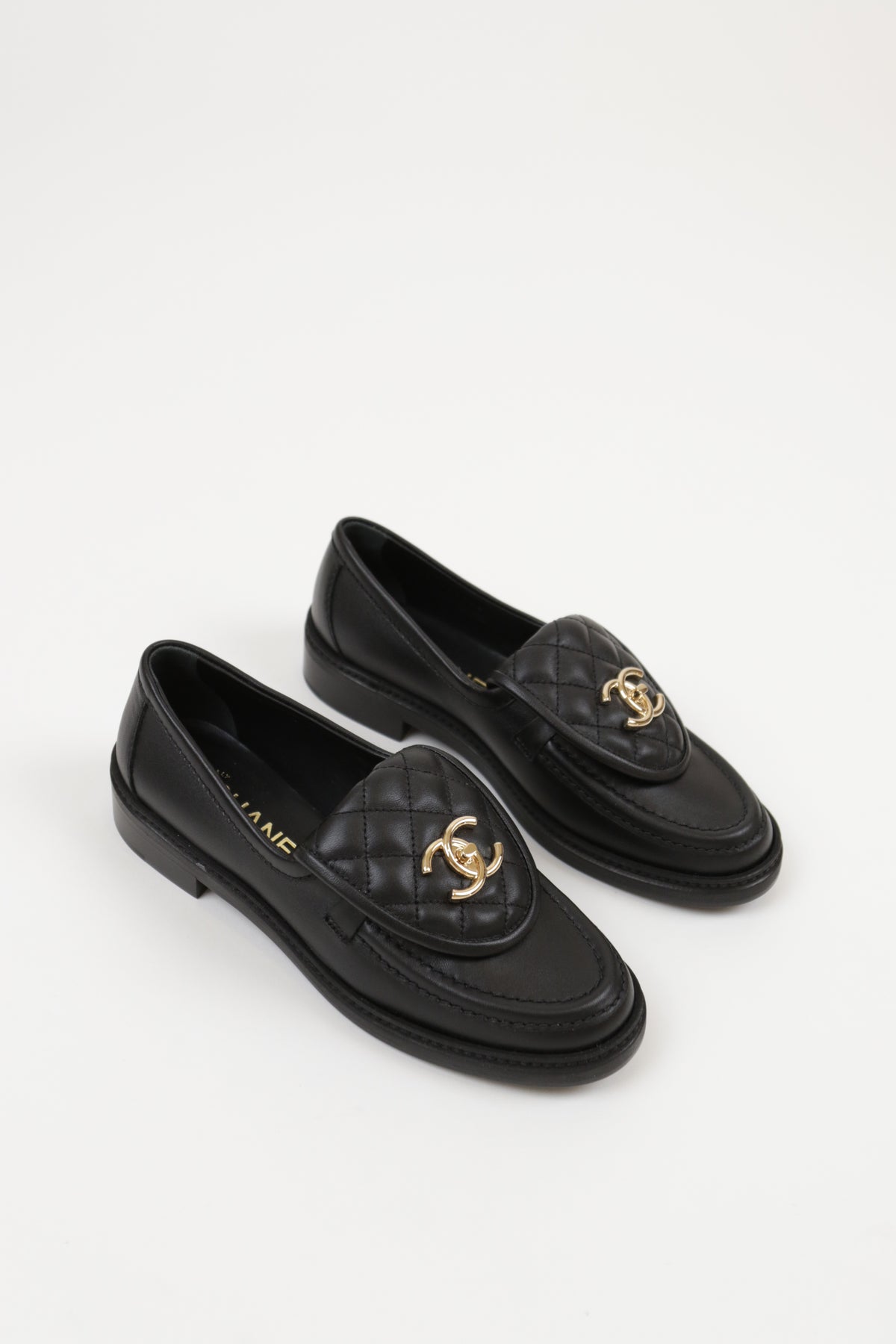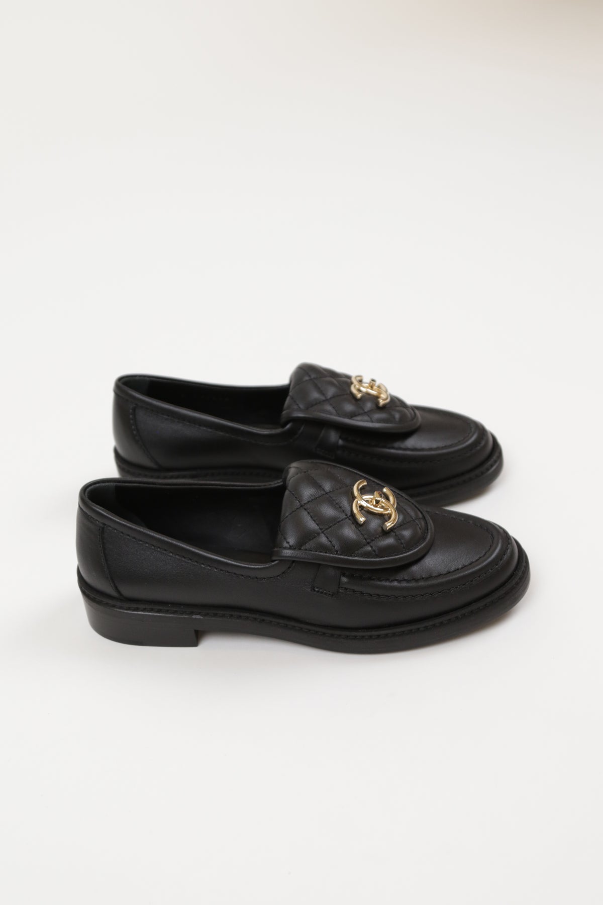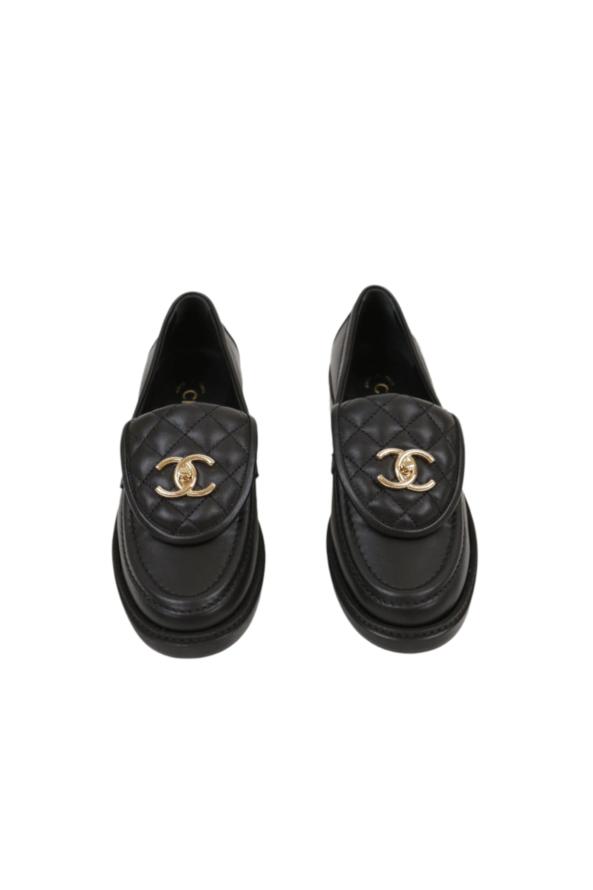CHANEL has perfected the black loafer. The exaggerated quilted tongue is an homage to the classic quilted flap. The front features a twistlock CC logo in champagne.