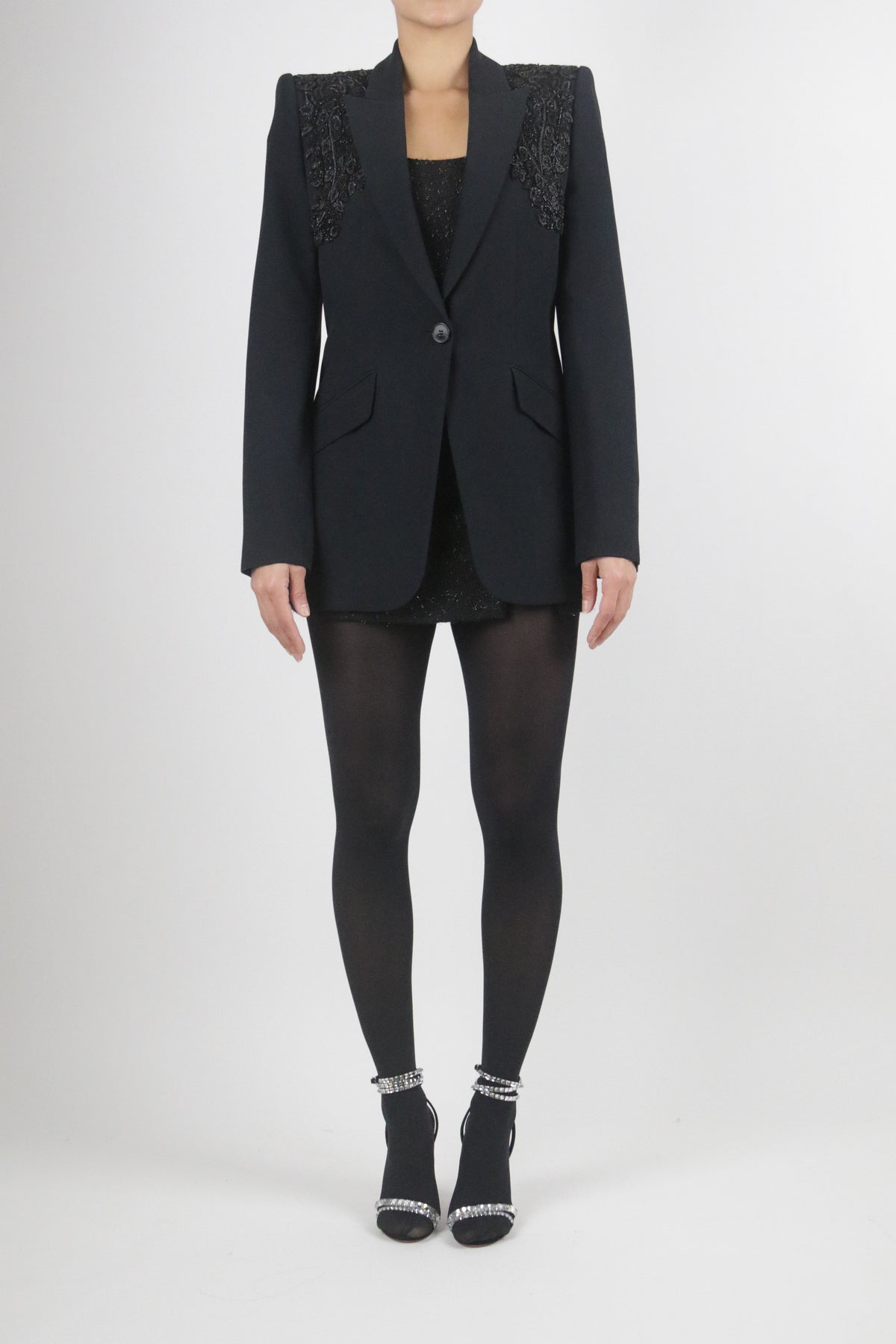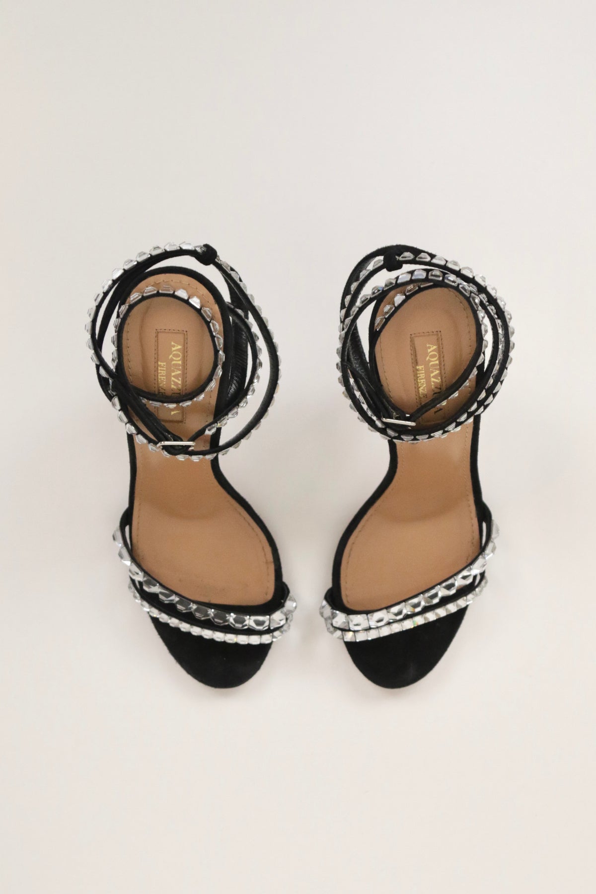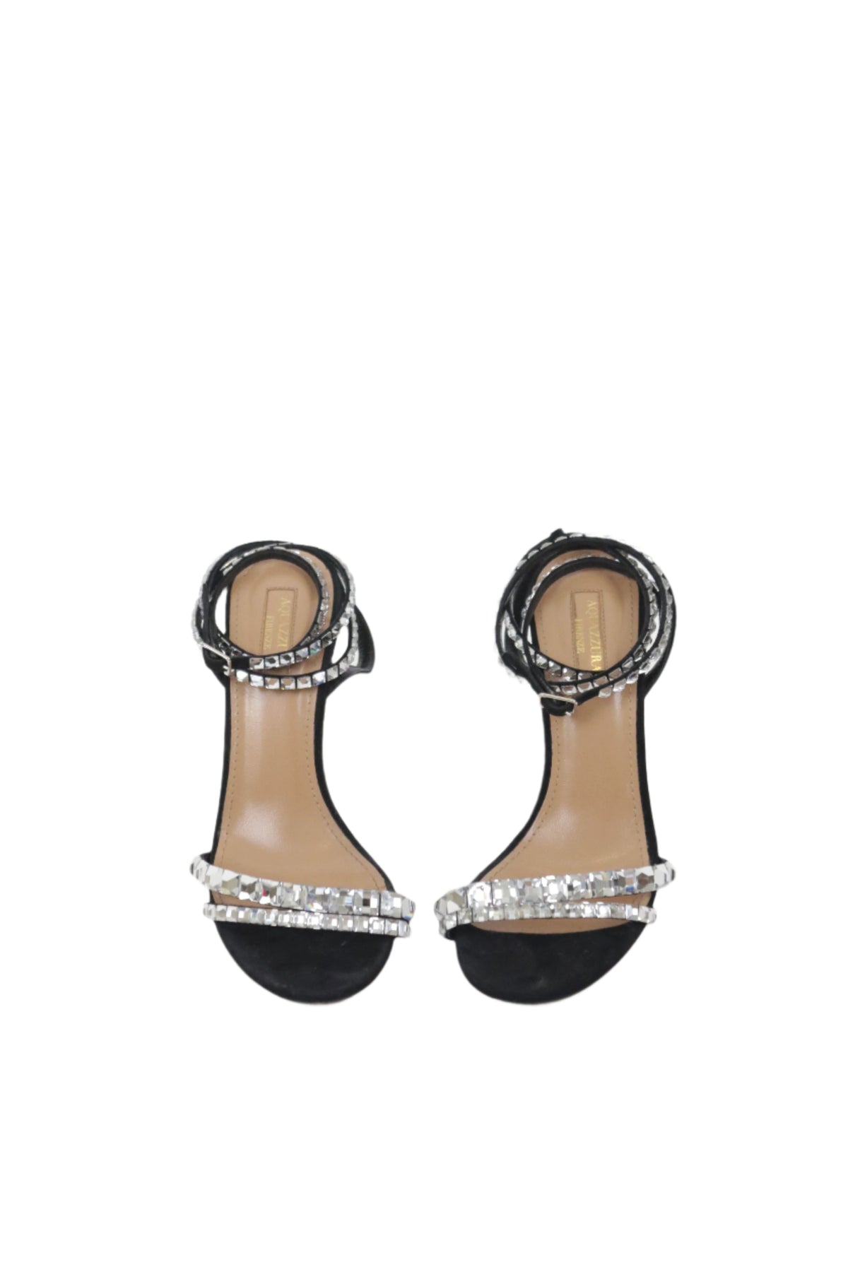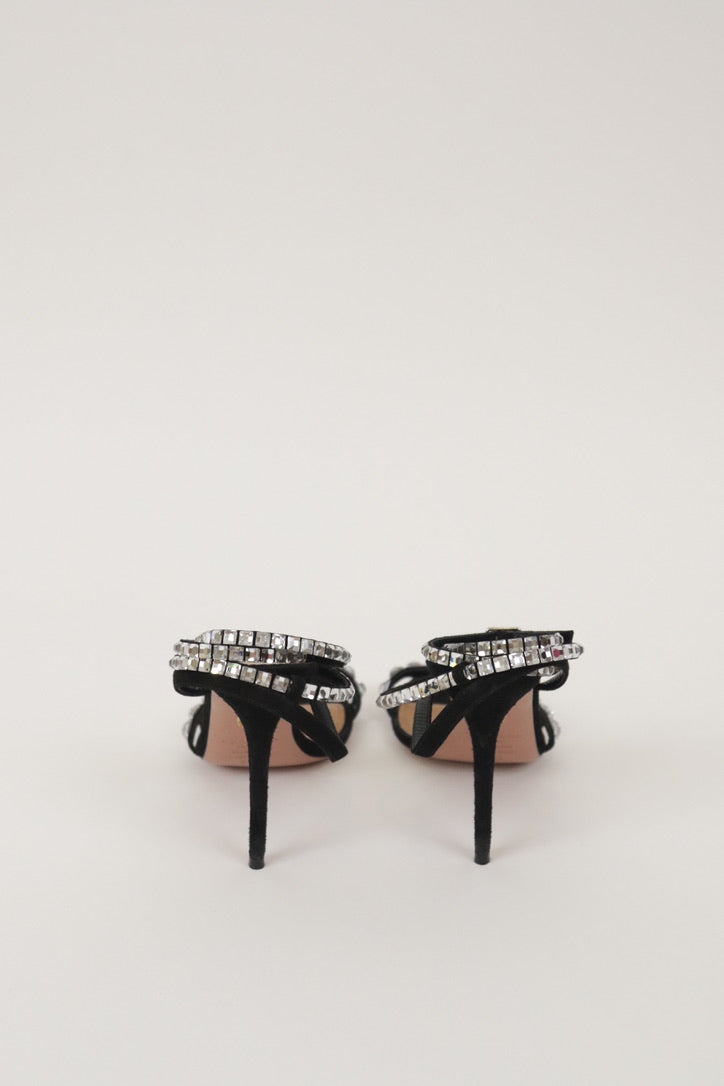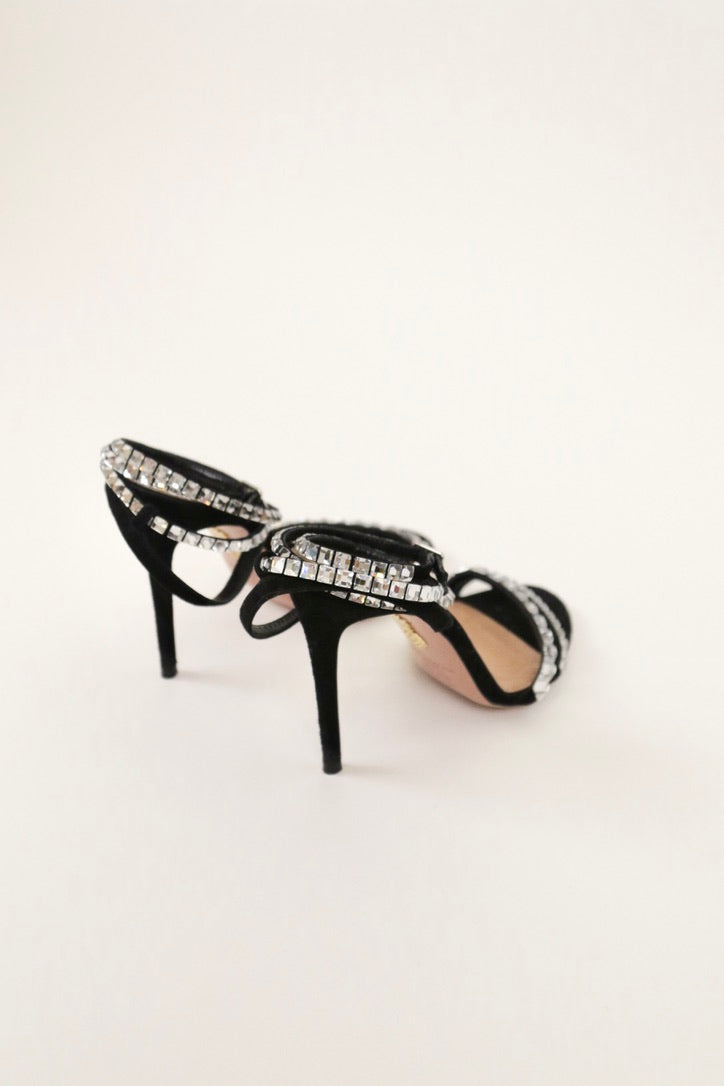 Black suede stiletto sandals with strass studded appliqués at toe and ankle straps.