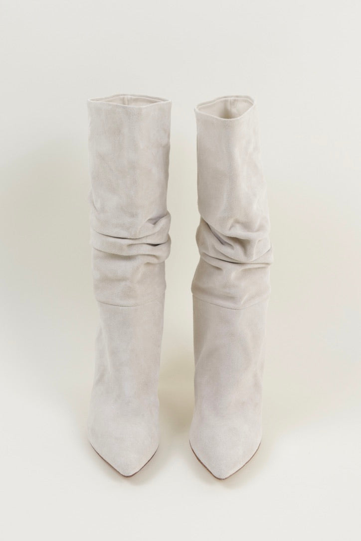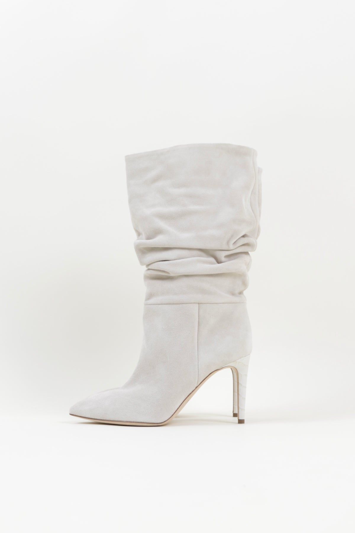 Crafted from suede in an angora-beige colourway, these slouchy suede boots are emboldened by a crocodile-effect stiletto heel.