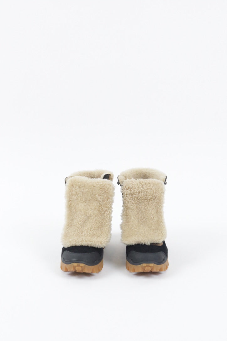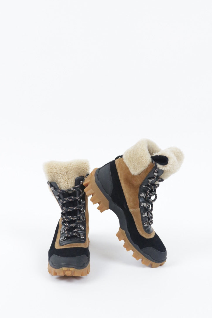 Stay warm and stylish in these Moncler shearling-lined winter boots, designed for ultimate comfort in cold conditions. Featuring a durable suede and rubber construction, these boots offer a rugged yet sophisticated look with lace-up detailing for a secure fit. The plush shearling lining extends over the cuff for added warmth and a luxurious touch. With a sturdy, treaded sole for enhanced traction, these boots are perfect for braving winter weather while maintaining an effortlessly chic aesthetic.