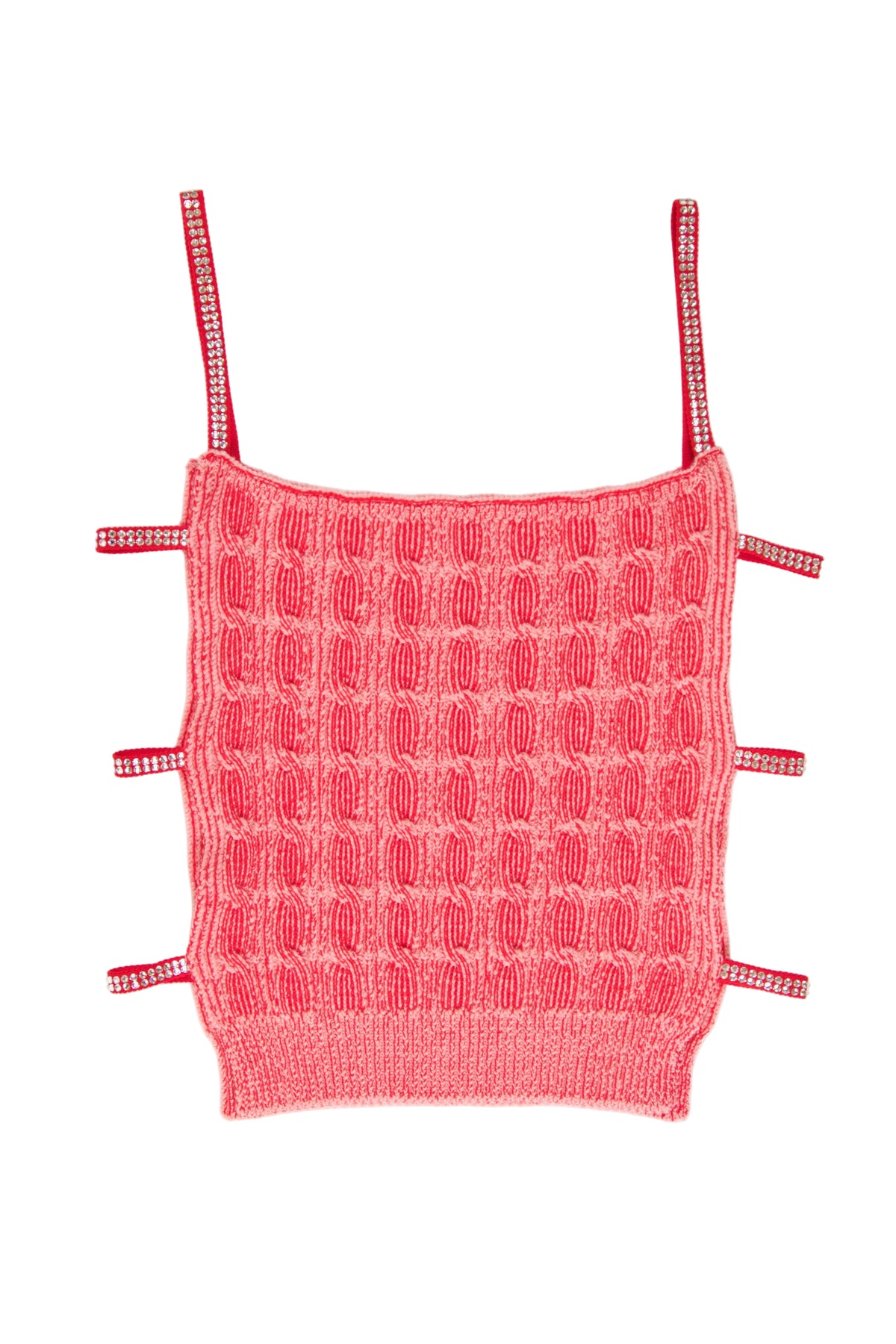 Red and pink tweed pattern tank with sides exposed and rhinestone embellished straps.