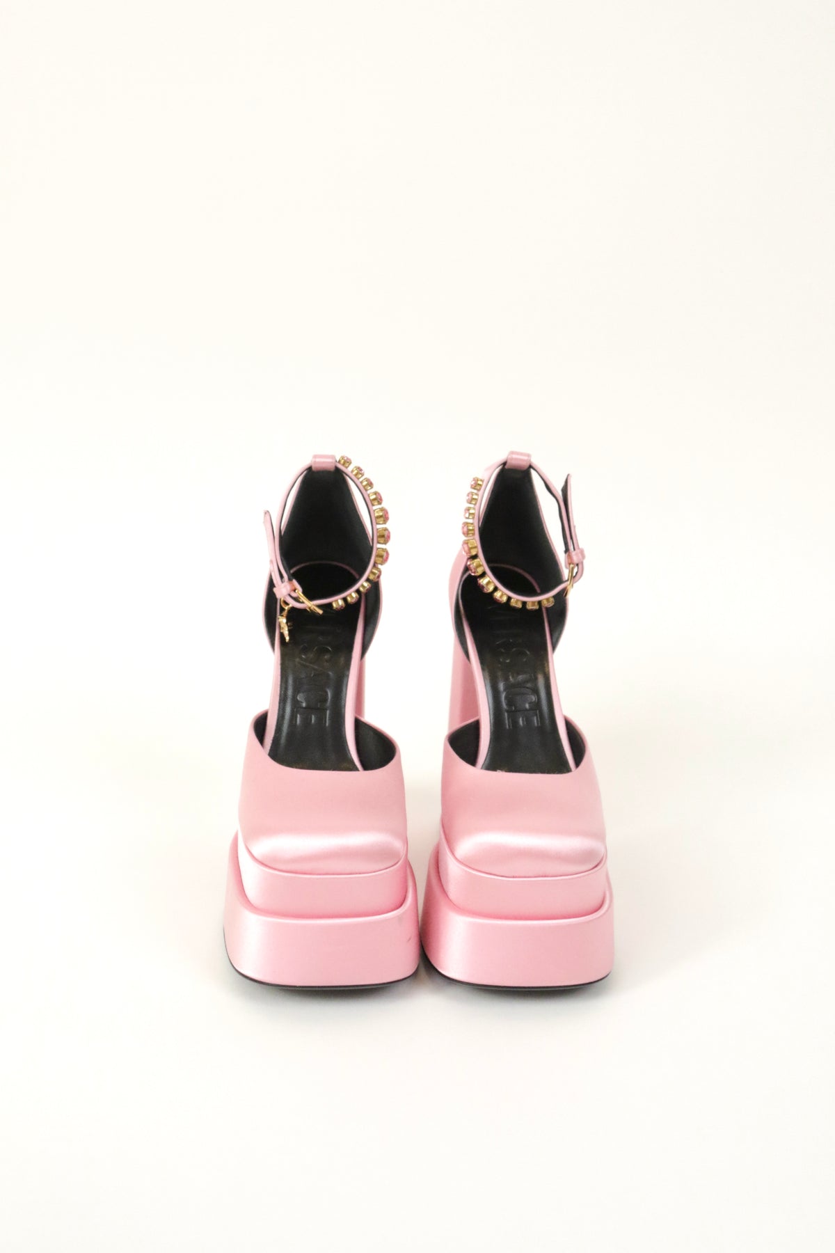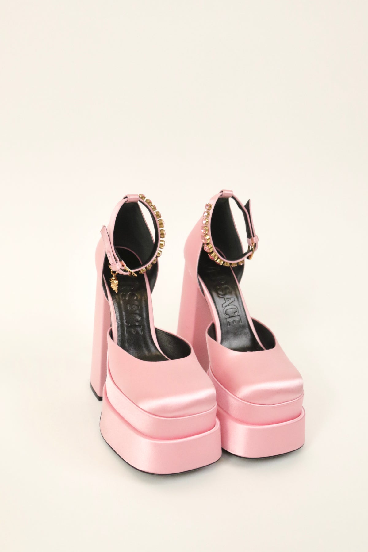 The Medusa Aevitas pumps from Versace are a lesson in statement glamour. They're made from pink satin with towering double platform soles and slender ankle straps that are embellished with crystals and Medusa charms.