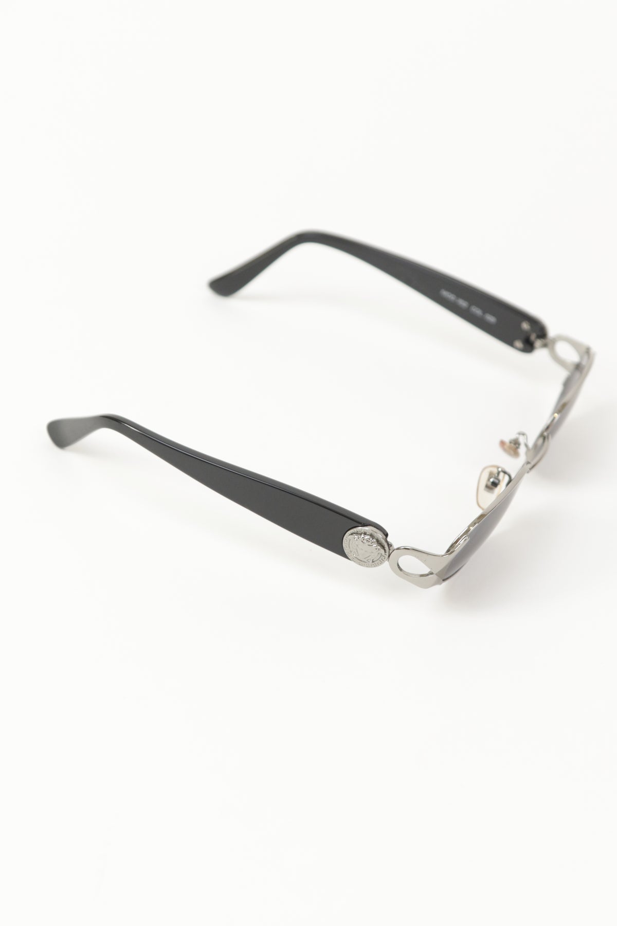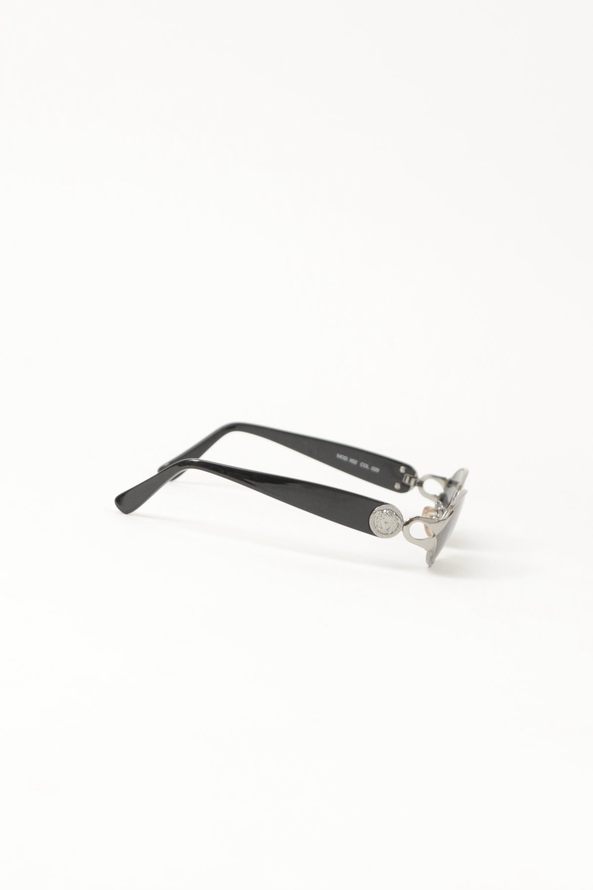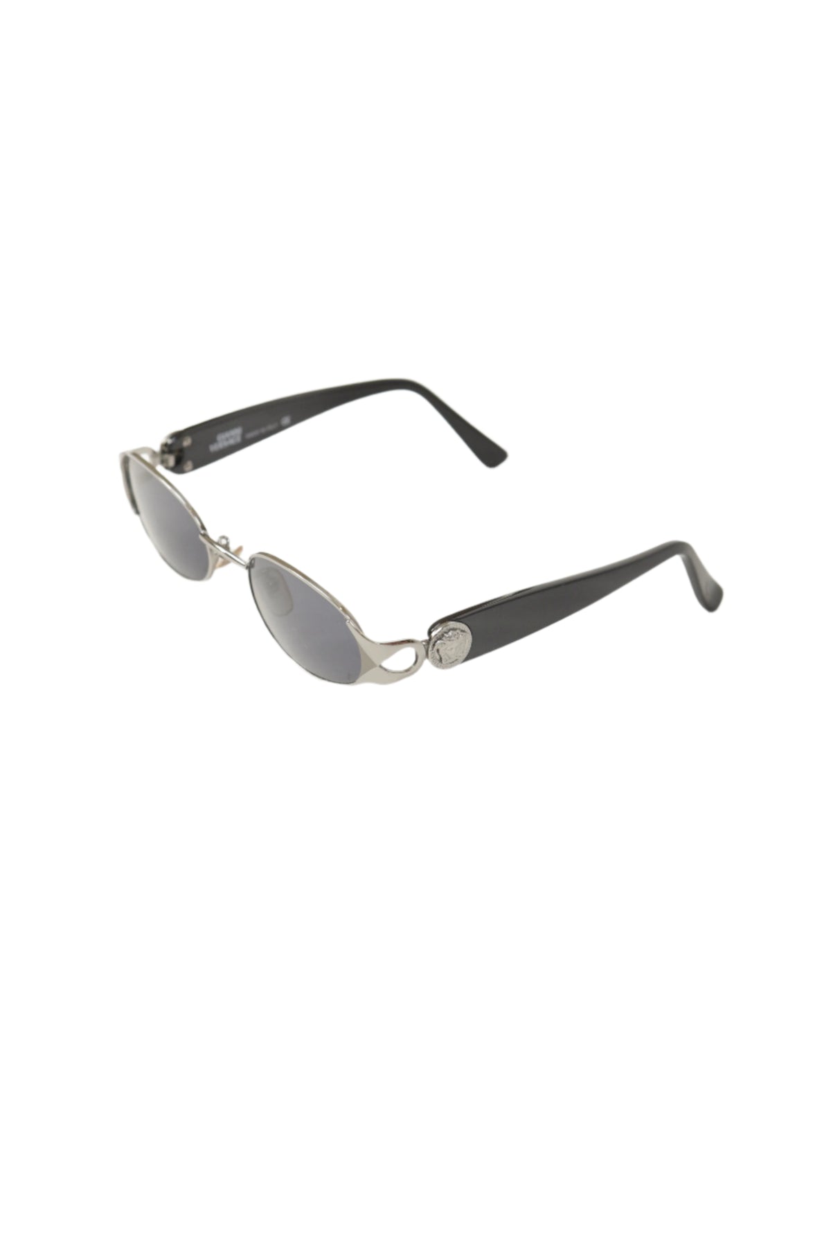 Channel effortless ’90s-inspired luxury with these Versace vintage oval sunglasses. Featuring a sleek metal frame with a polished silver-tone finish, these shades exude an edgy yet sophisticated aesthetic. The black acetate arms are adorned with the signature Medusa emblem, a hallmark of Versace’s bold and opulent design heritage. The dark-tinted lenses provide both UV protection and a chic, mysterious look. A timeless accessory that complements both modern and retro-inspired wardrobes. Made in Italy.
