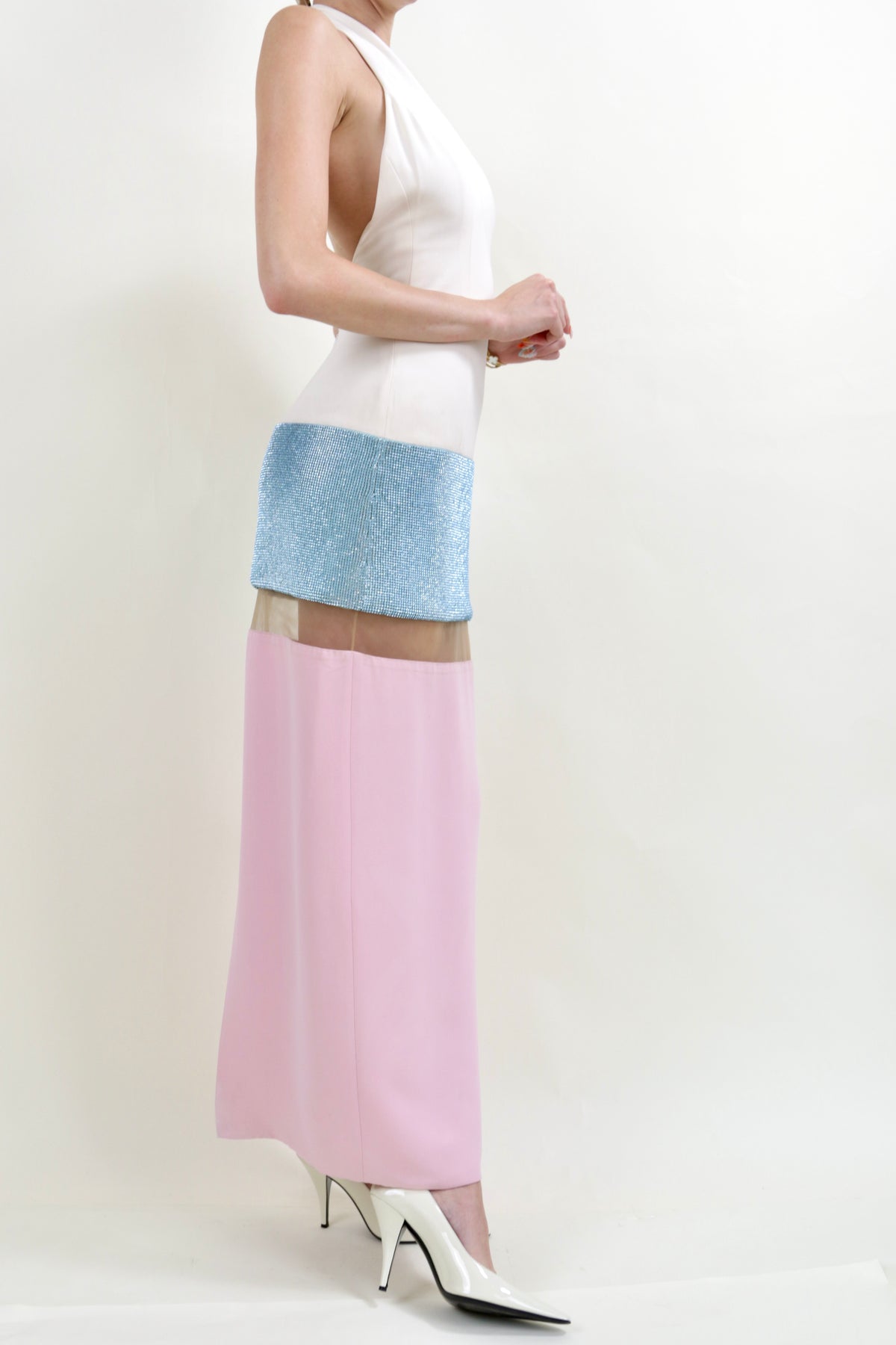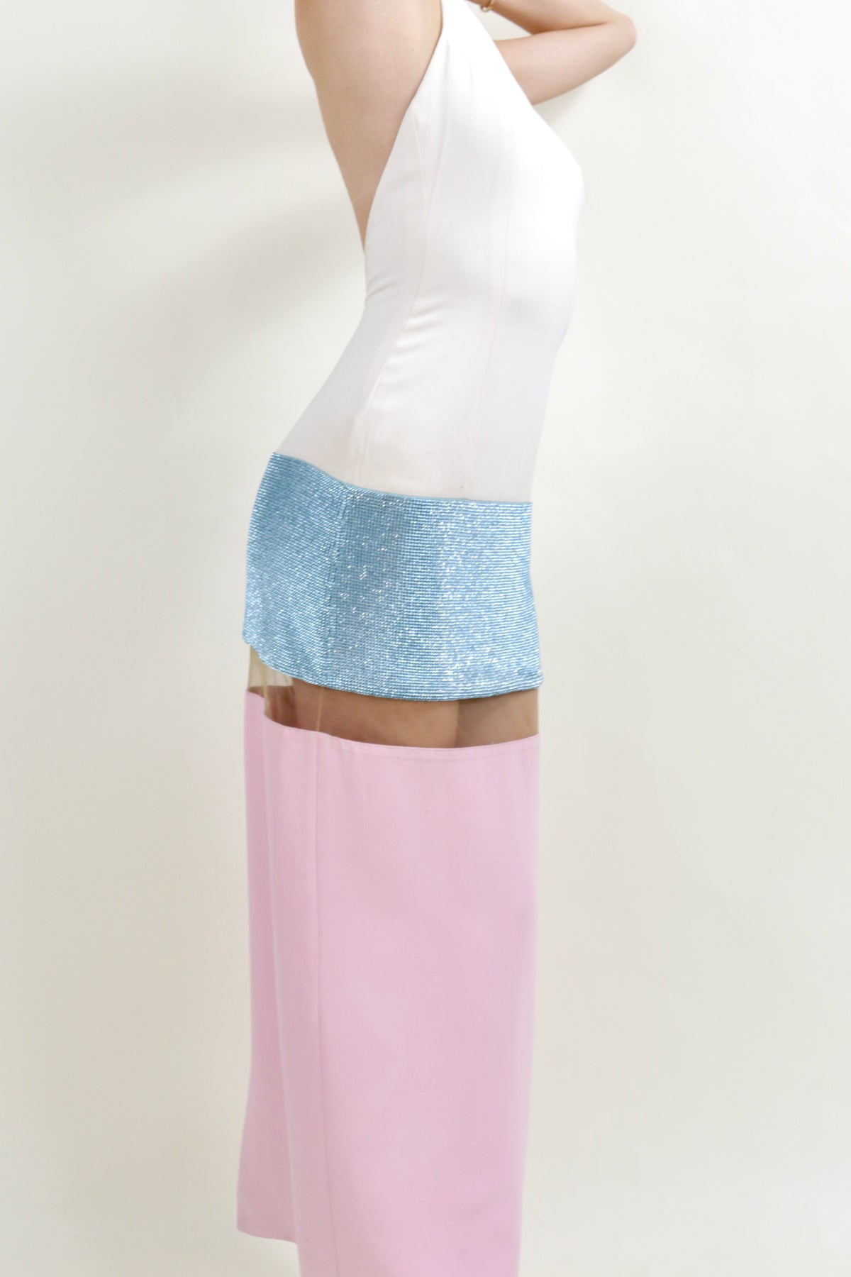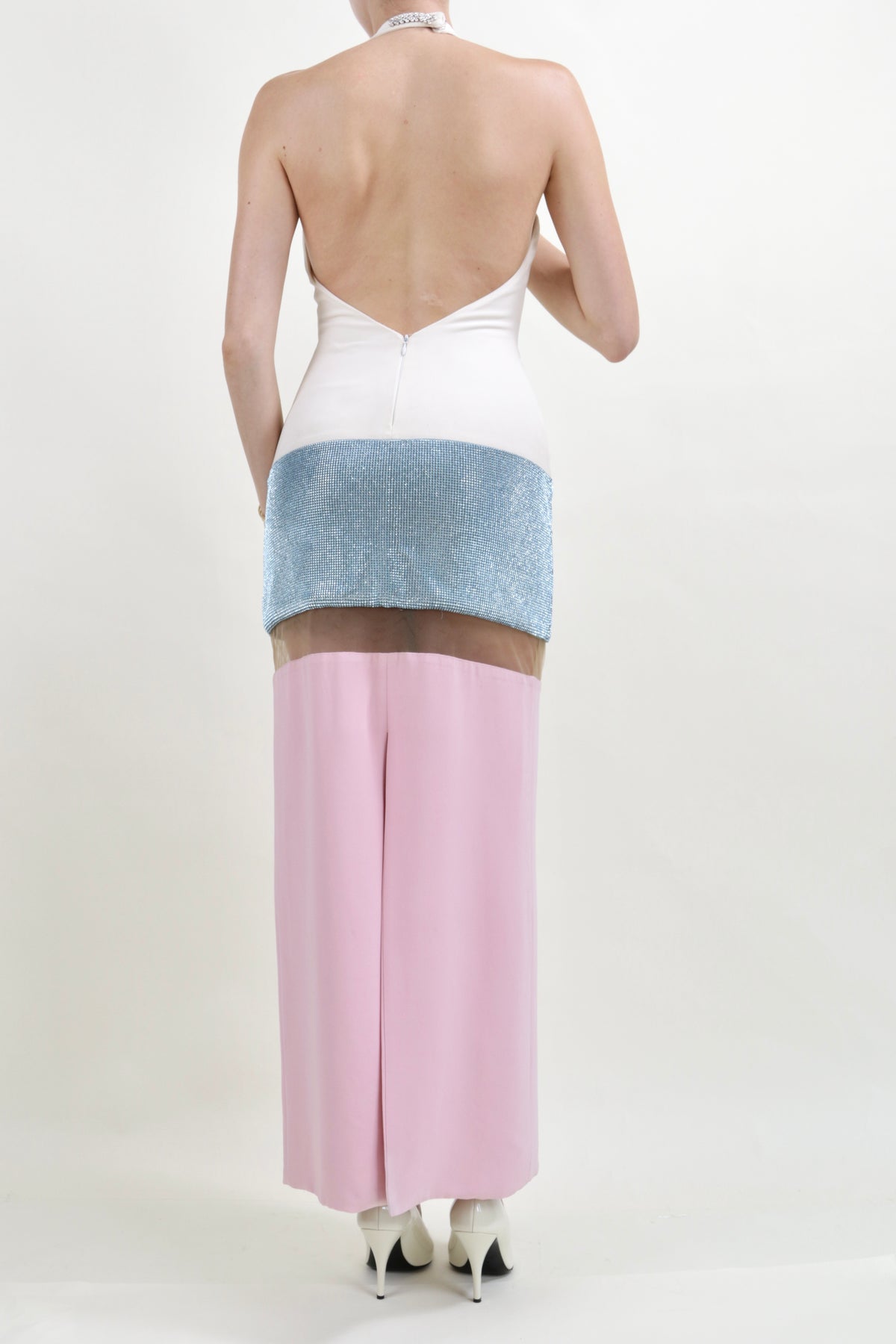 From the Versace Spring Summer 2015 collection, this vintage evening gown features large colorblock panels of white, blue, and pink with an additional sequin embellishment. A beige mesh panel cuts right underneath a blue rhinestone embellished skirt, creating the illusion of being a mini dress. It has a crystal embellishment at button neck closure.