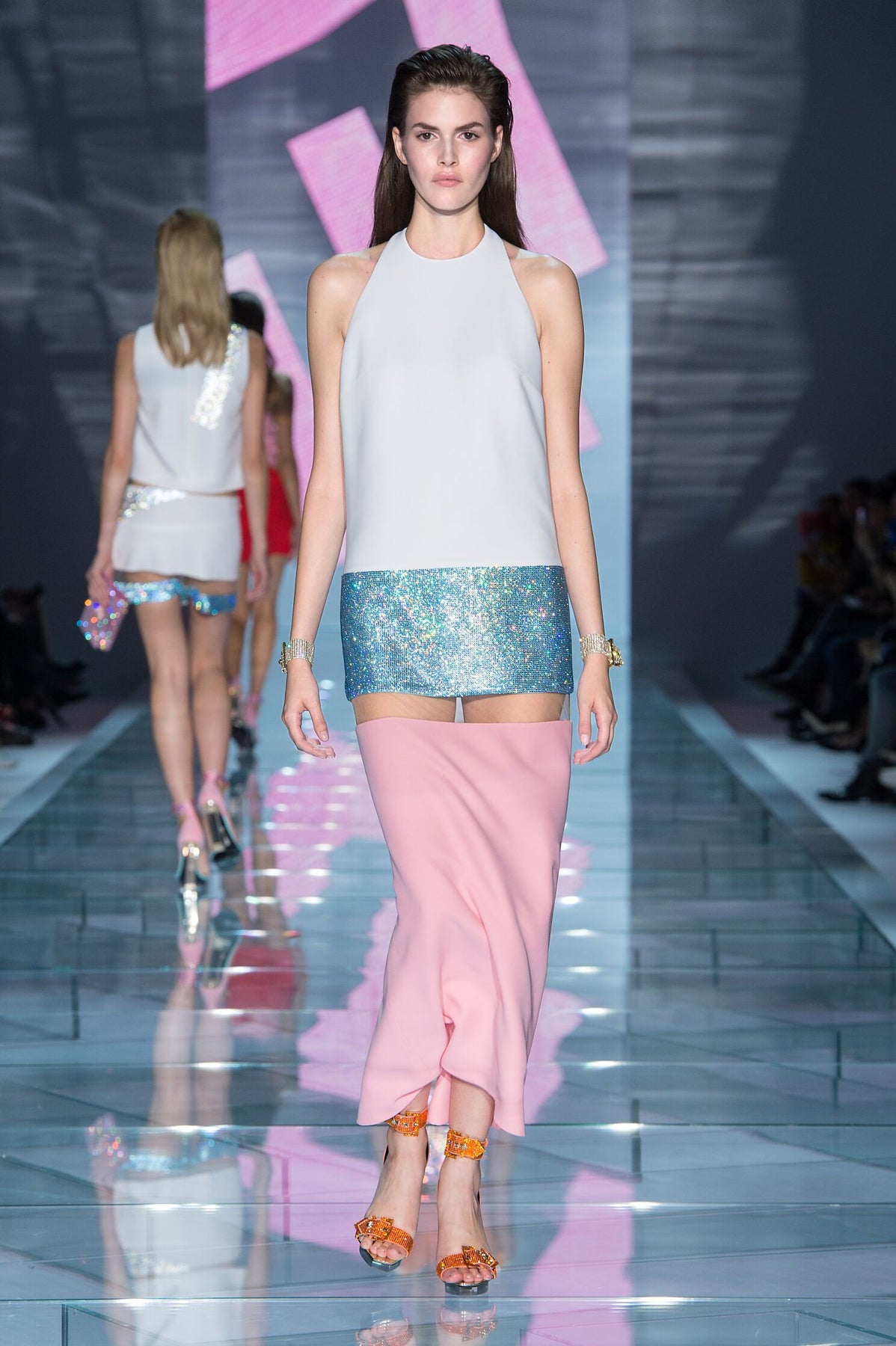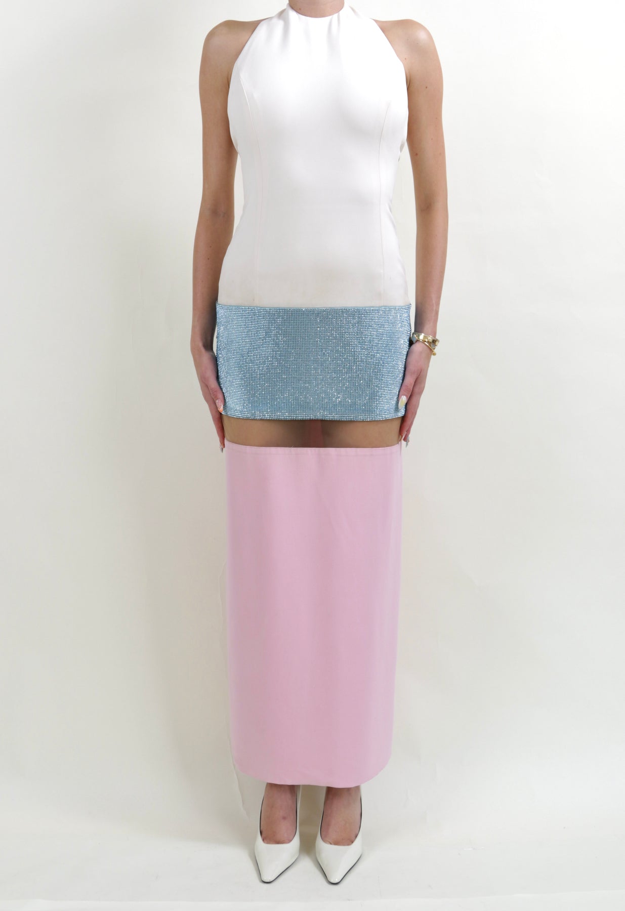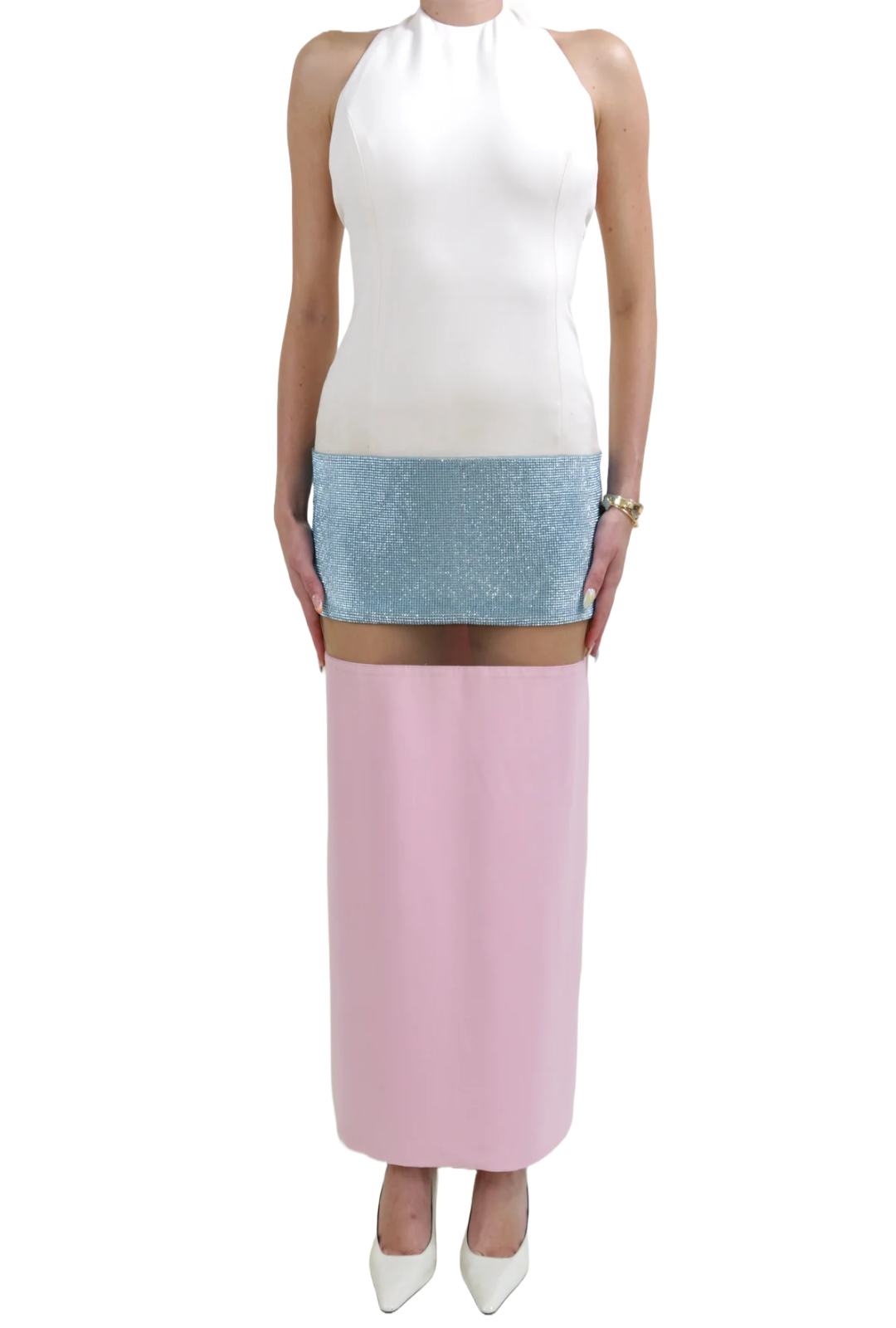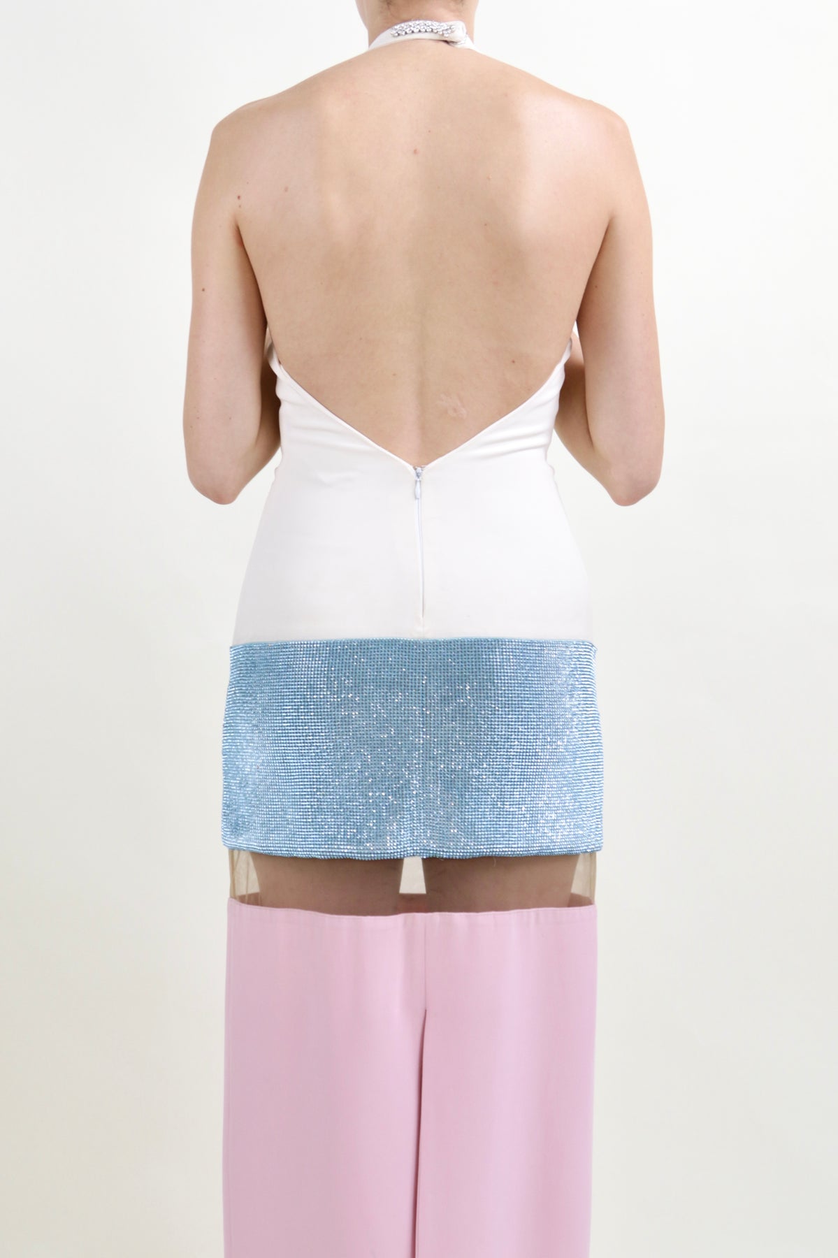 From the Versace Spring Summer 2015 collection, this vintage evening gown features large colorblock panels of white, blue, and pink with an additional sequin embellishment. A beige mesh panel cuts right underneath a blue rhinestone embellished skirt, creating the illusion of being a mini dress. It has a crystal embellishment at button neck closure.