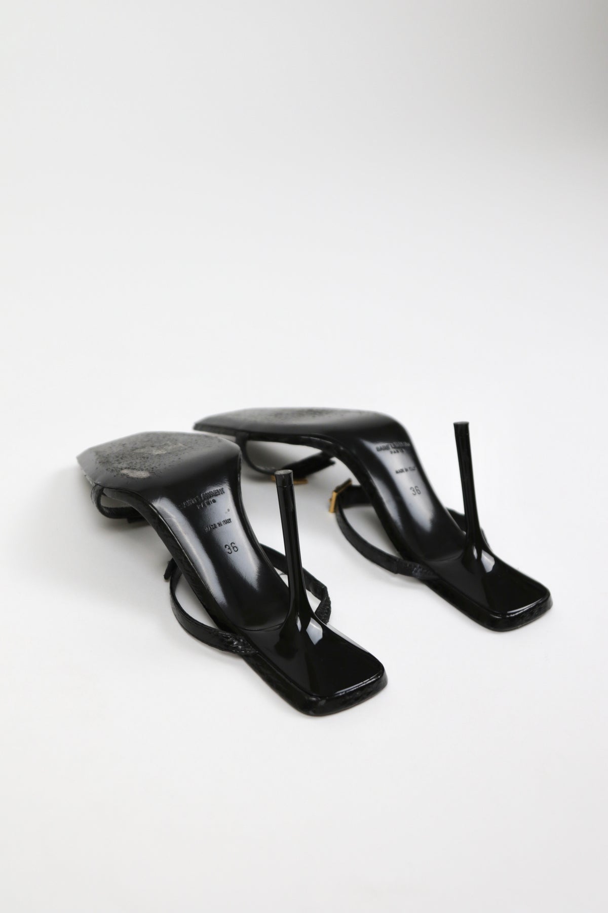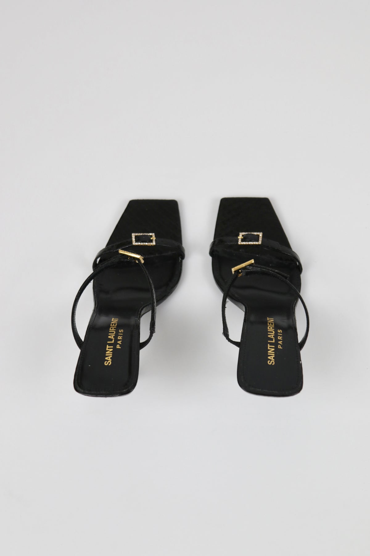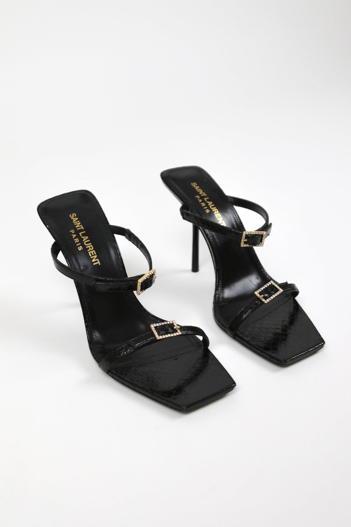 Slip-on buckle-detail mules from SAINT LAURENT featuring front buckle fastening, open toe, branded insole, mid heel, jet black, calf leather and ayers snakeskin.