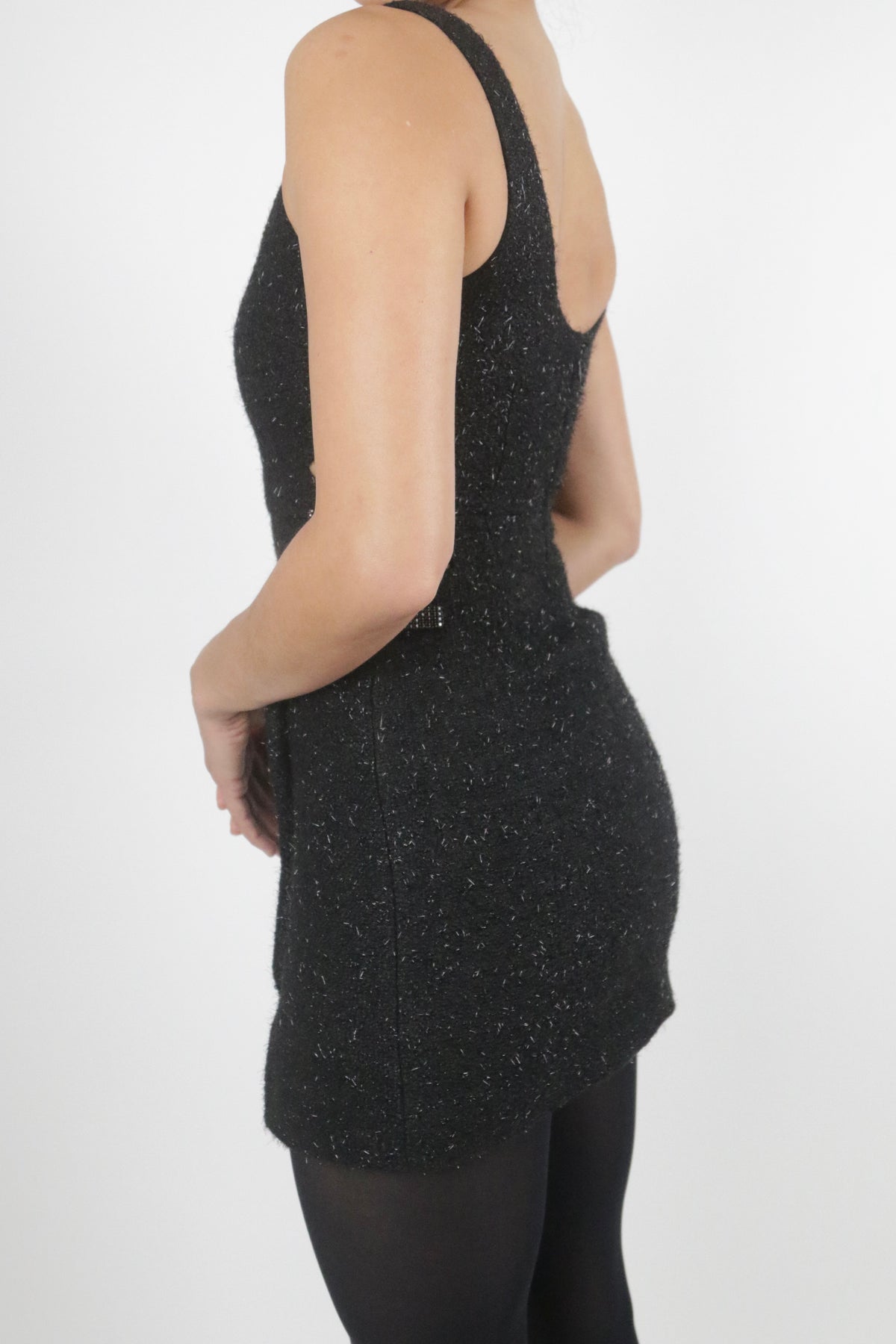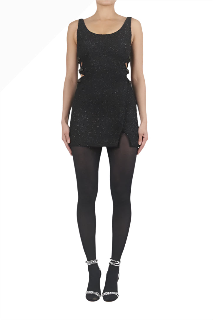 Black mini boucle dress with side cut-out details and bow crystal embellishments Double lined. Hidden back zipper closure.
