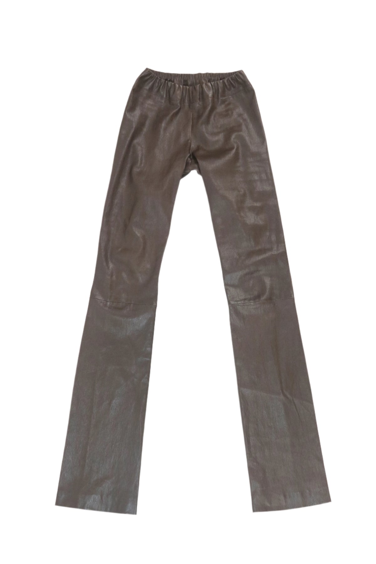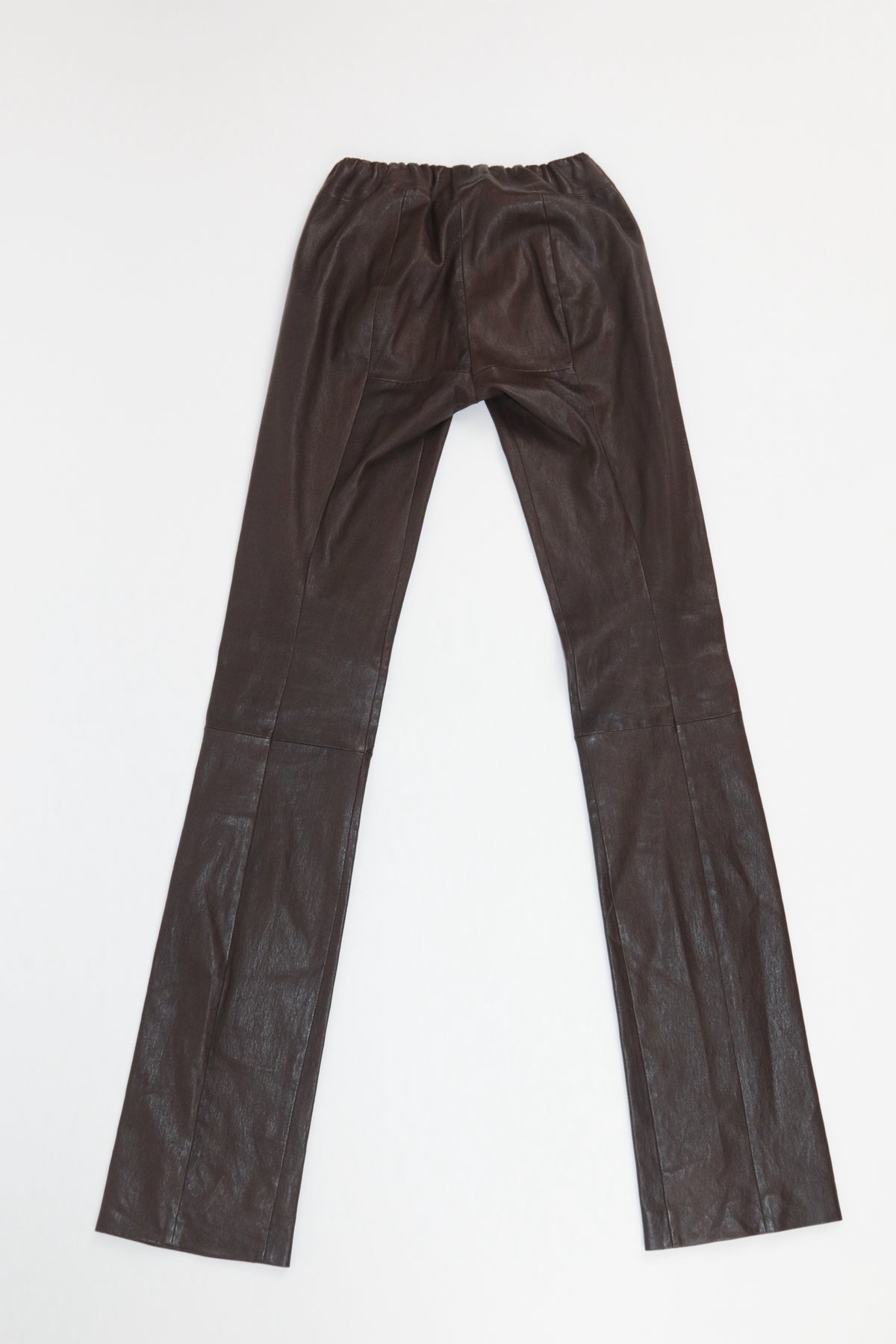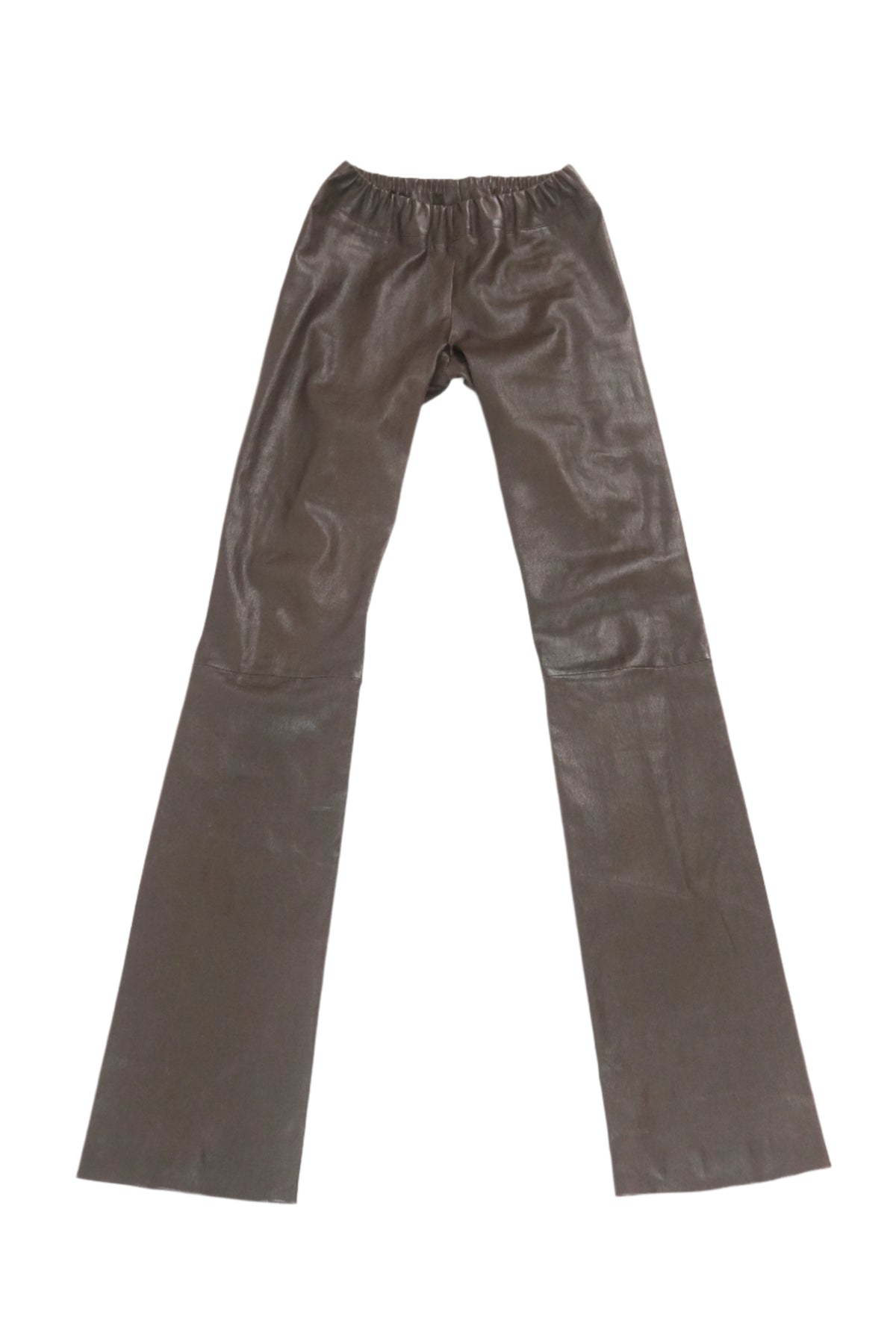 Elevate your wardrobe with these effortlessly sleek brown leather pants by the Row. Crafted from supple, high-quality leather, they feature a flattering high-waisted fit with an elastic waistband for comfort and ease of wear. The elongated flared legs add a touch of retro sophistication, making them a statement piece for any occasion.
