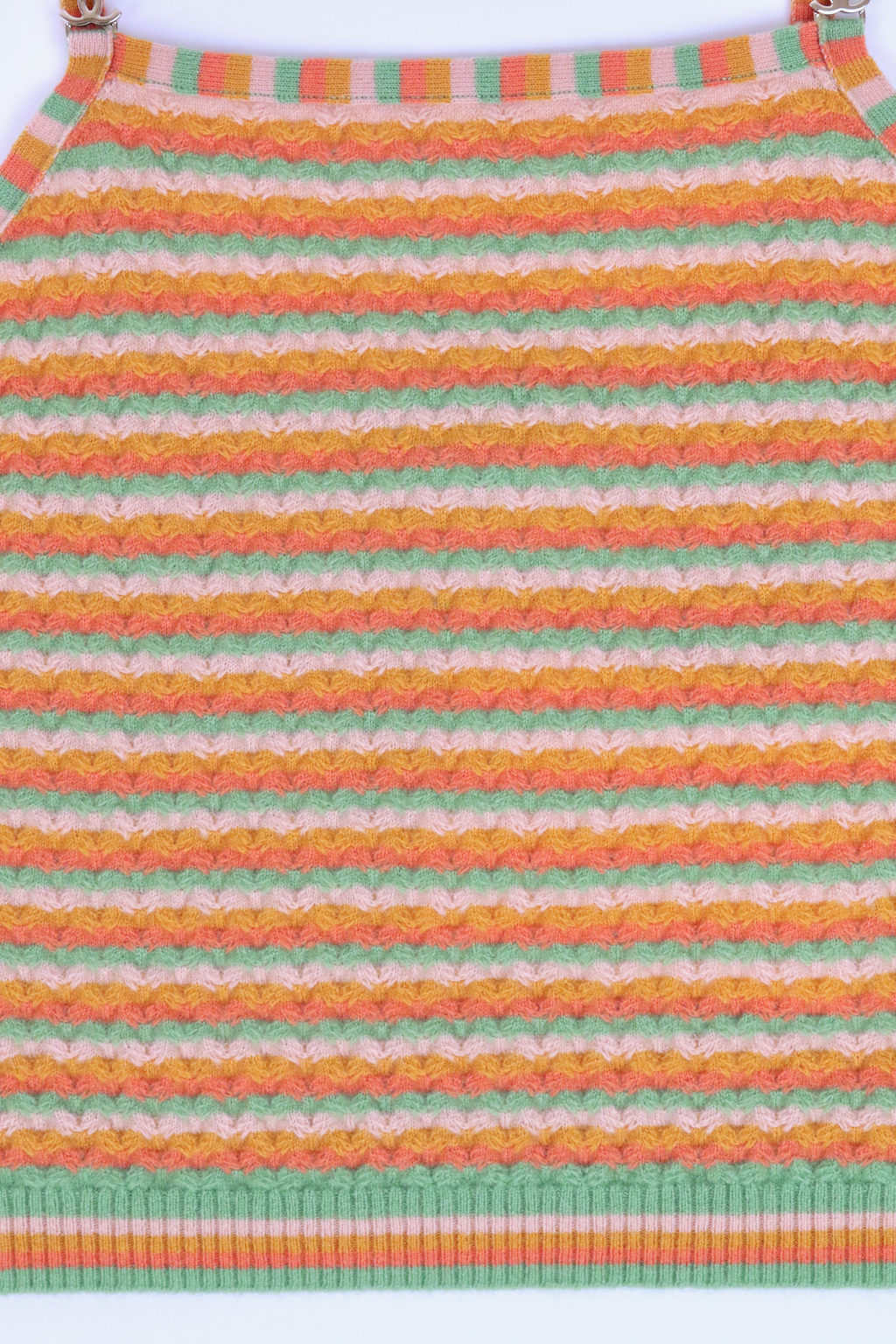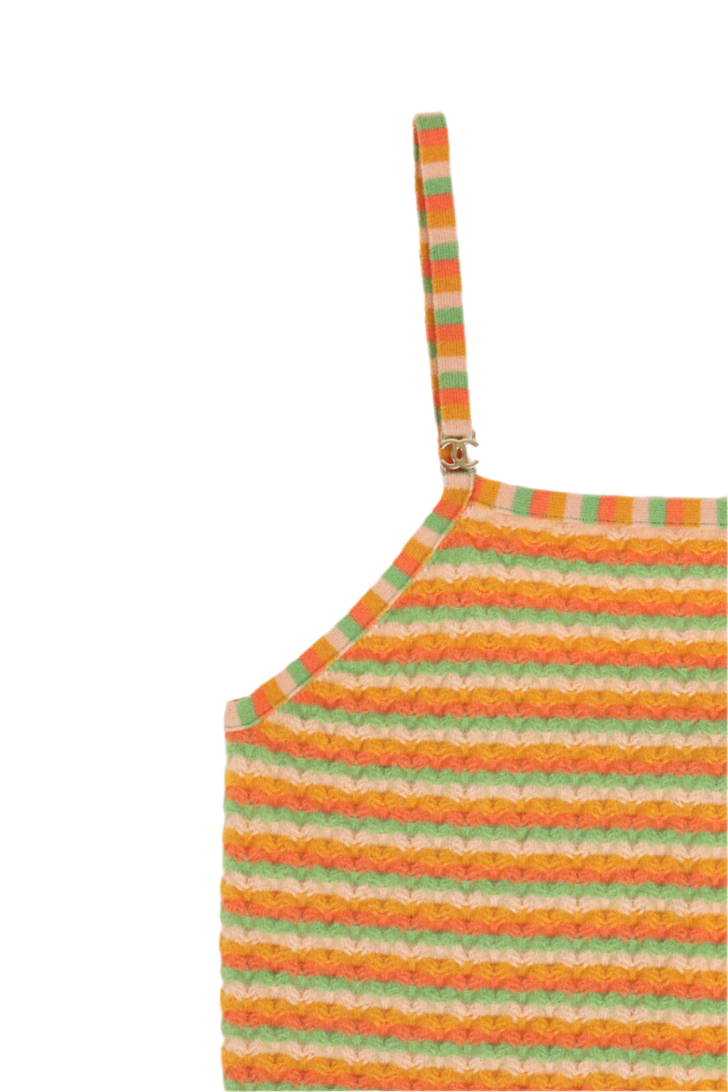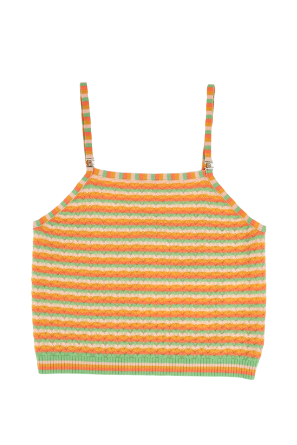From the Fall/Winter 2024 Collection. Add a playful yet luxurious touch to your wardrobe with this Chanel striped knit tank top. Crafted from a soft cashmere blend, this piece features a vibrant multicolor striped pattern in warm orange, soft green, and pastel yellow hues. The delicate spaghetti straps with champagne-tone CC logo hardware add a refined detail, making it both stylish and comfortable. Perfect for layering or wearing on its own, this versatile tank embodies effortless Parisian chic. A must-have for your spring and summer collection. Made in Italy.