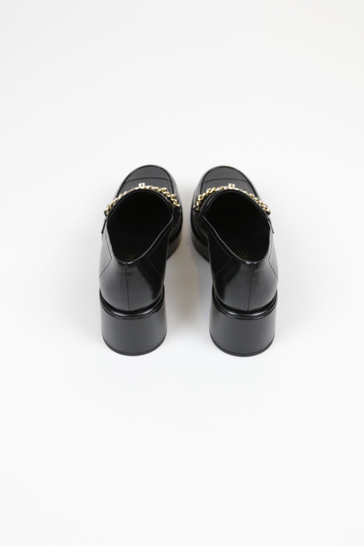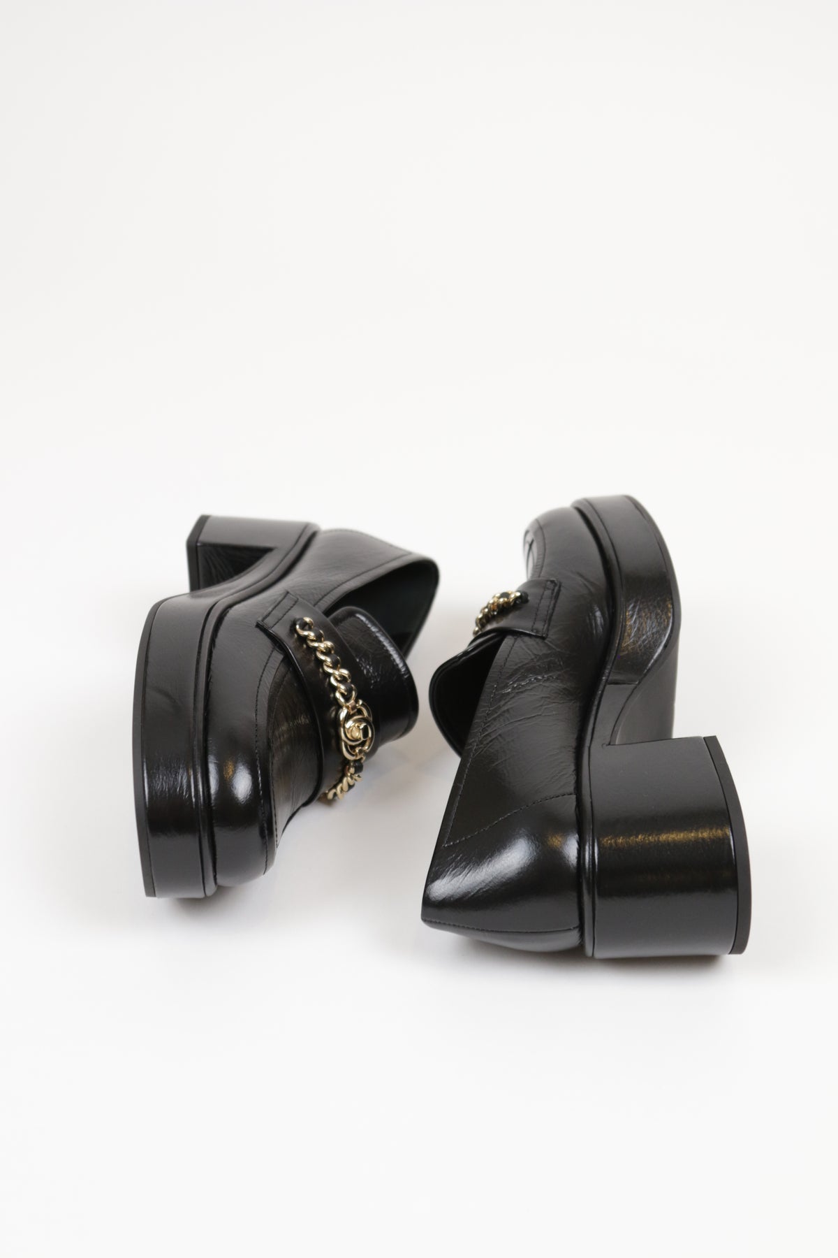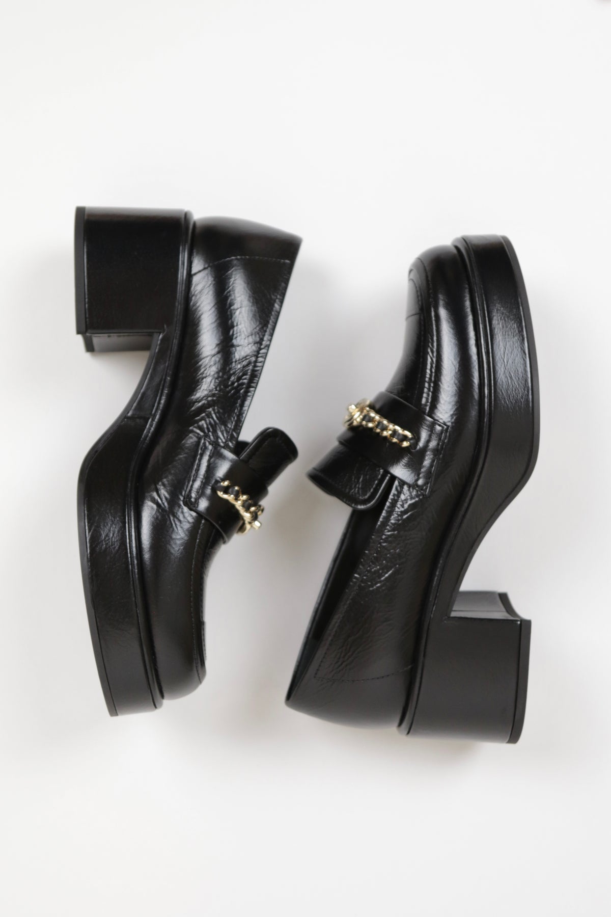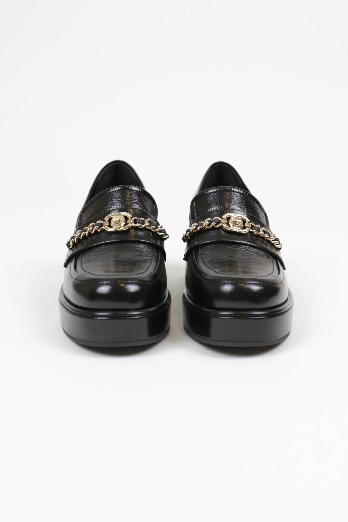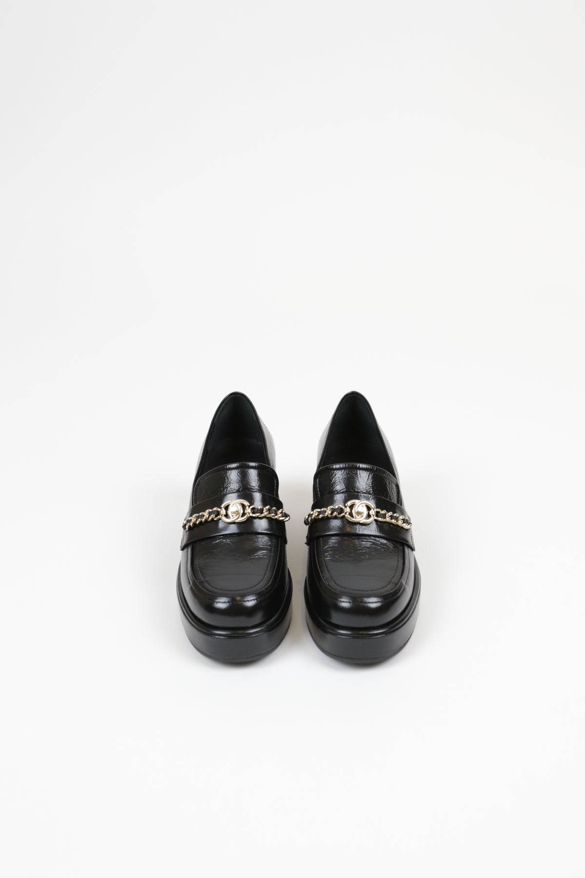 From the Fall/Winter 2024 collection. Elevate your footwear collection with these classic Chanel black leather loafers, featuring a timeless silhouette with a modern edge. Crafted from luxurious textured black leather, these loafers are adorned with the signature gold-tone chain and interlocking CC logo, adding a touch of sophistication. The chunky block heel provides both style and comfort, making them perfect for all-day wear. Whether paired with tailored pieces or casual ensembles, these Chanel loafers exude effortless Parisian chic. Made in Italy.