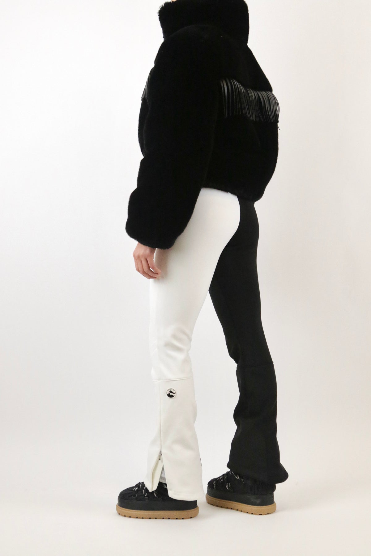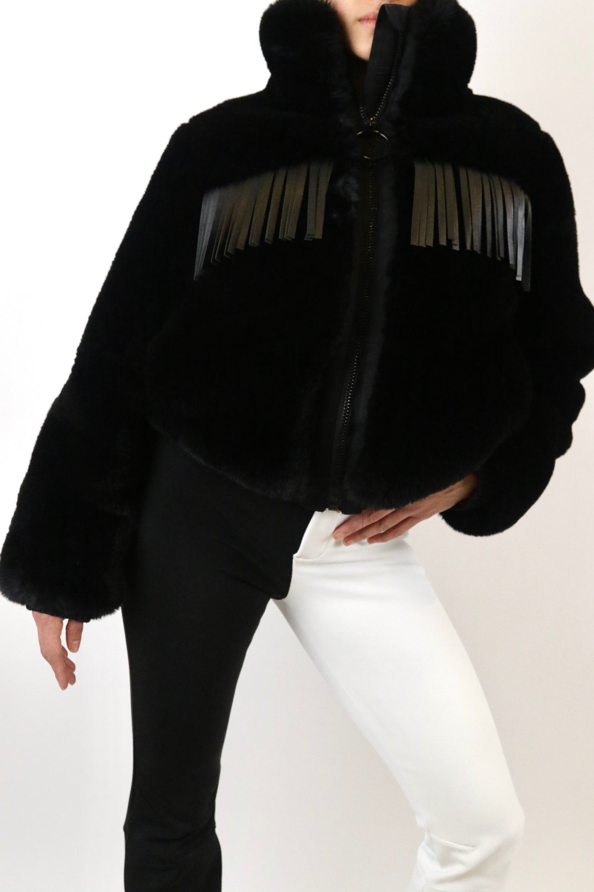 This black snow jacket blends warmth, style, and durability, ensuring you’re ready for wintry escapades with confidence. Crafted from plush materials and trimmed with sleek leather fringe detailing, it offers a striking balance of coziness and edge. With its weather-resistant construction and easy zip closure, it’s an essential layer for both the slopes and après-ski activities.