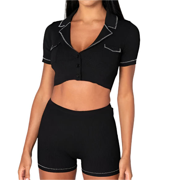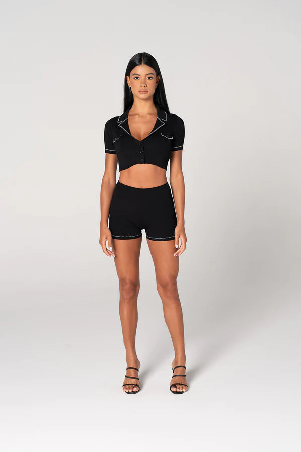 Black ribbed set with white contrast stitching detail. Crop top and shorts feature matching pockets. Front button closure. Midweight stretch knit fabric. Sold as a set.