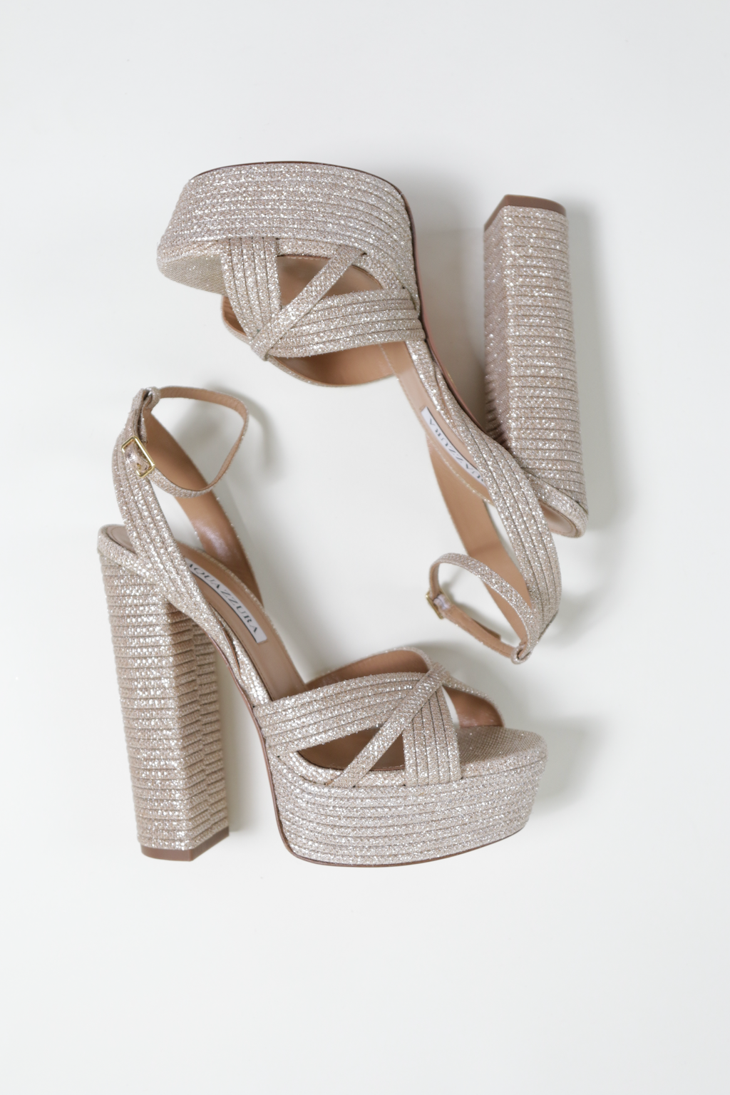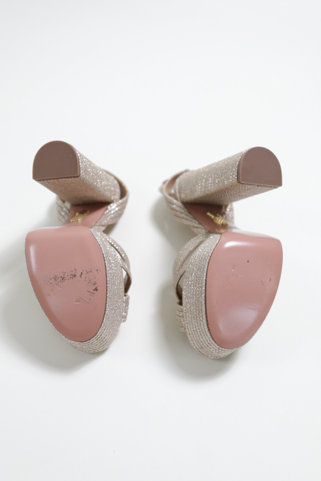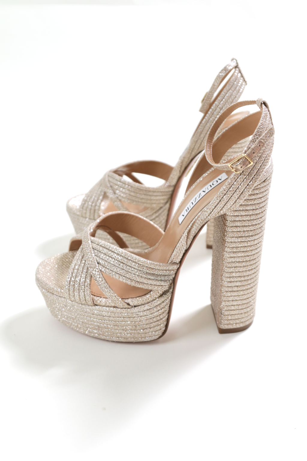 The adjustable ankle strap ensures a secure fit, while the textured glitter detailing adds a touch of vintage-inspired luxury. Perfect for red-carpet events, weddings, or a statement night out, these Aquazzura heels exude effortless elegance with a touch of disco-era glamour.