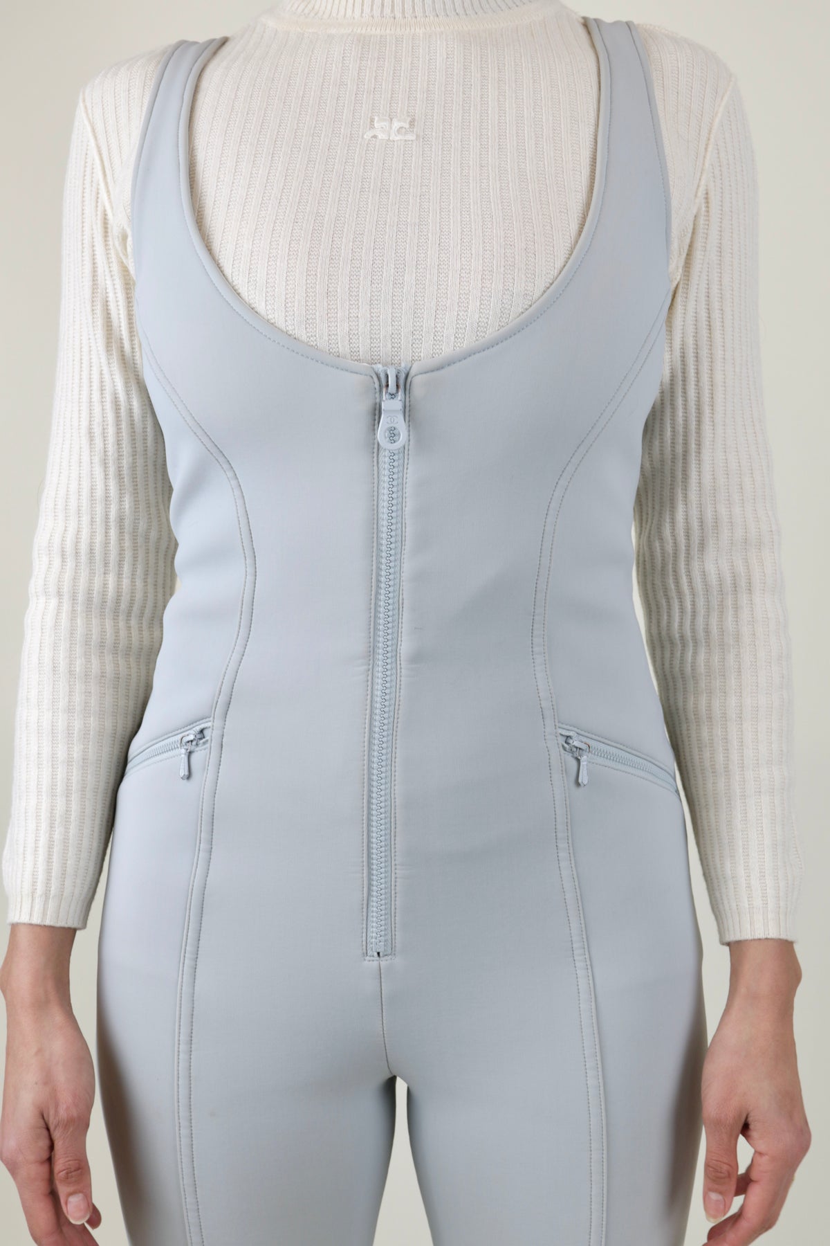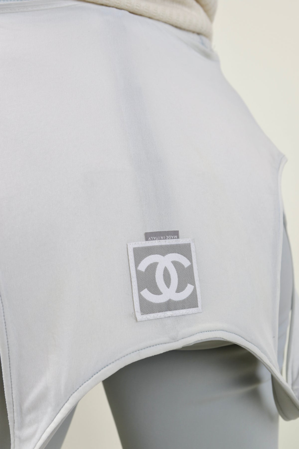 It does not get better than this vintage Chanel snow suit. It features a full frontal zipper with a low neck, a large grey and white CC logo on the back, pant sleeves with "CHANEL" written on the inner elastic band, and side zippers at the hem of the pants. Pair it with your favorite snow thermal or chunky sweater for the ultimate look.